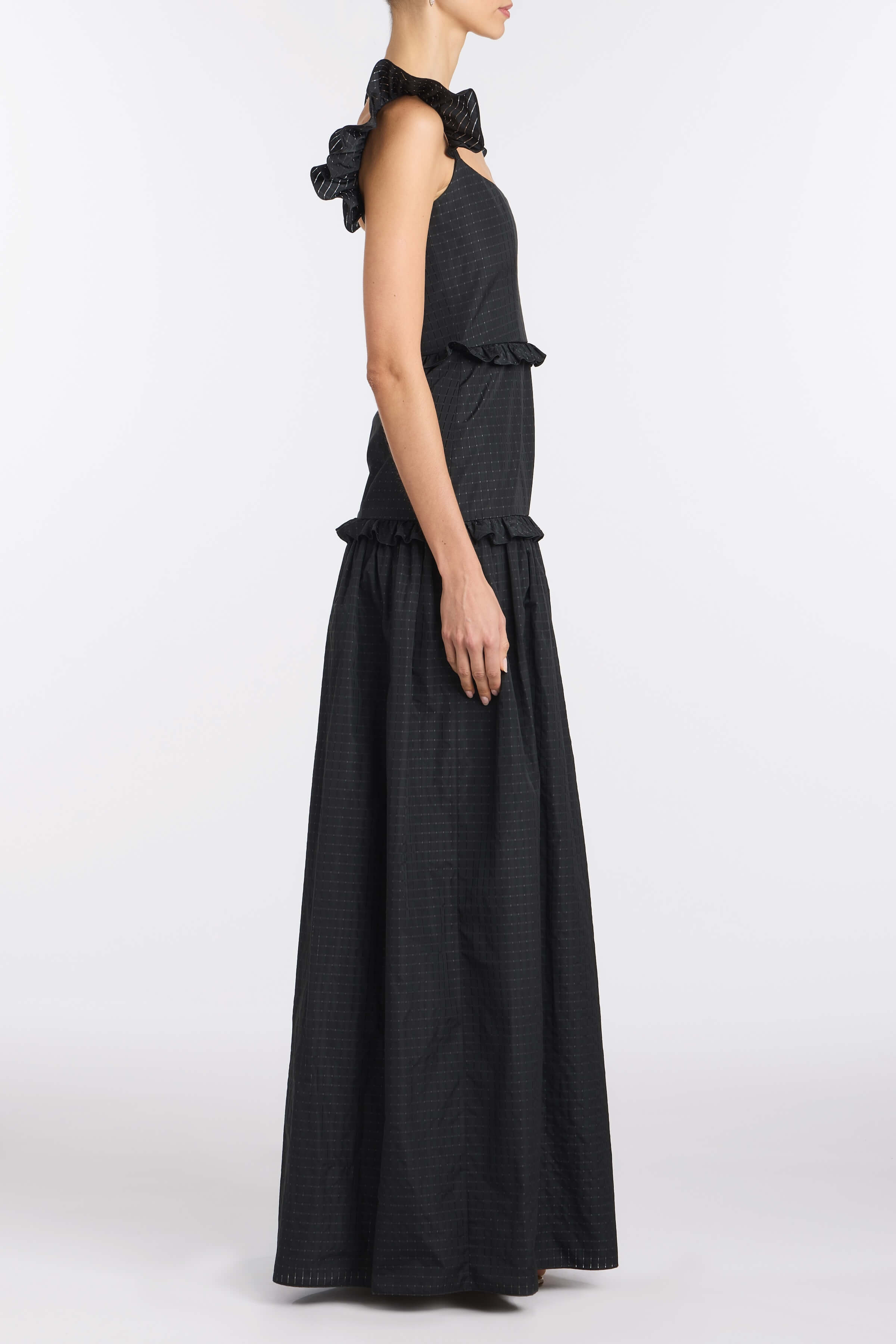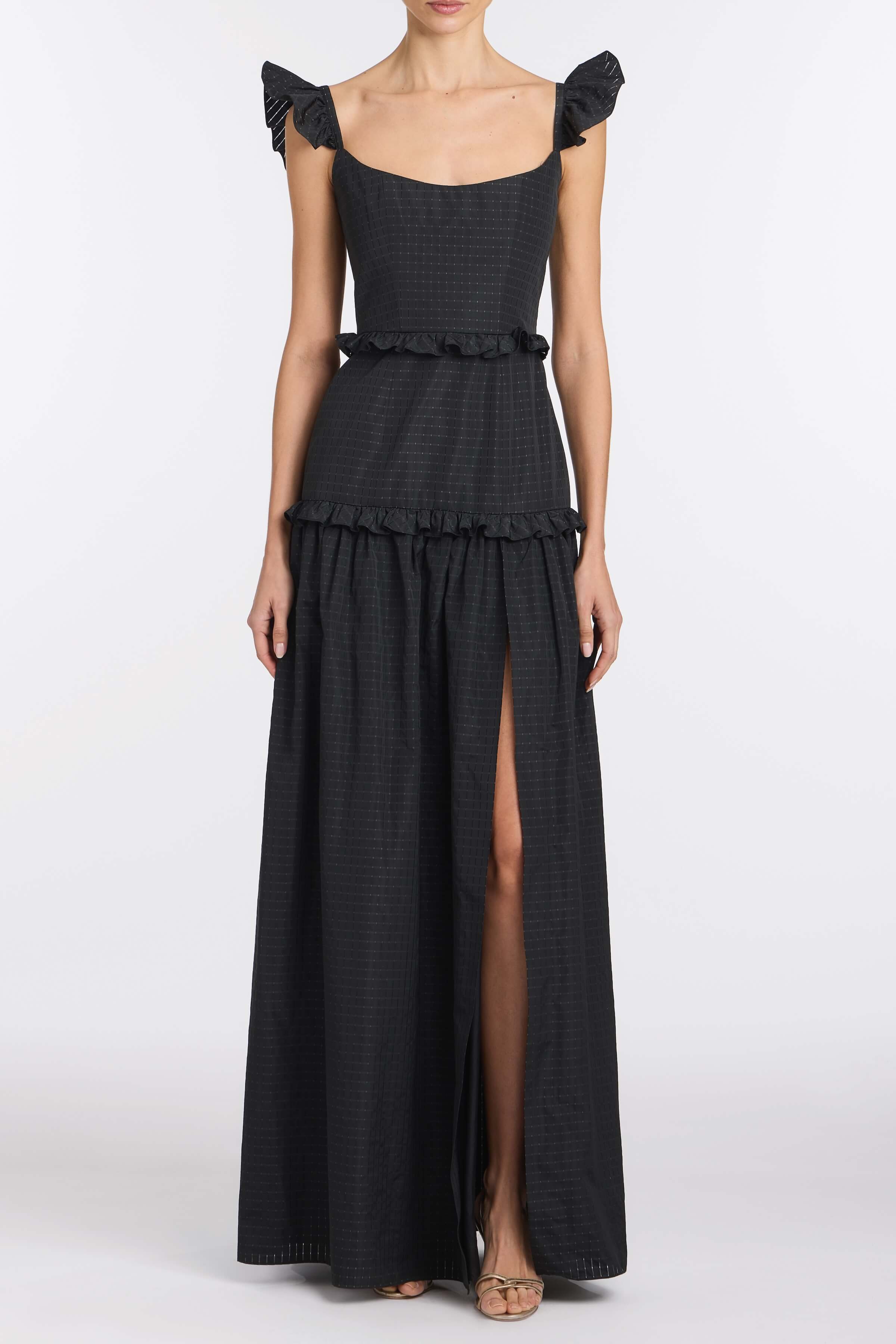 PRE-ORDERAlanna Black Gingham Taffeta Ruffle Tiered Gown