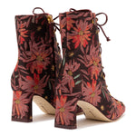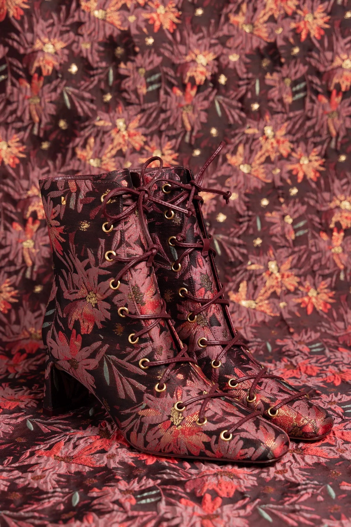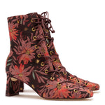 The Alexis boot is reimagined in a rich brocade, featuring warm tones and subtle metallic threads that bring dimension and light to the autumn floral pattern. The mid-calf height, comfortable block heel, and front lacing create a flattering, distinctive silhouette that transitions effortlessly from day to night.