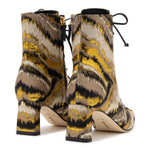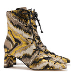 The Alexis boot is reimagined in a striking brocade, blending earthy neutrals with metallic gold threads that create movement, depth, and a hint of drama. The mid-calf height, structured block heel, and front lacing shape a refined, sculptural silhouette that stands out from day to night.