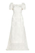 - Puff sleeve midi dress with watteau train in white floral jacquard