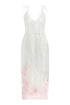 - French floral lace midi dress with hand cut scalloped hem and organza overlay with soft pink hand beaded chrysanthemum floral detail