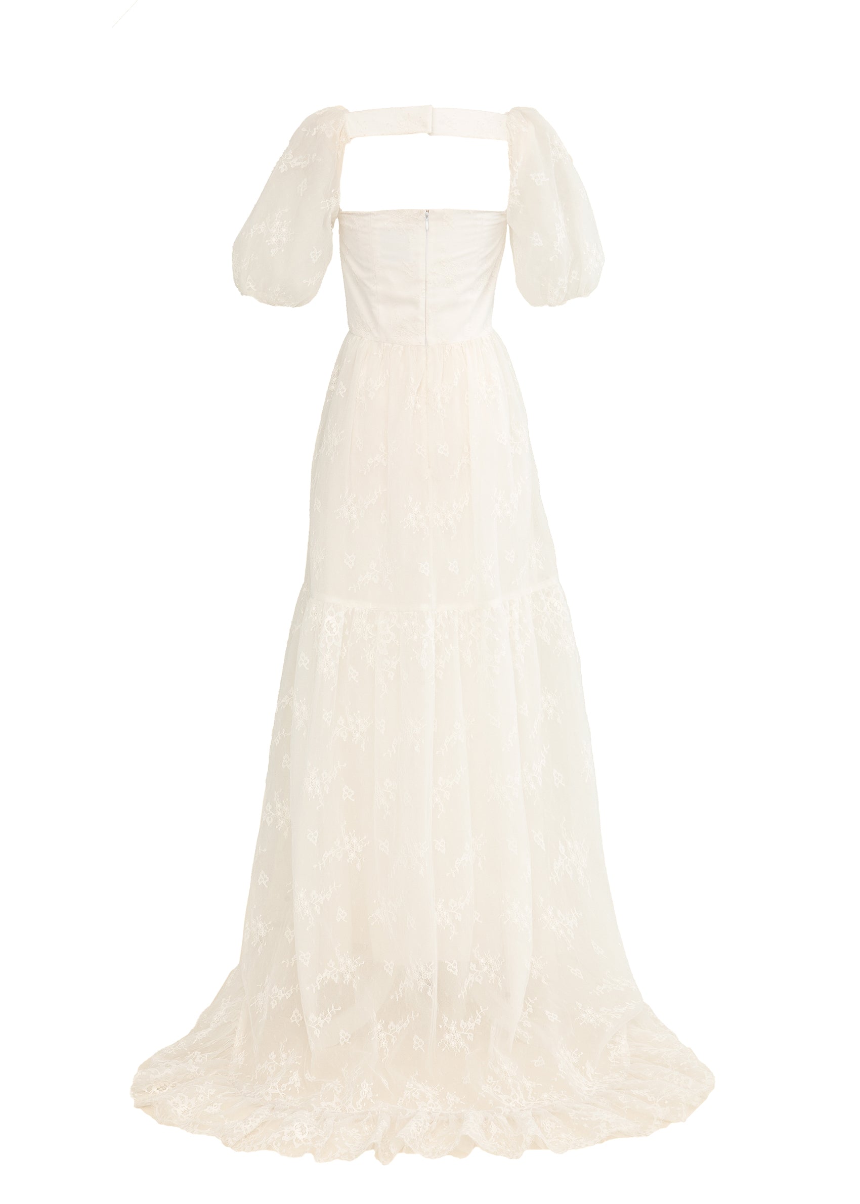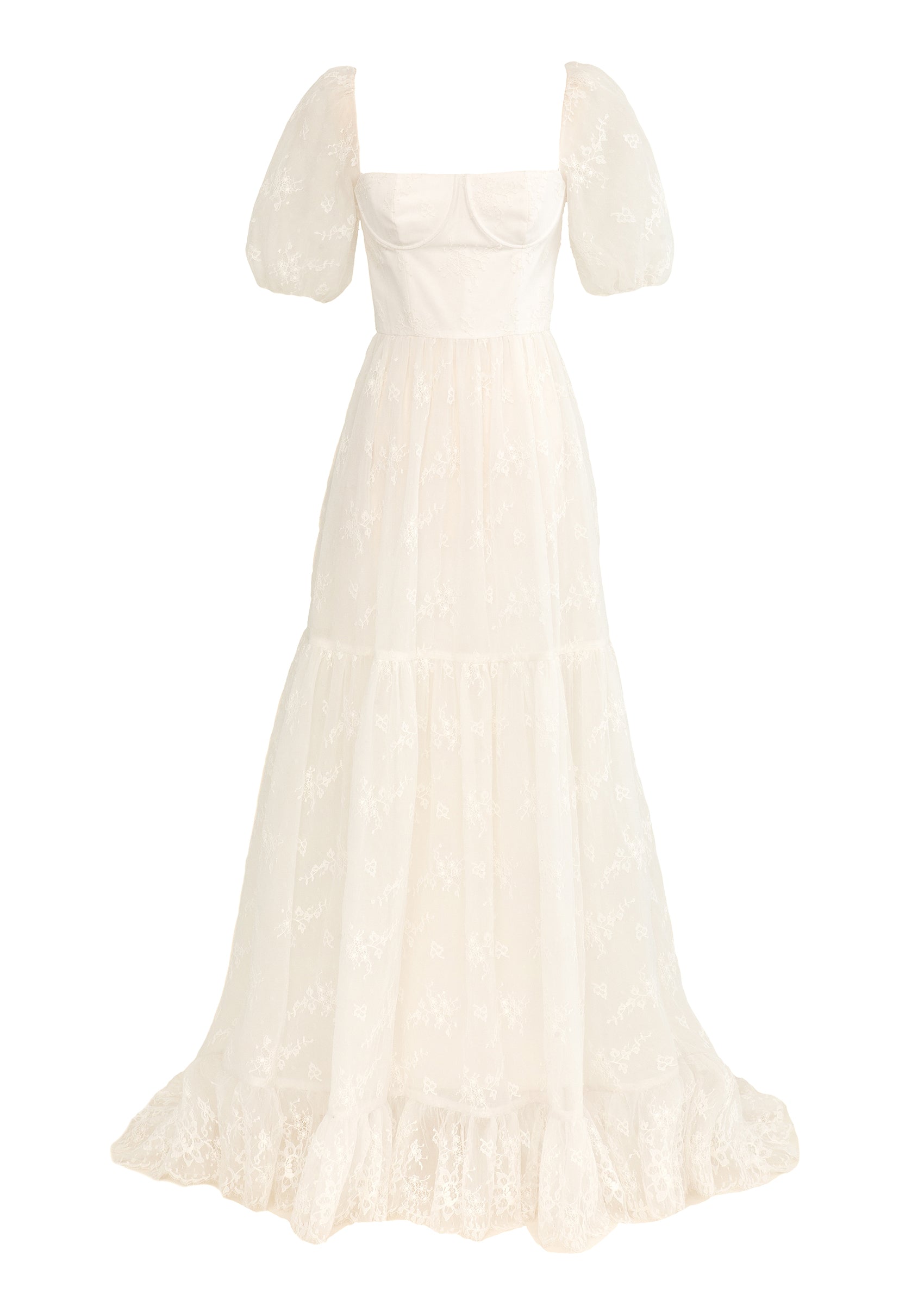 - Fitted bodice, puff sleeves, tiered skirt, boning throughout bodice, fully lined
