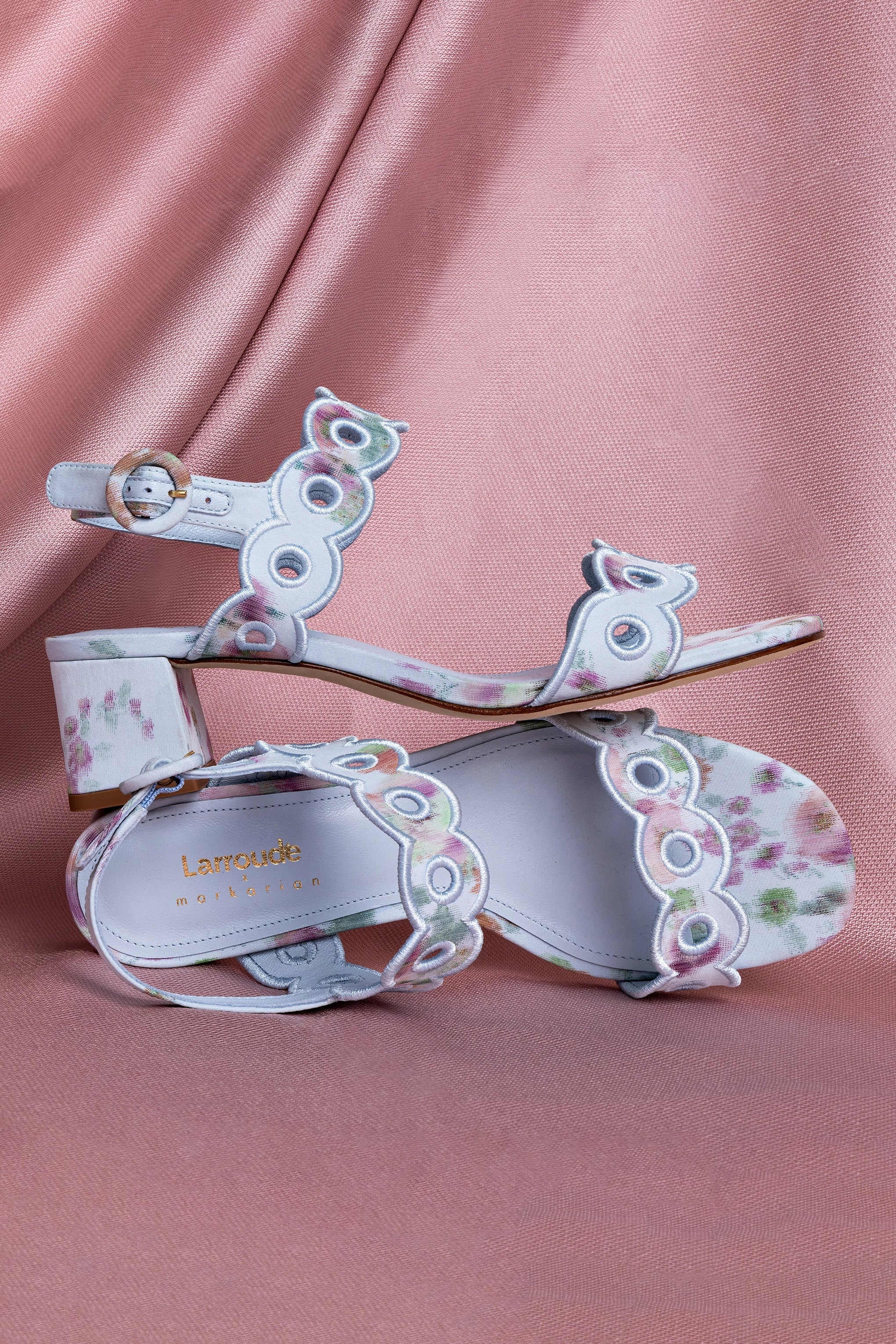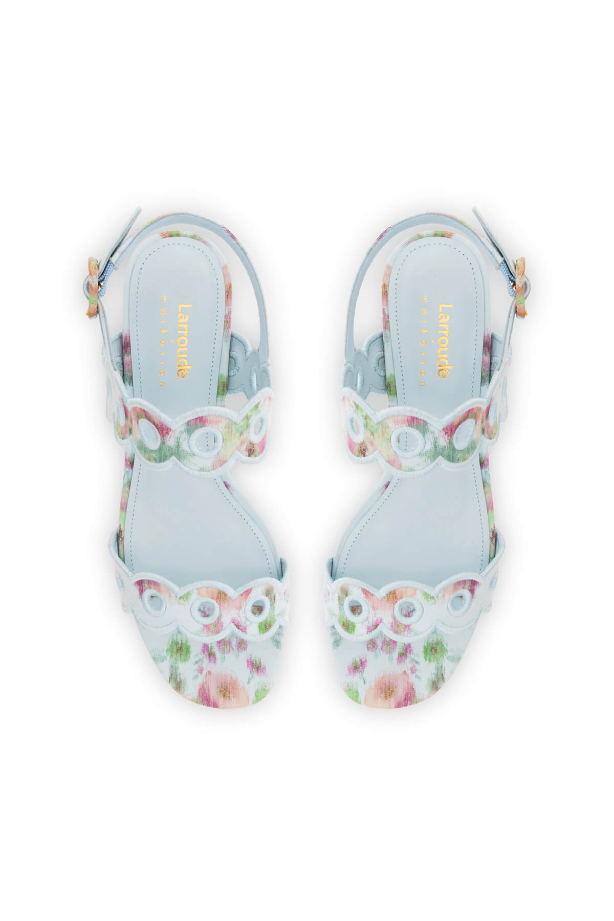 As part of our ongoing partnership with Larroudé—we are excited to present this romantic reimagining of their signature Florence sandal silhouette, updated with a beautiful ikat fabric and a sweet broderie trim.