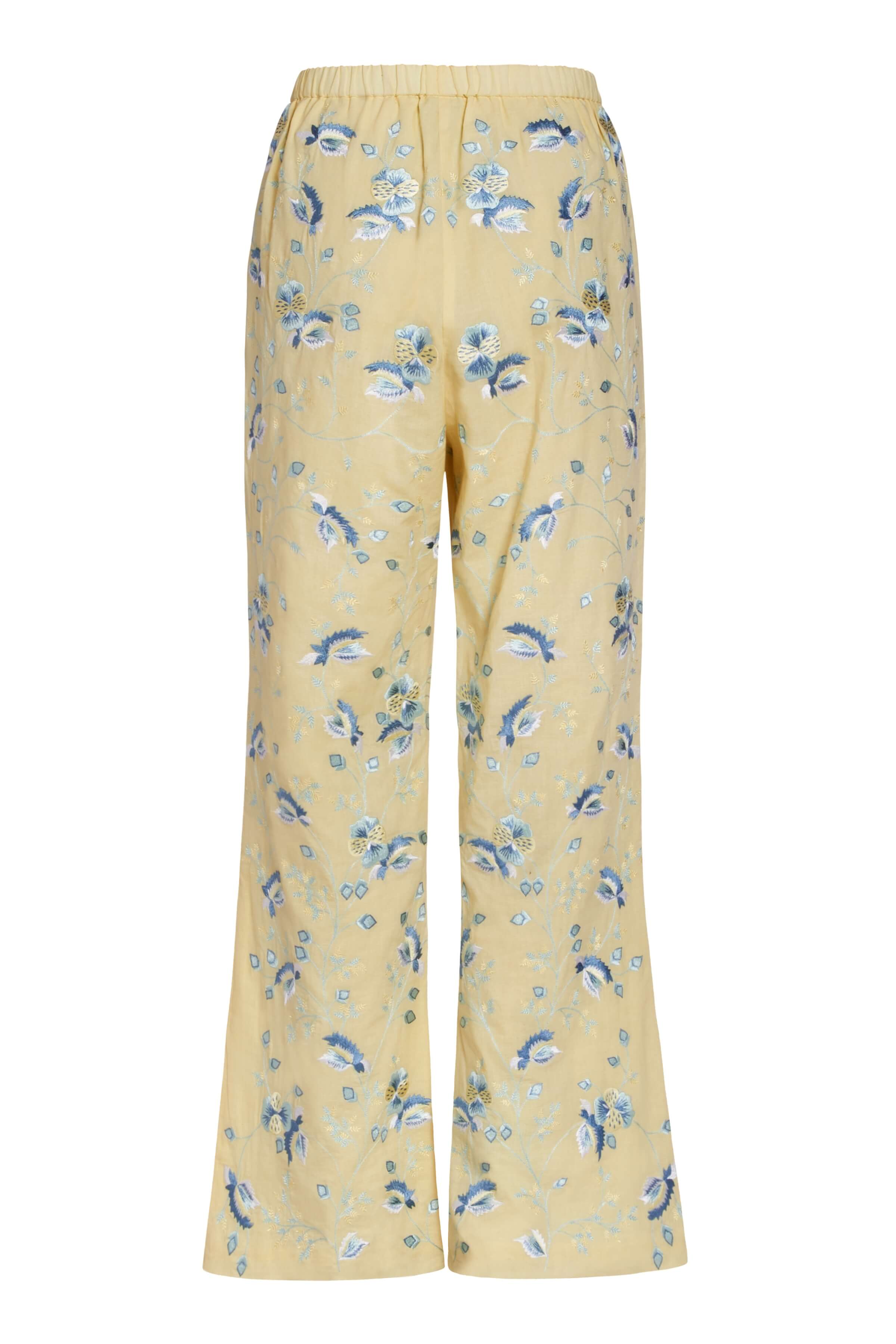 - Buttercream blue floral pansy embroidered cotton cropped pull-on pant with elastic waist band, fully lined