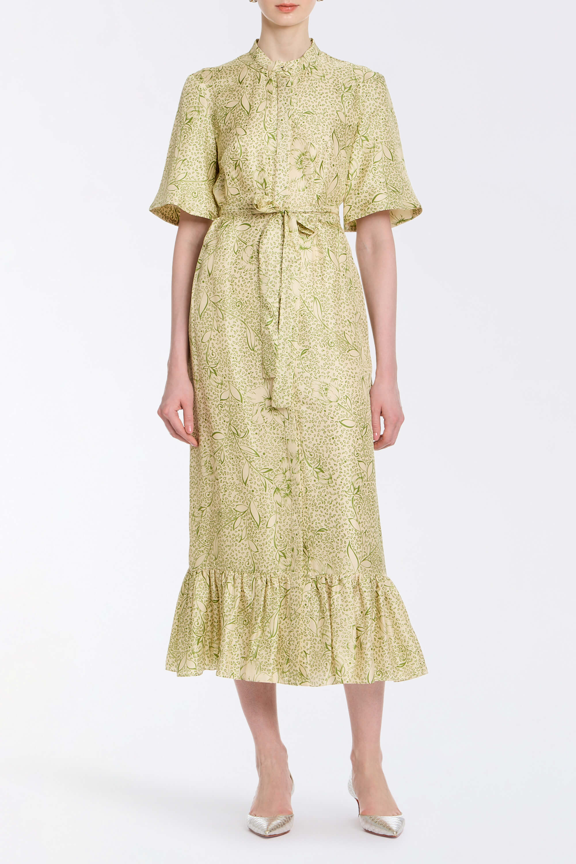 - Button down midi dress with ruffle hem and self tie belt, fully lined