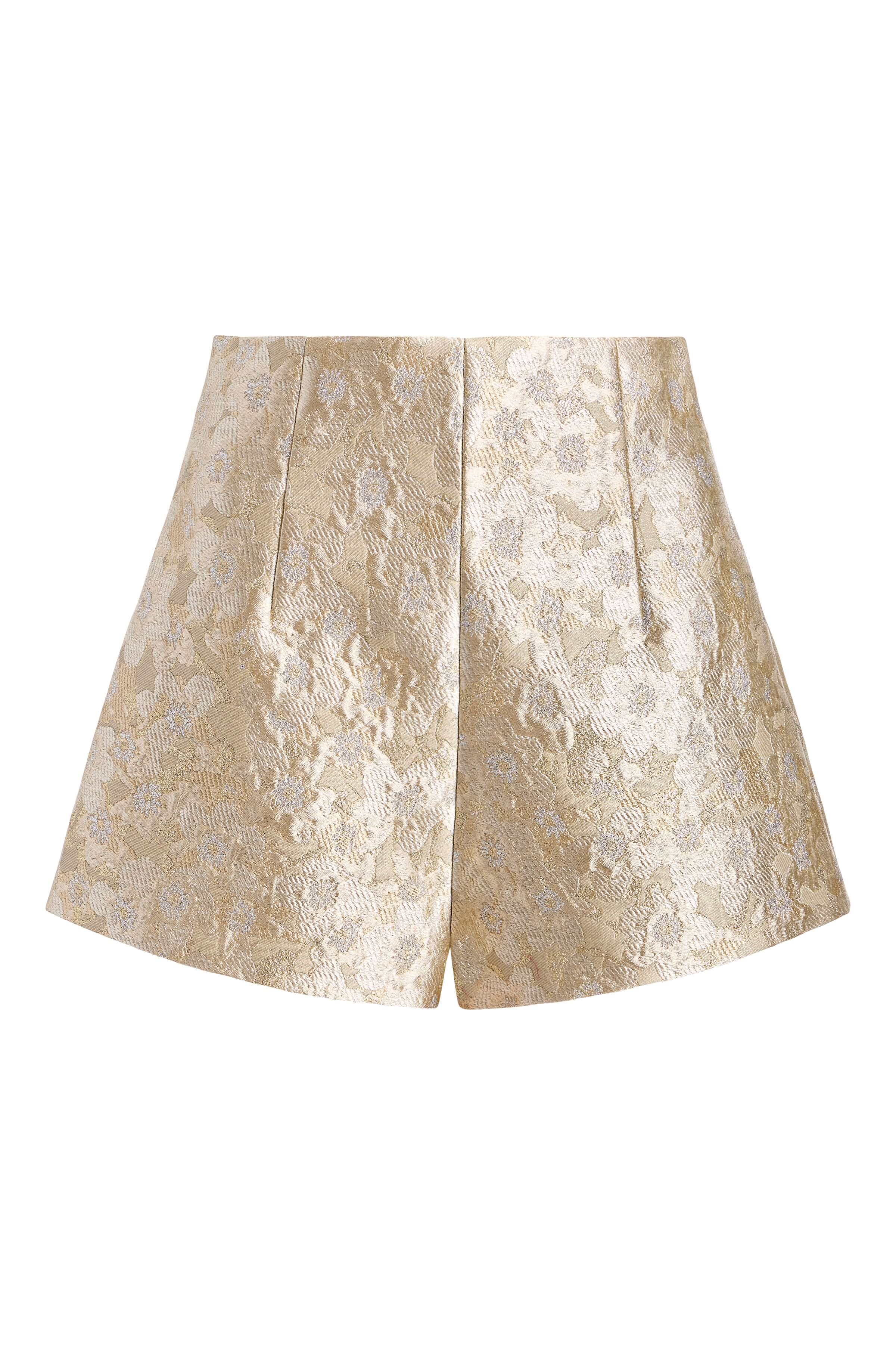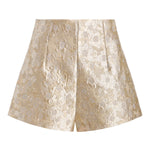 - Silver metallic brocade high-waisted mini shorts. Fully lined with invisible zipper on the back.