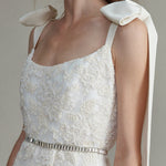 - Corset bodice, extended silk faille bows at the strap, and sweeping silk faille train from the mid back, fully lined