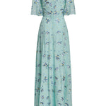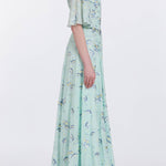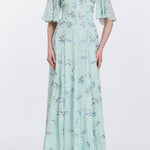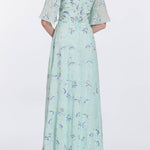 Light blue embroidered pansy full length a-line flutter sleeve gown, fully lined