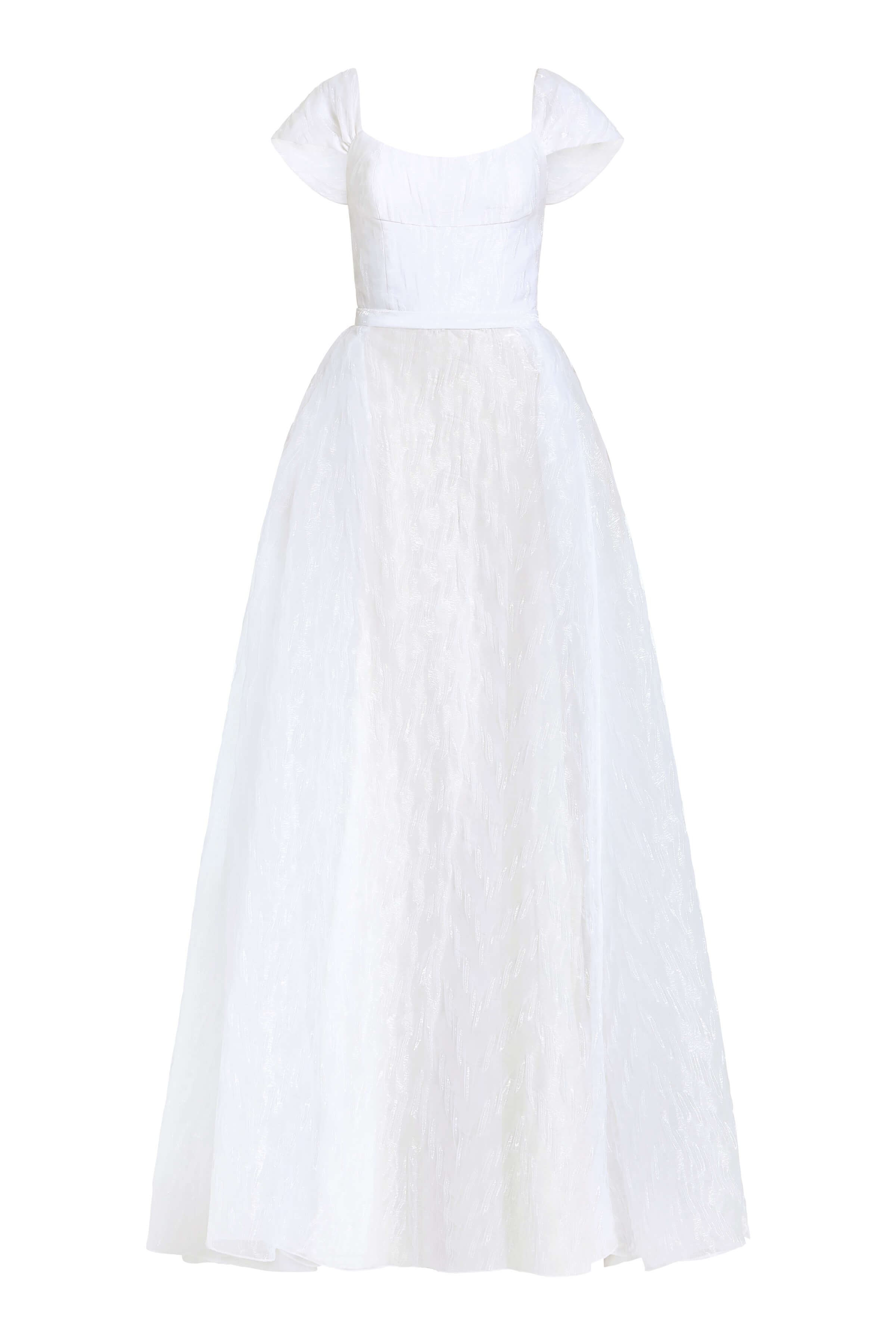 - Iridescent organza soft scoop neck gown with capelet sleeve and pleated side detail, fully lined