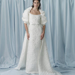 - Off-white textured floral jacquard puff sleeve bridal duster with train, fully lined