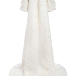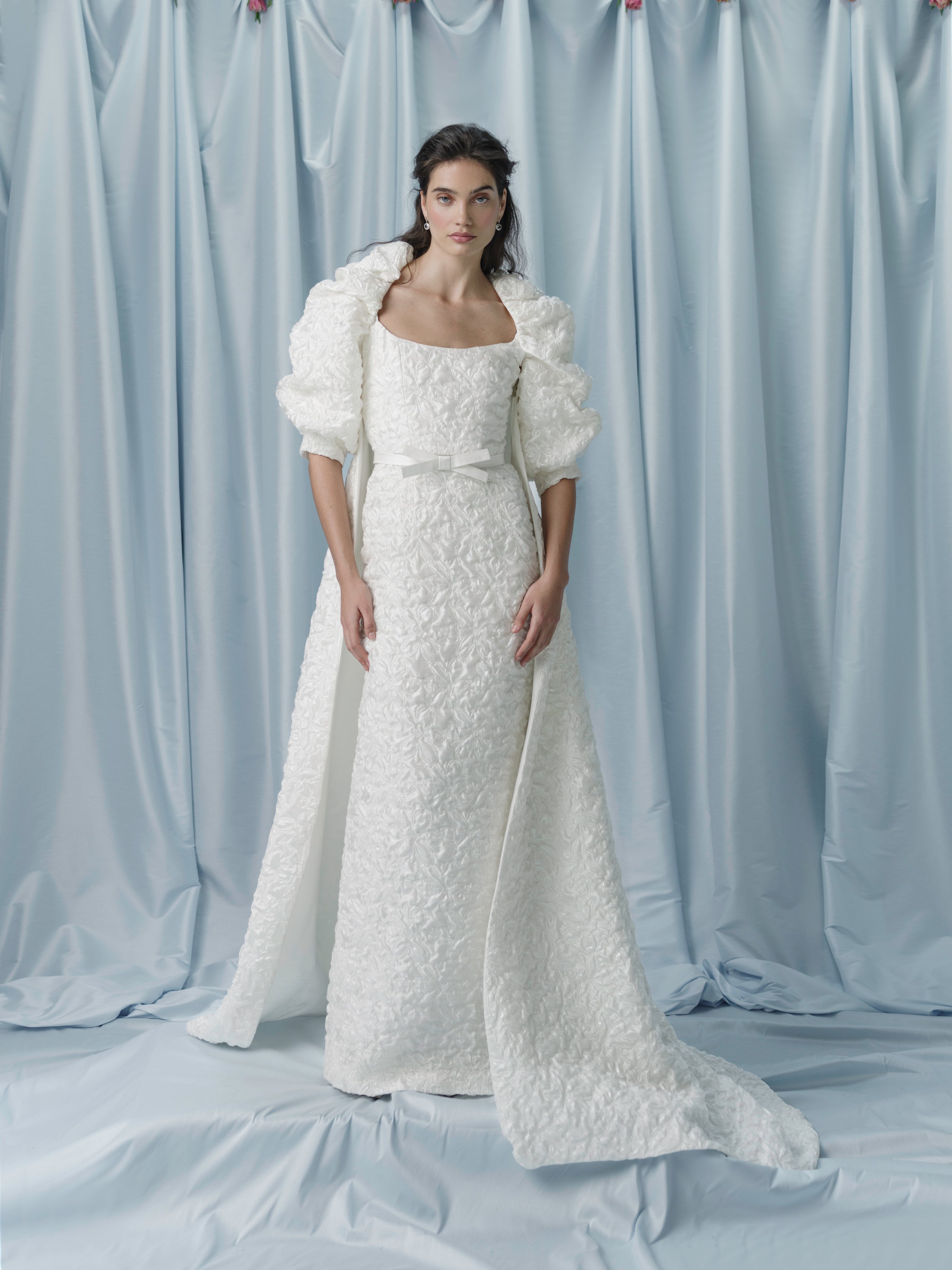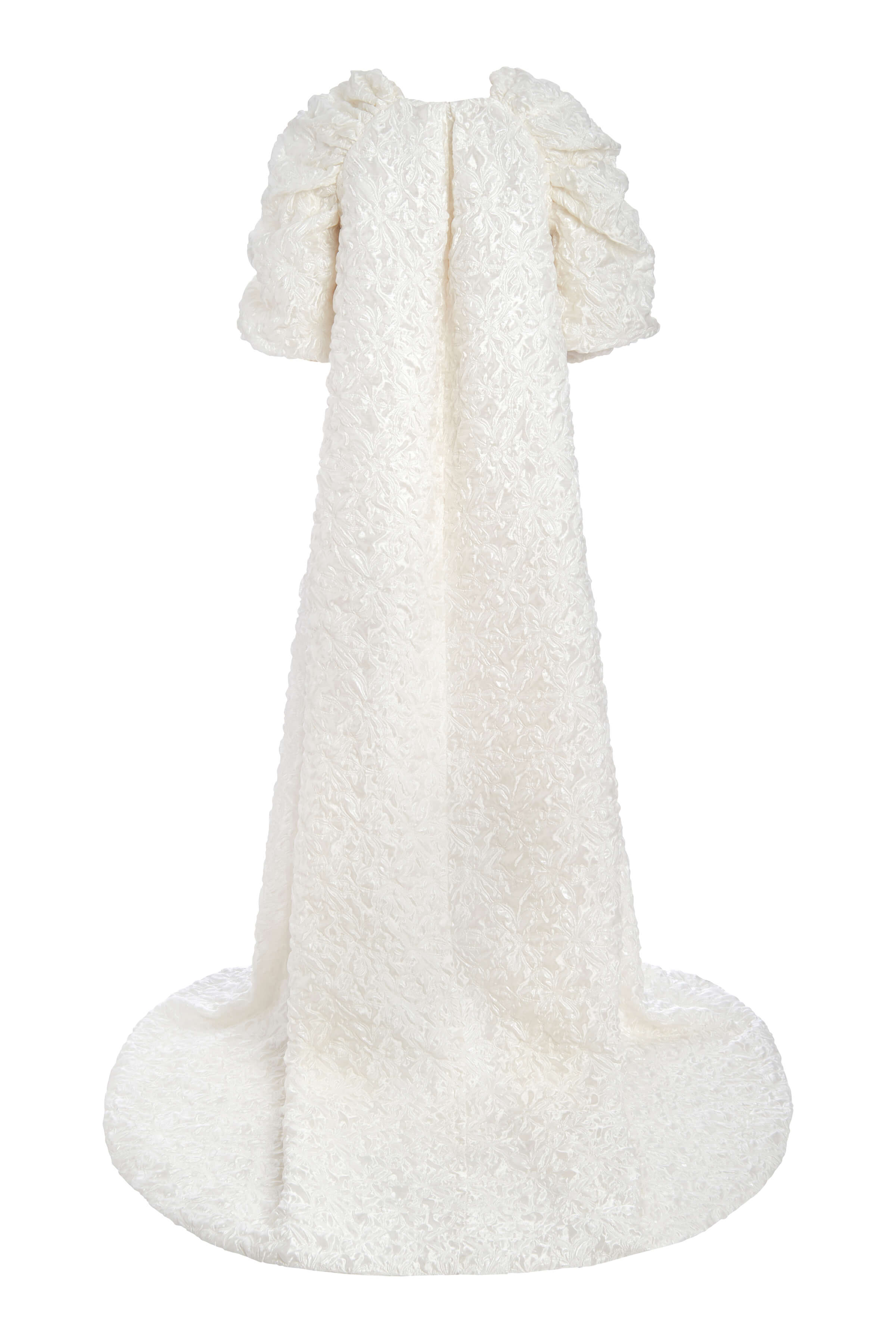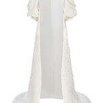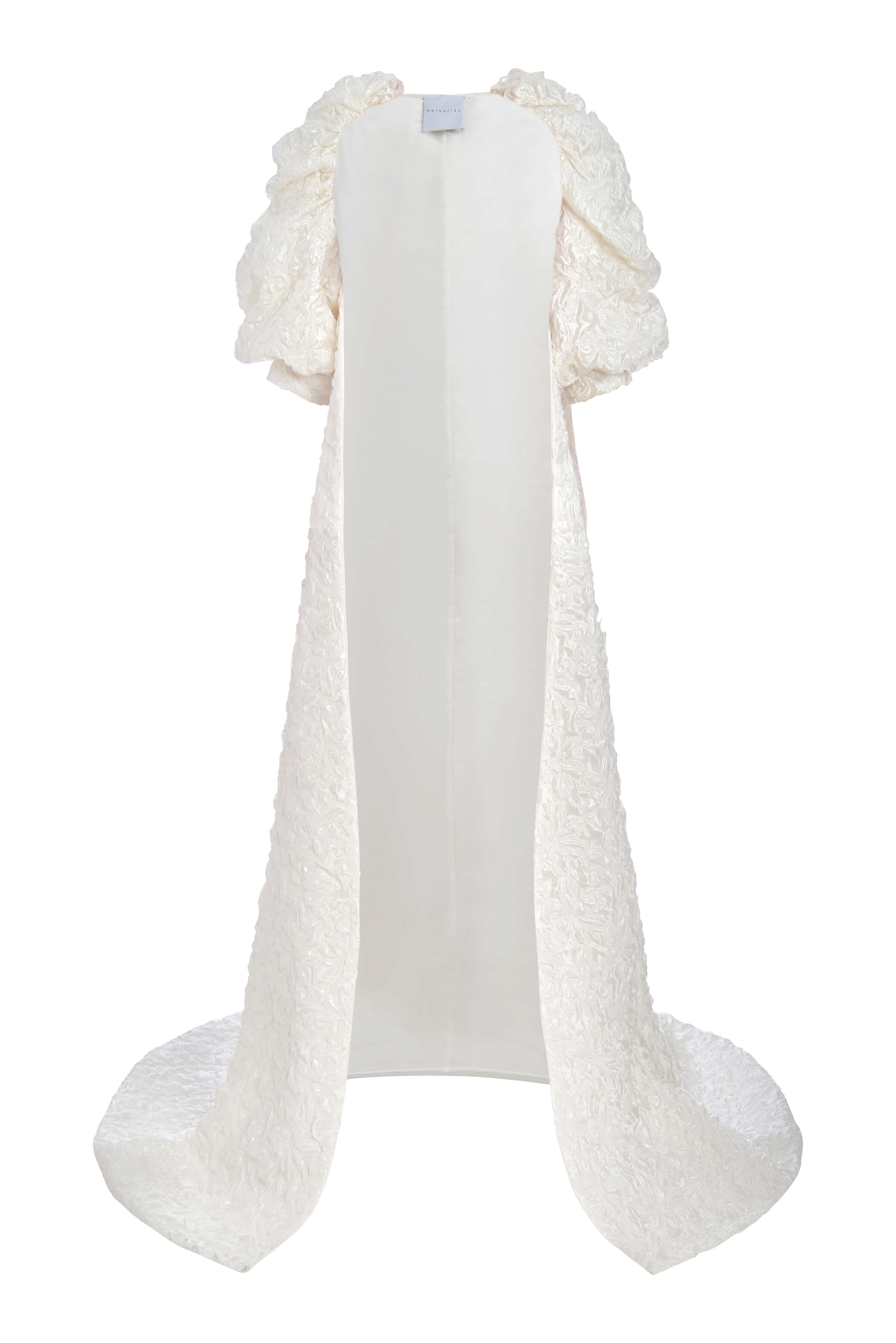 - Off-white textured floral jacquard puff sleeve bridal duster with train, fully lined