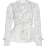 - Off-white floral satin jacquard peplum jacket with bow cuff detail, fully lined
