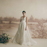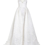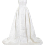 - Off-white floral satin jacquard v-neck sleeveless gown with train, fully lined