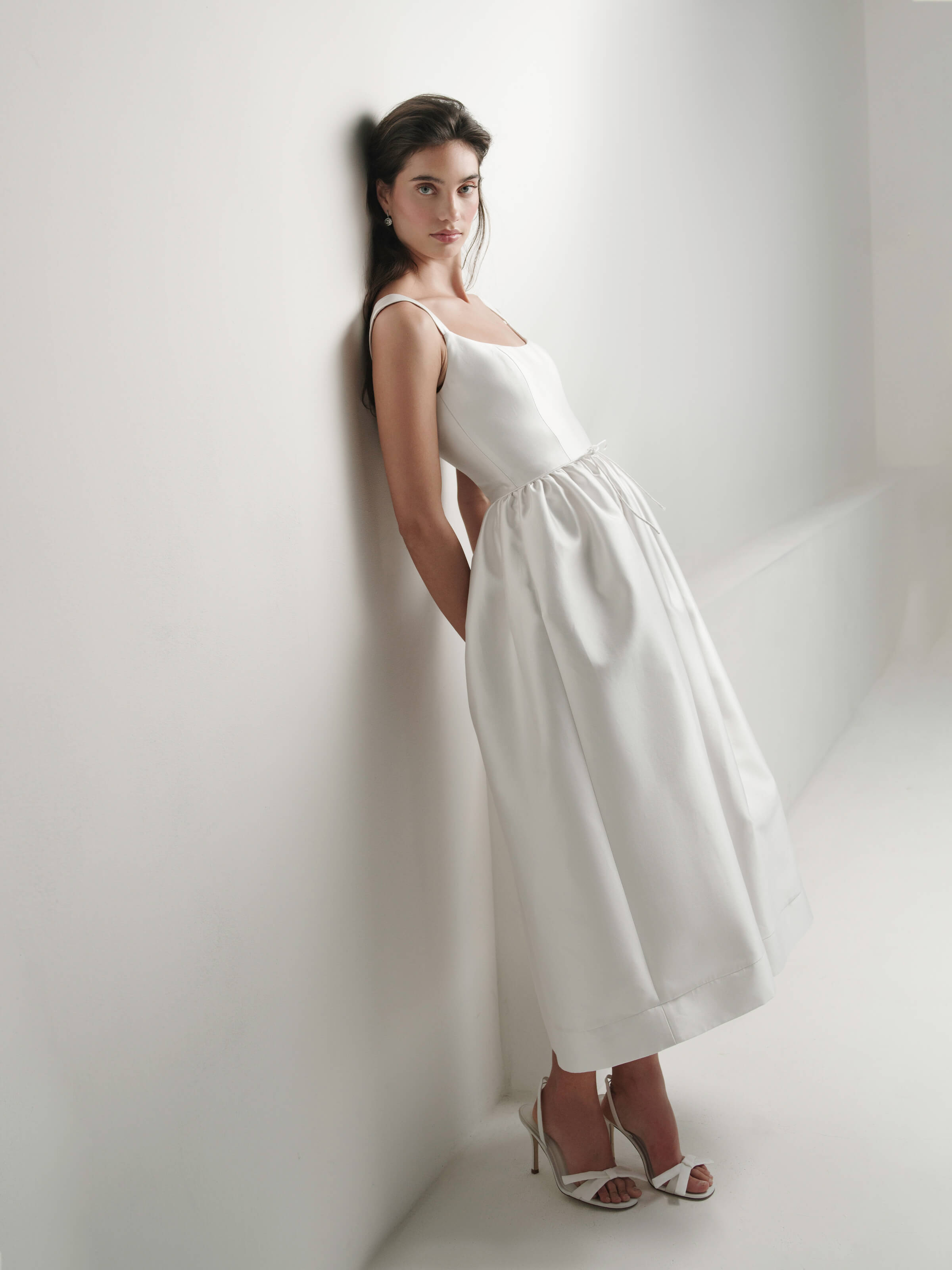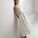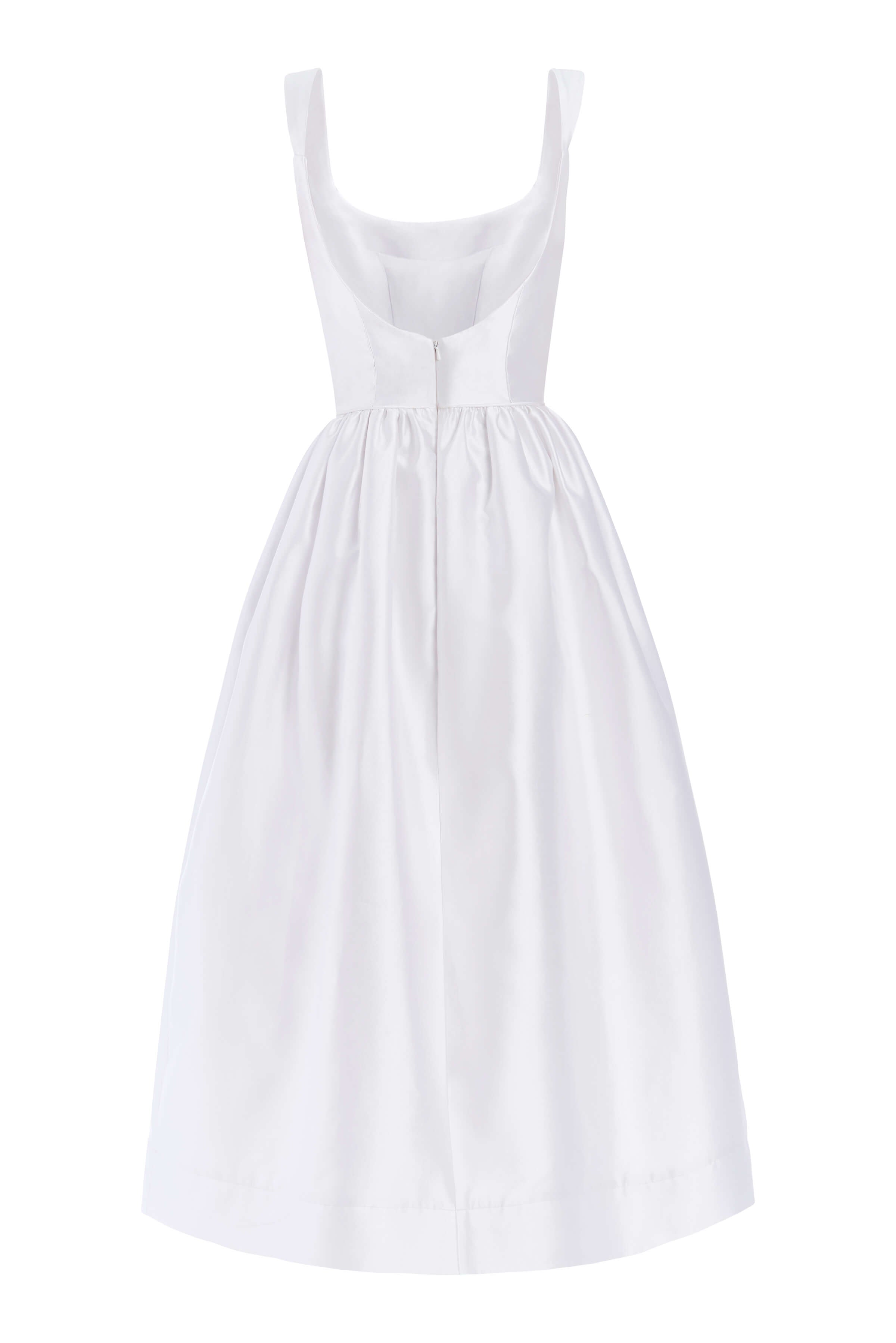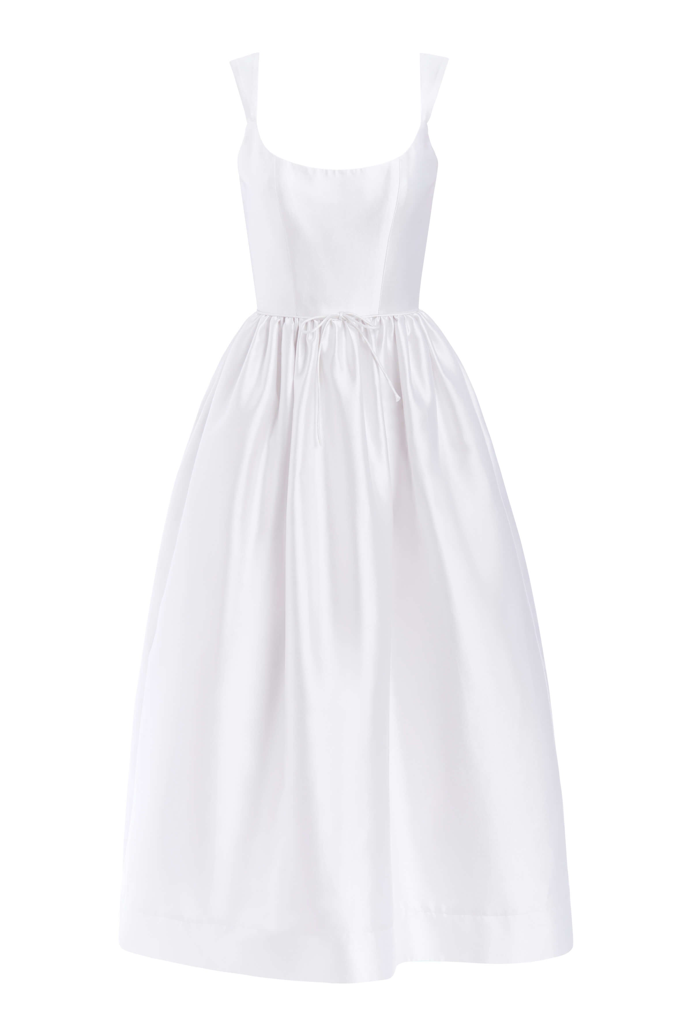 - Off-white silk cotton corset dress with full skirt and bow detail, fully lined
