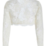 - Ivory lace cropped long sleeve jacket with scalloped hem and hook closure at neck, unlined