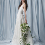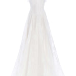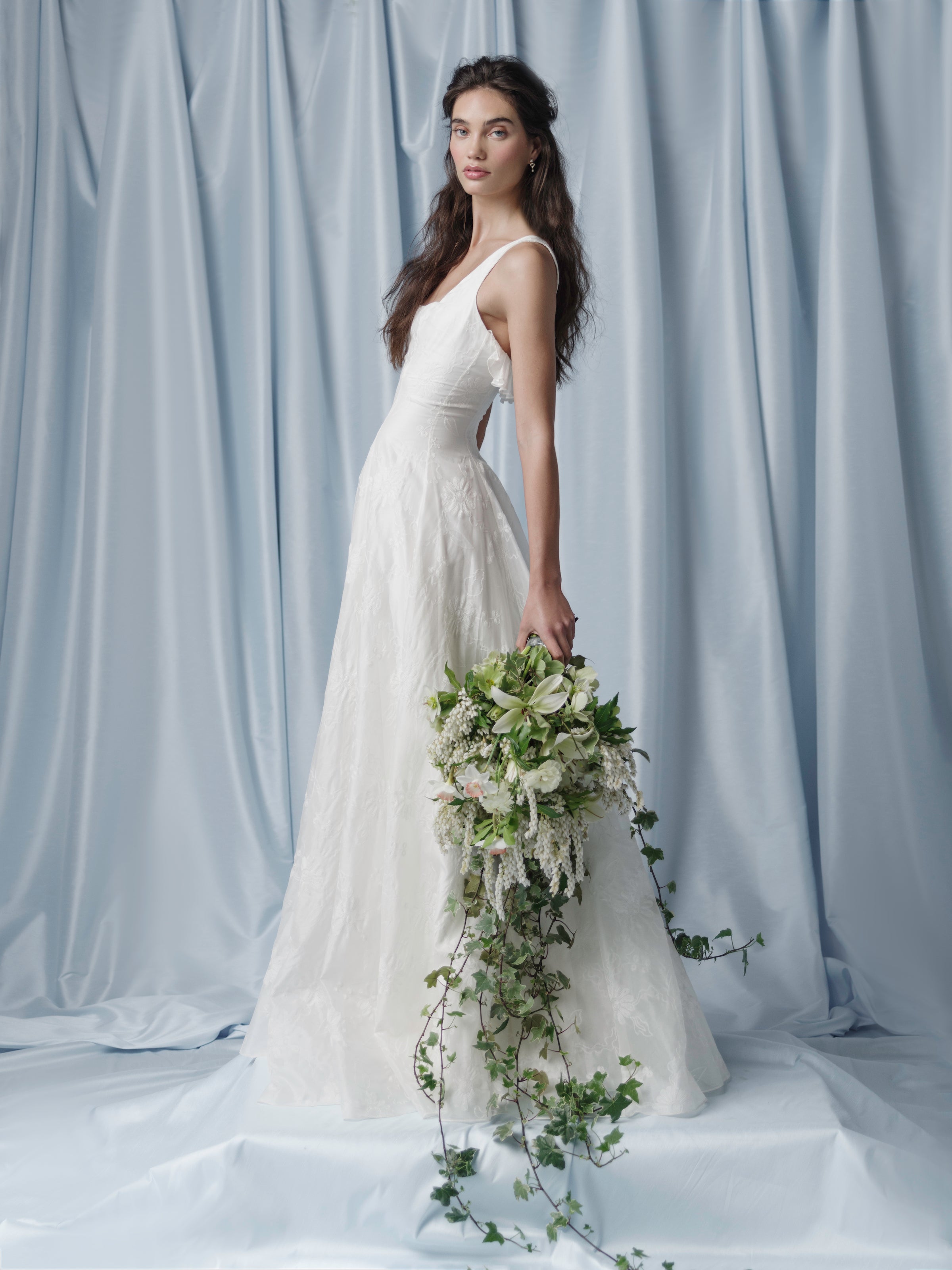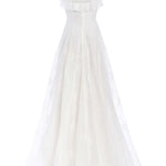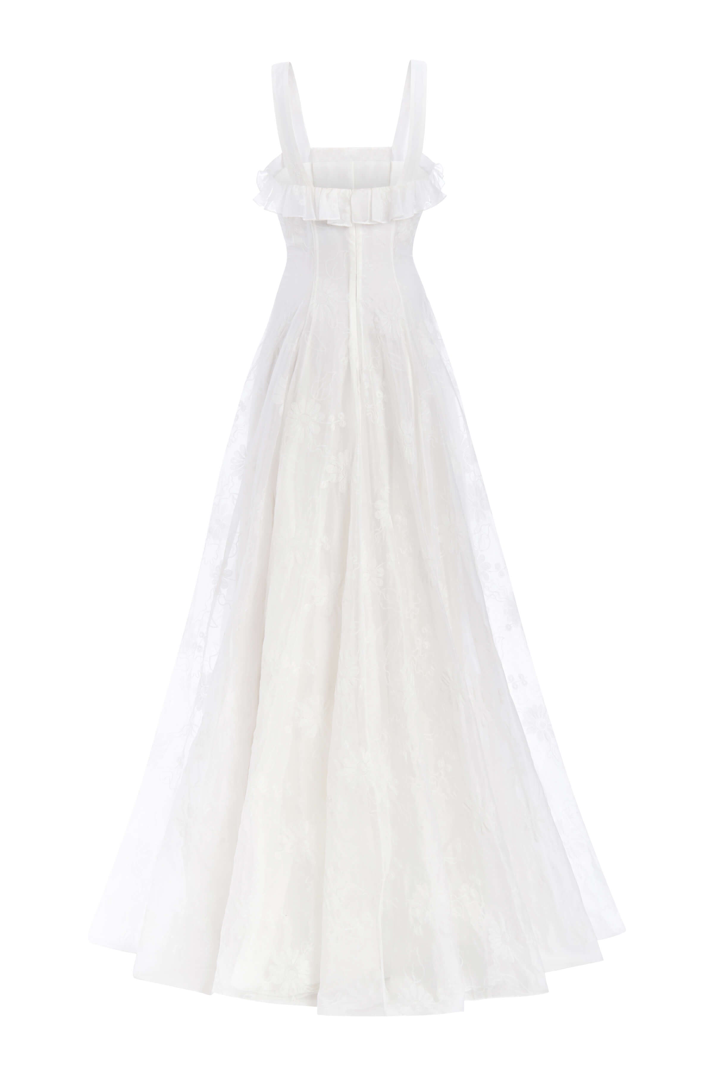 - Off-white embroidered daisy square neck a-line gown with back ruffle detail, fully lined