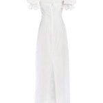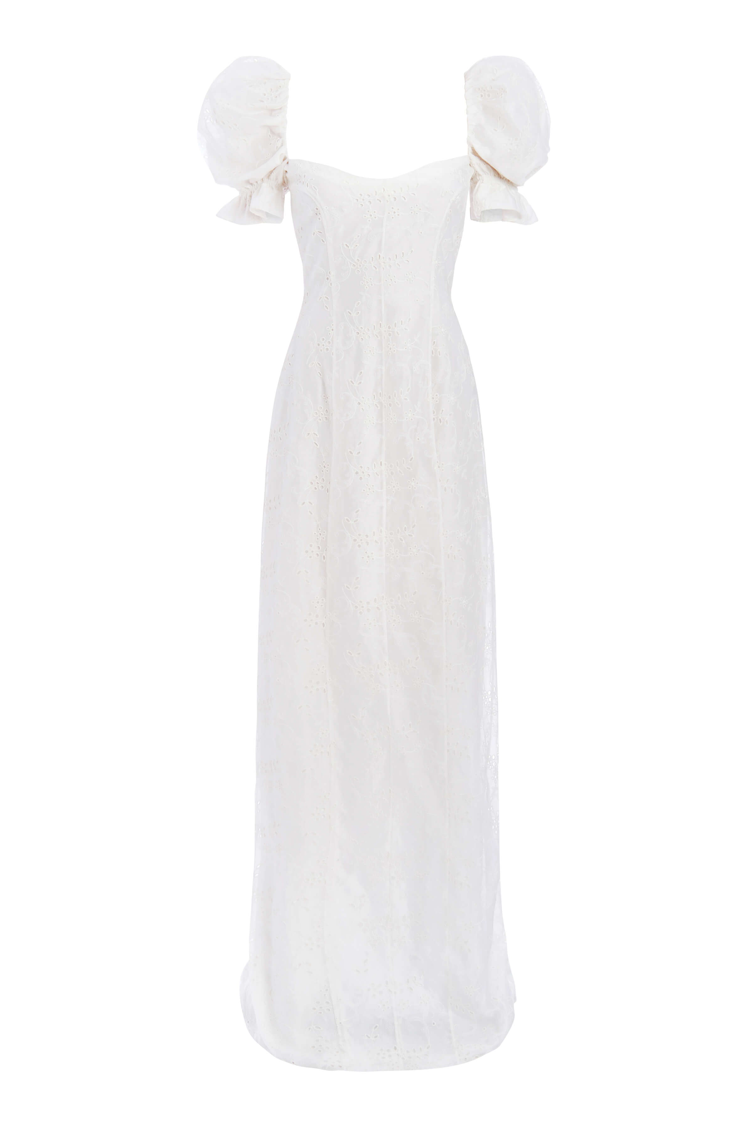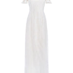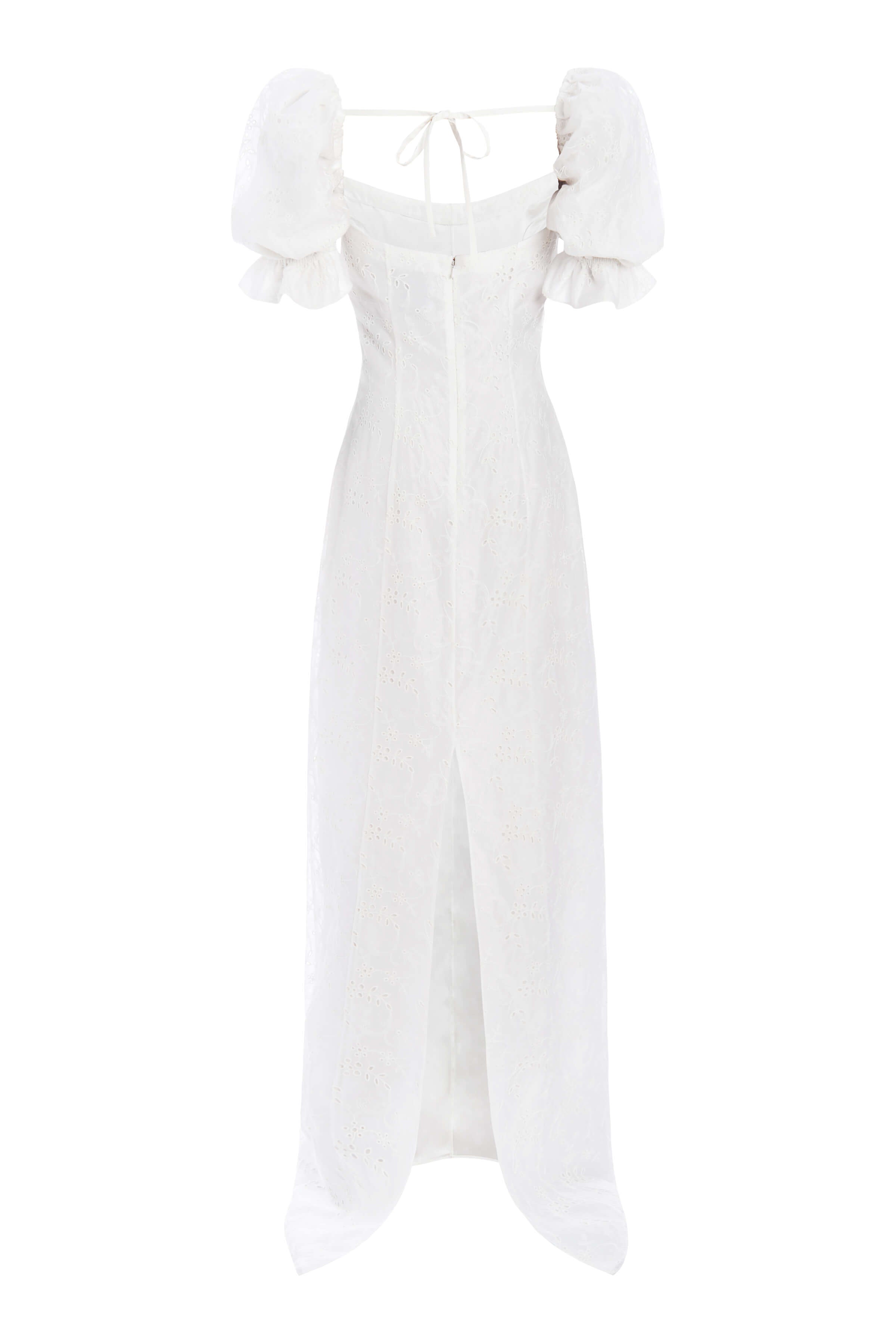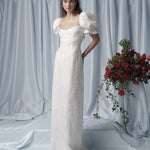 - Ivory floral embroidered column gown with puff sleeves and back tie detail, fully lined