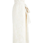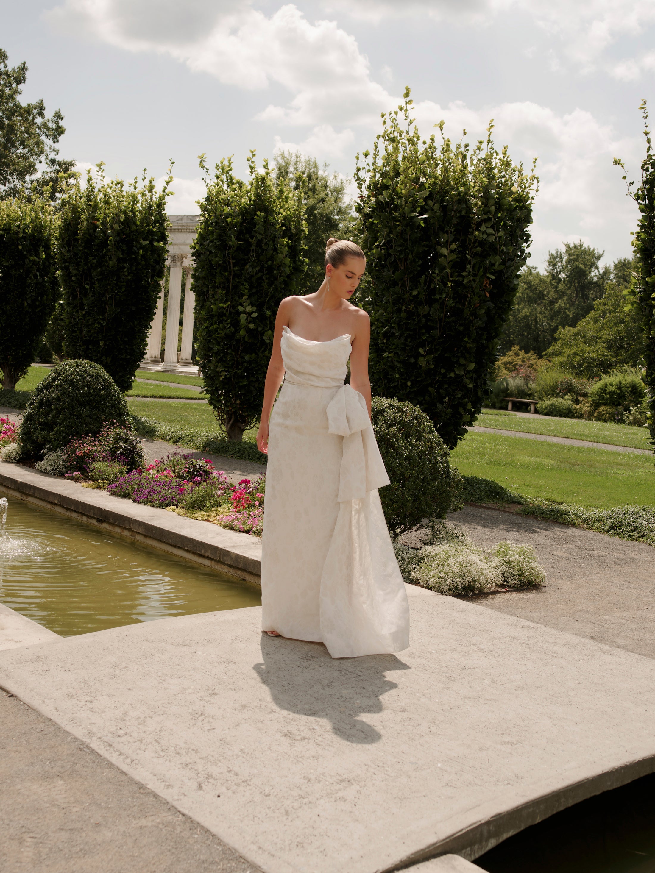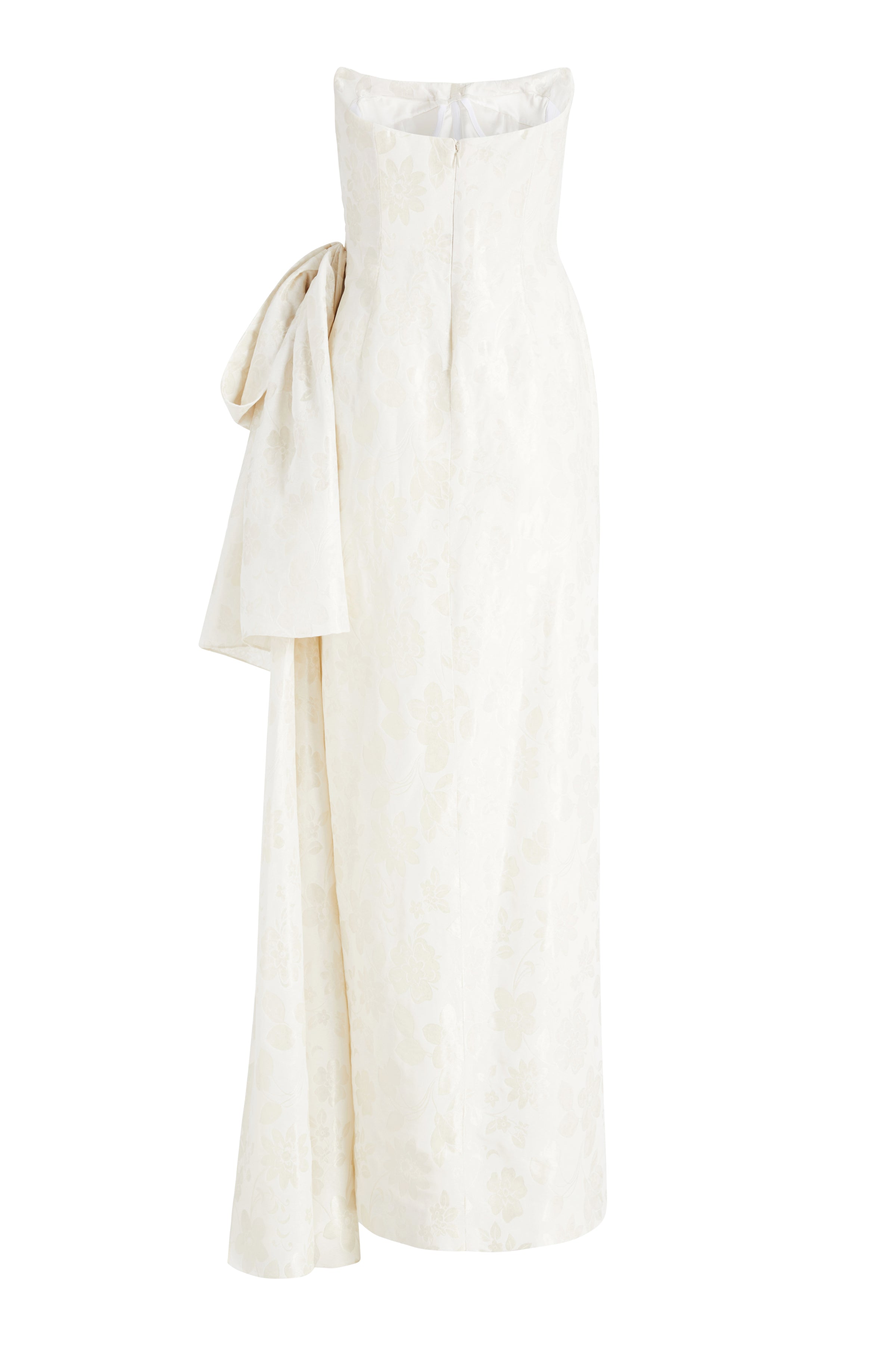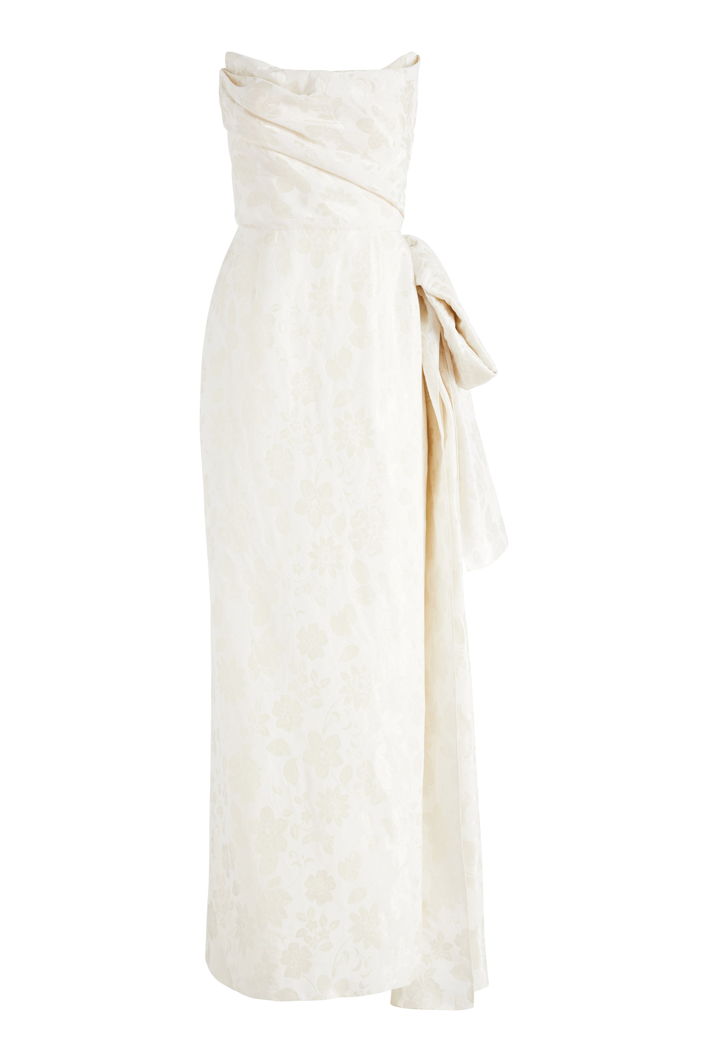 - Strapless draped corset bodice gown in ivory floral brocade with draped detail at the waist