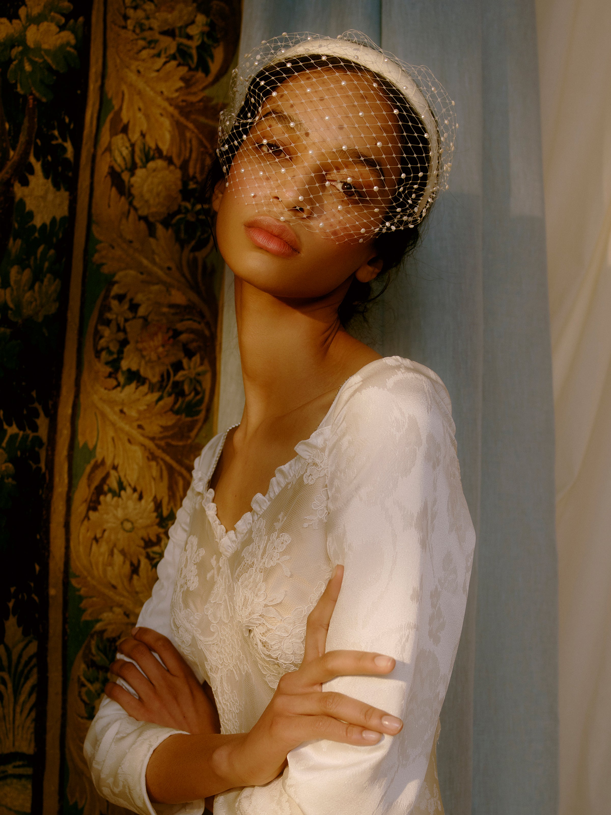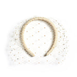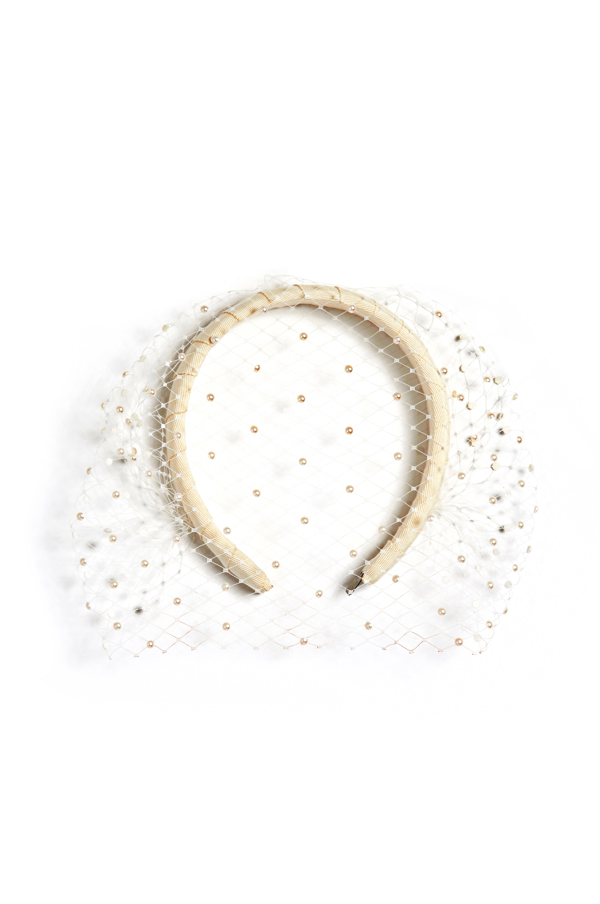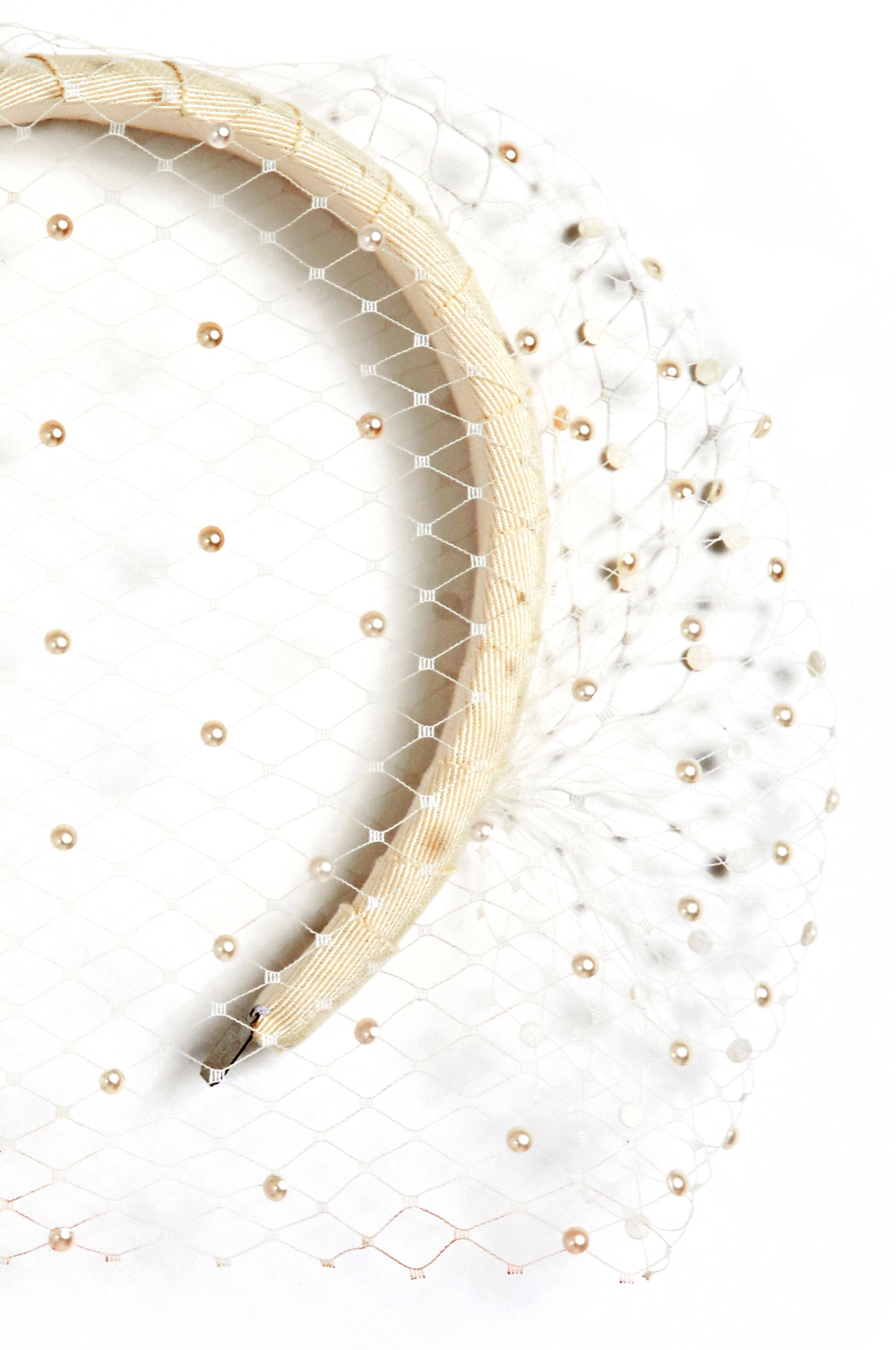 - Lunella Grosgrain Padded Headband with Hand Draped Swarovski Pearl Dotted French Veiling