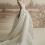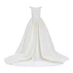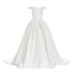 - White silk faille off-the-shoulder drop waist gown with full skirt and train, fully lined