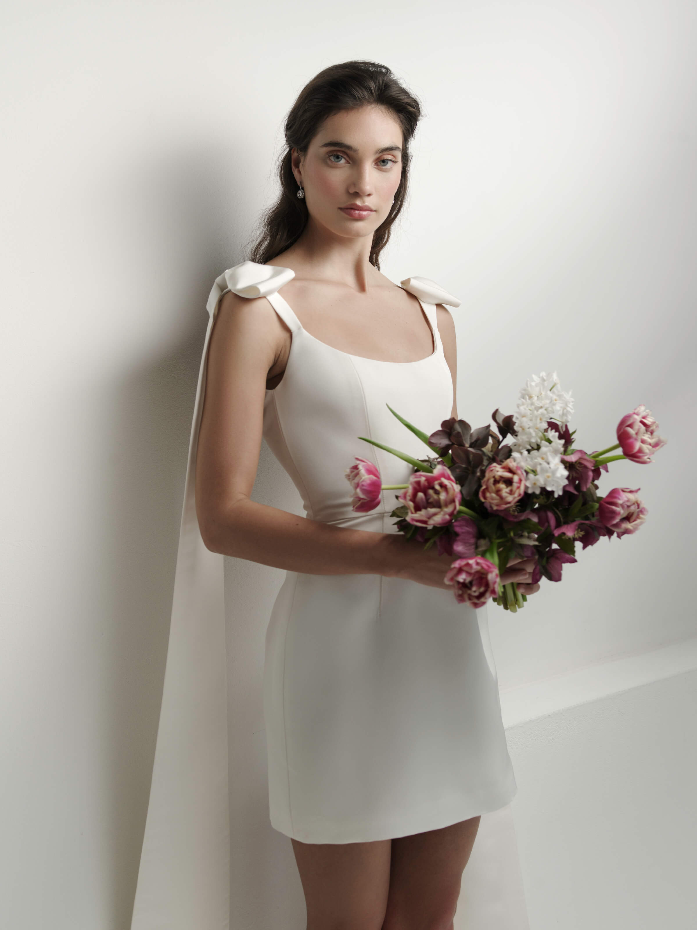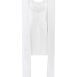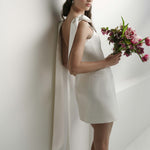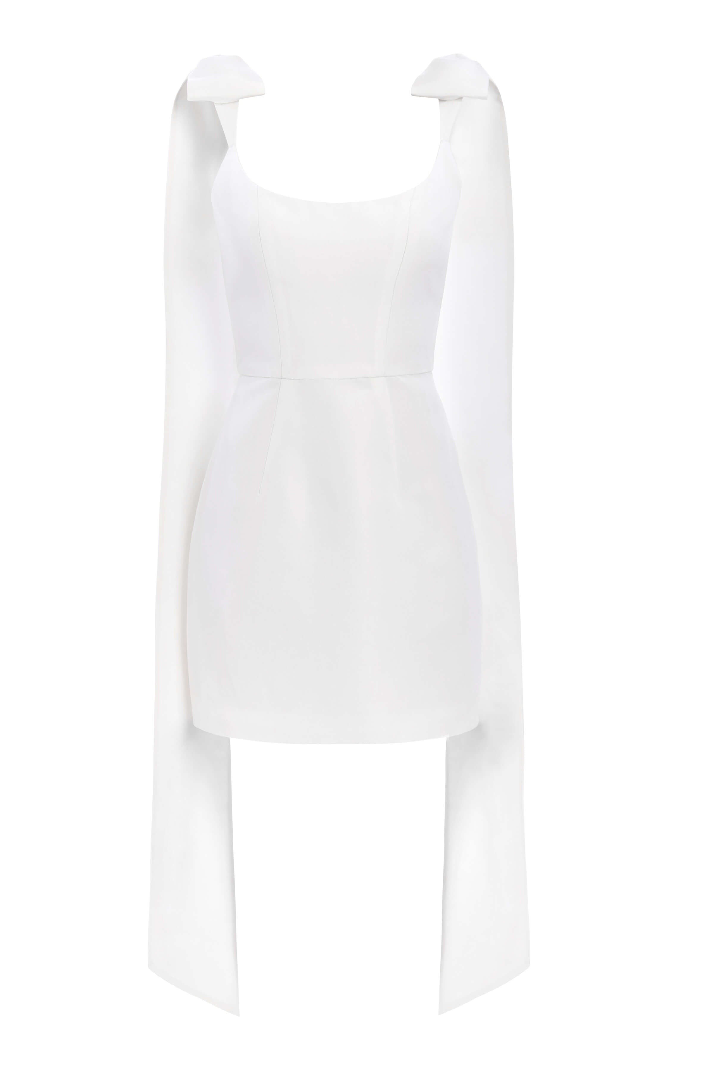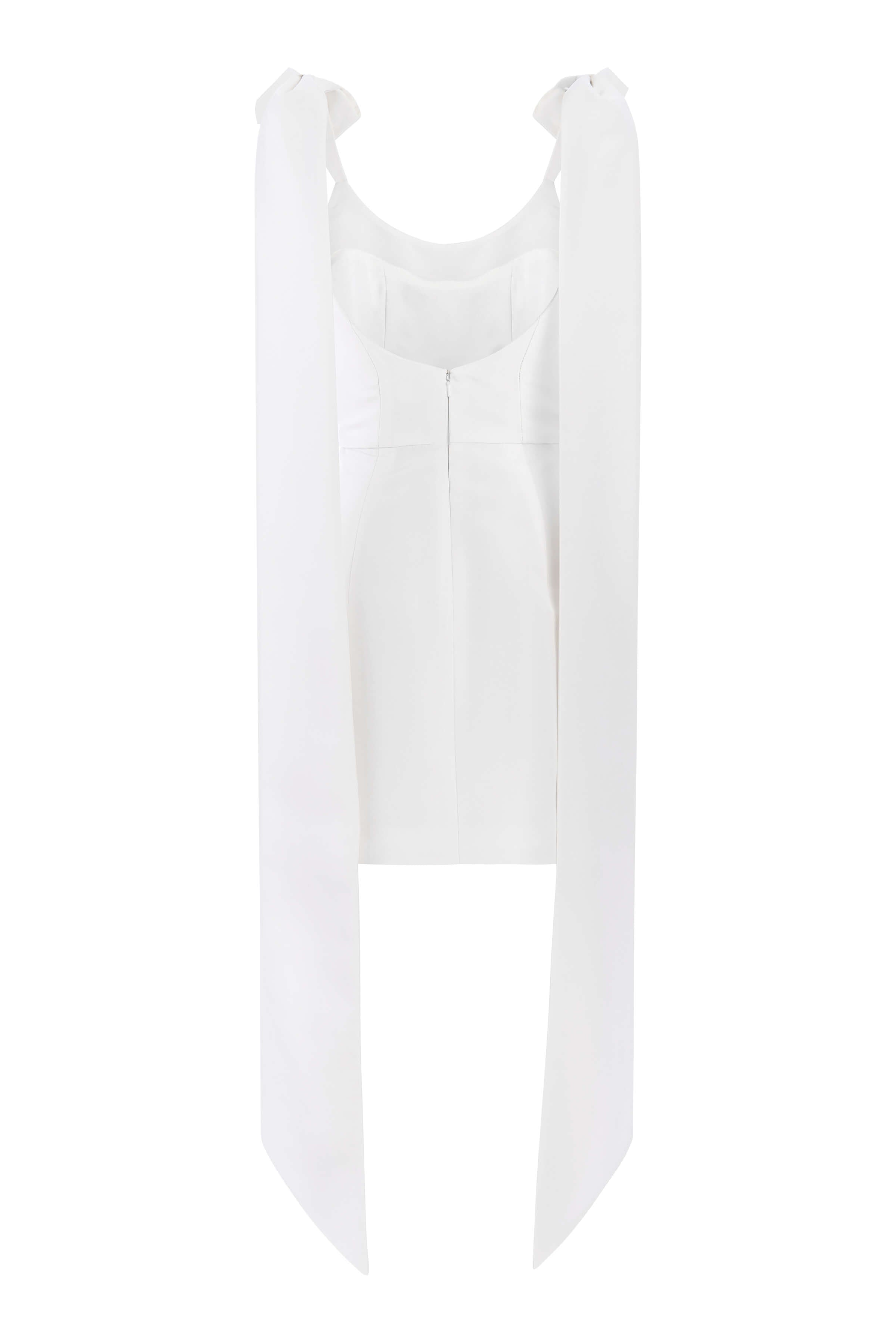 - Off-white silk faille corset mini dress with scoop back and shoulder trains, fully lined
