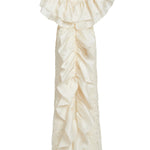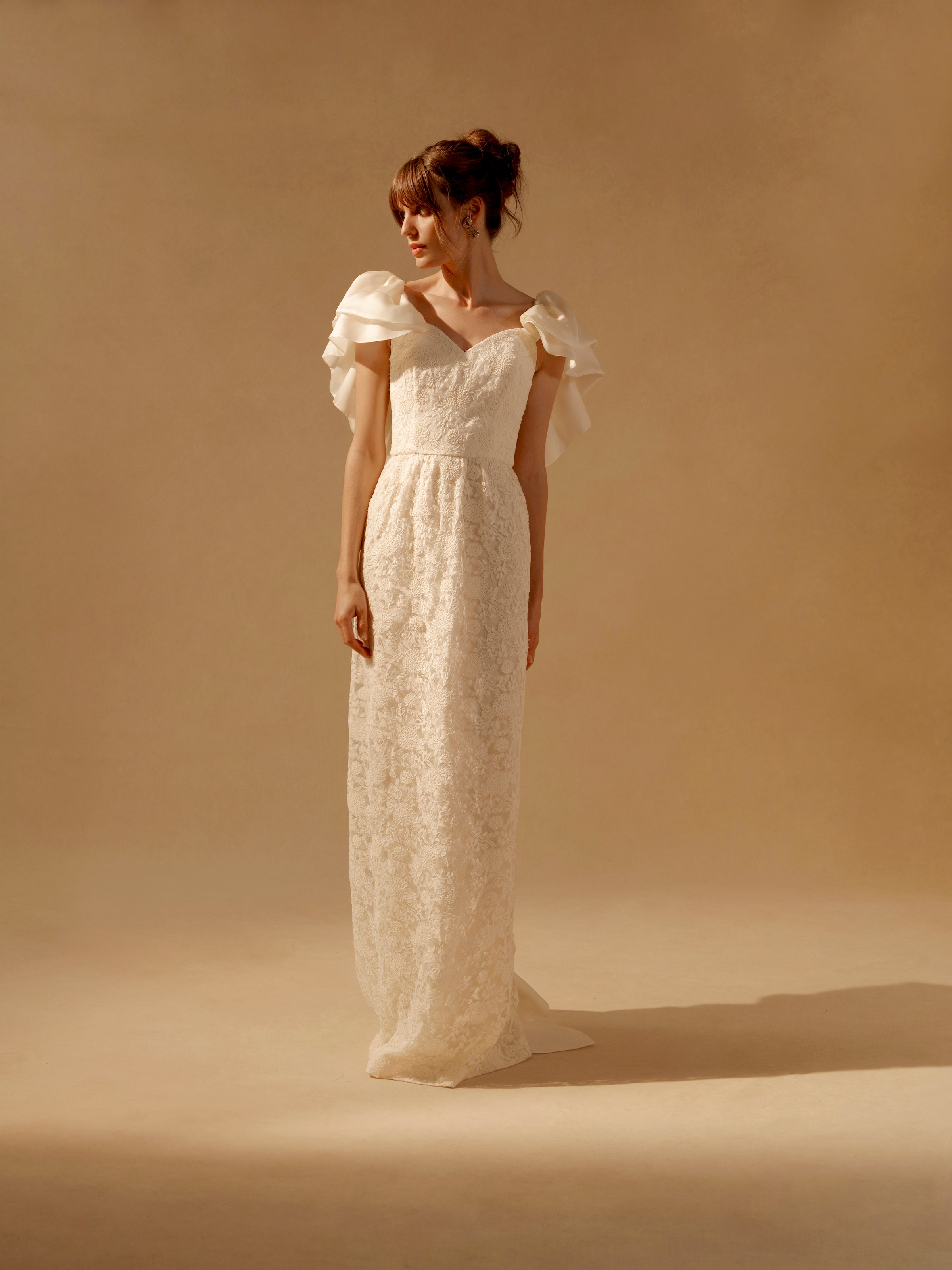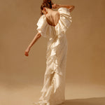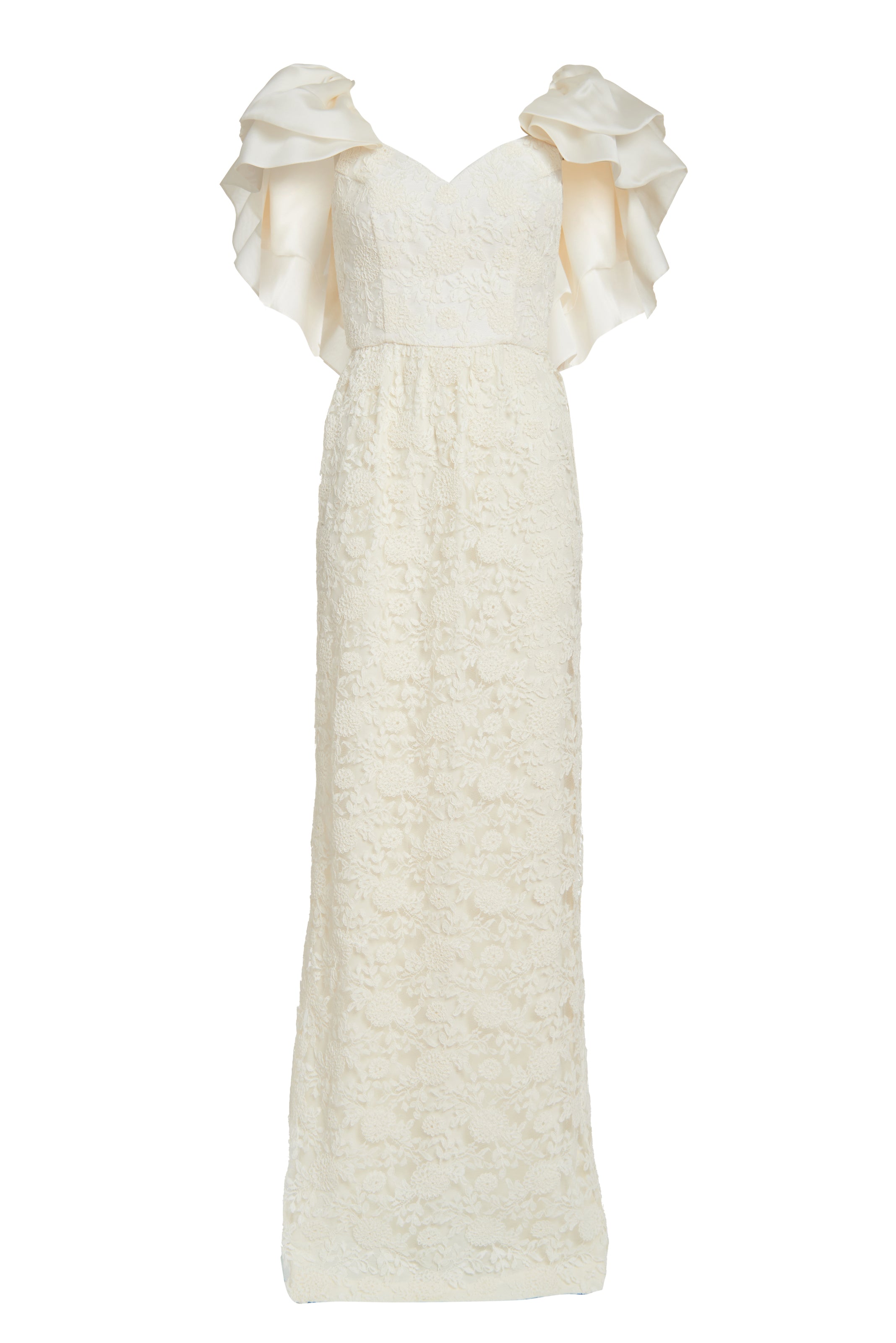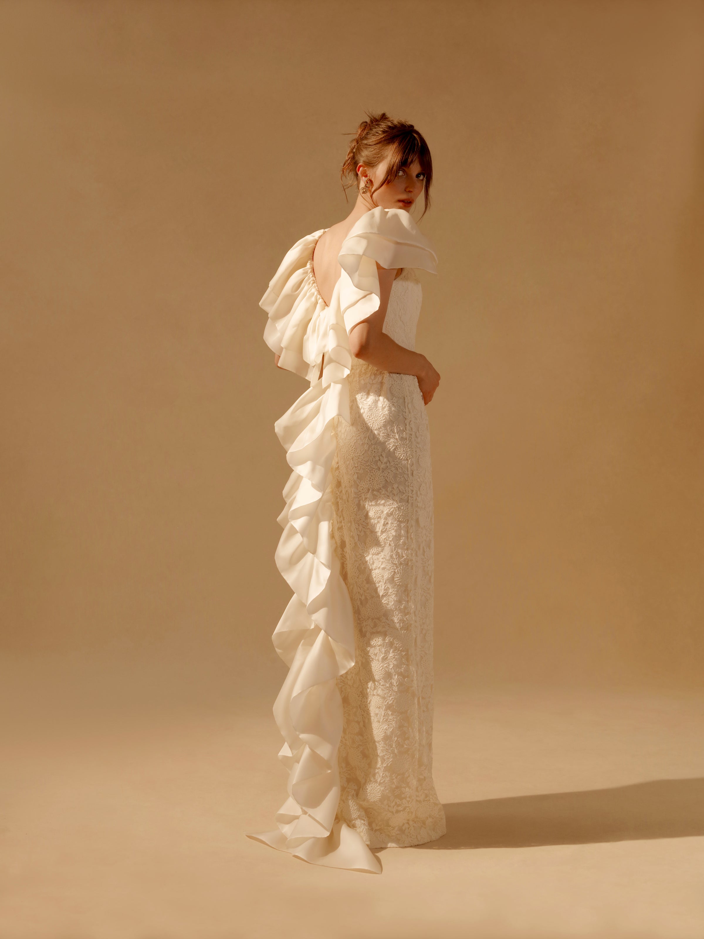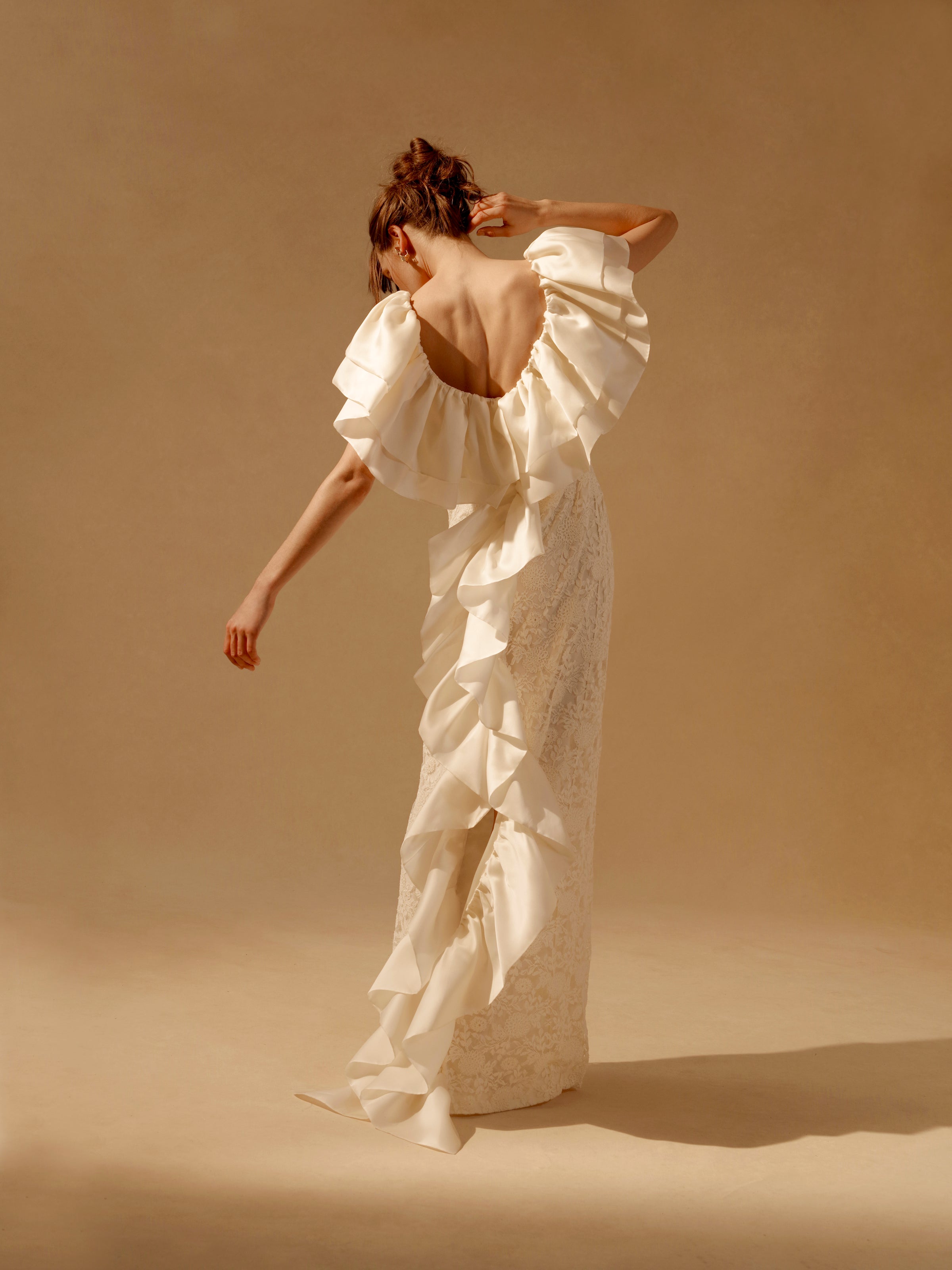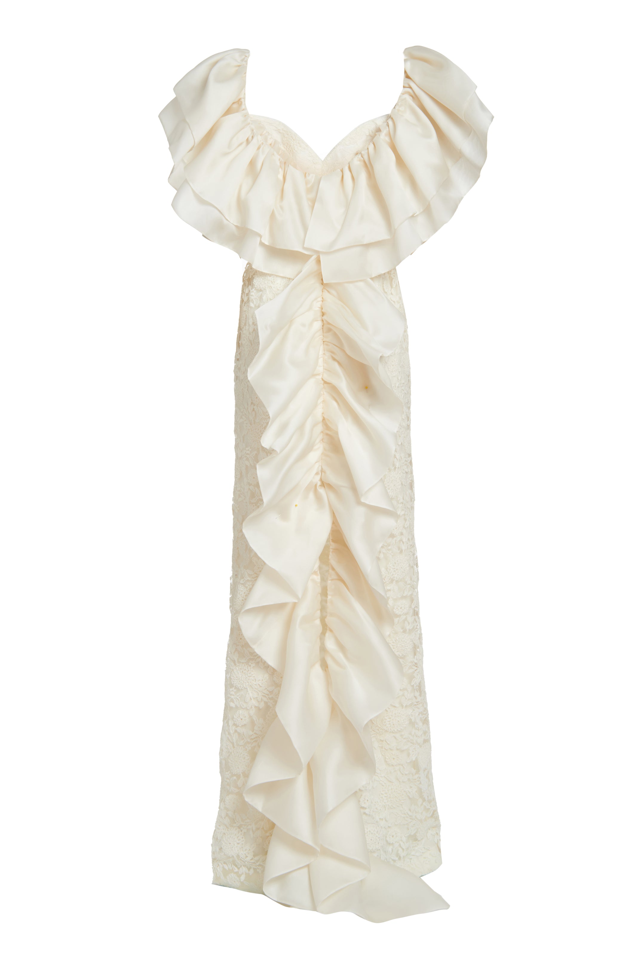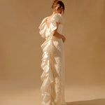Ivory lace gown with satin faced organza ruffles with back detailing