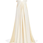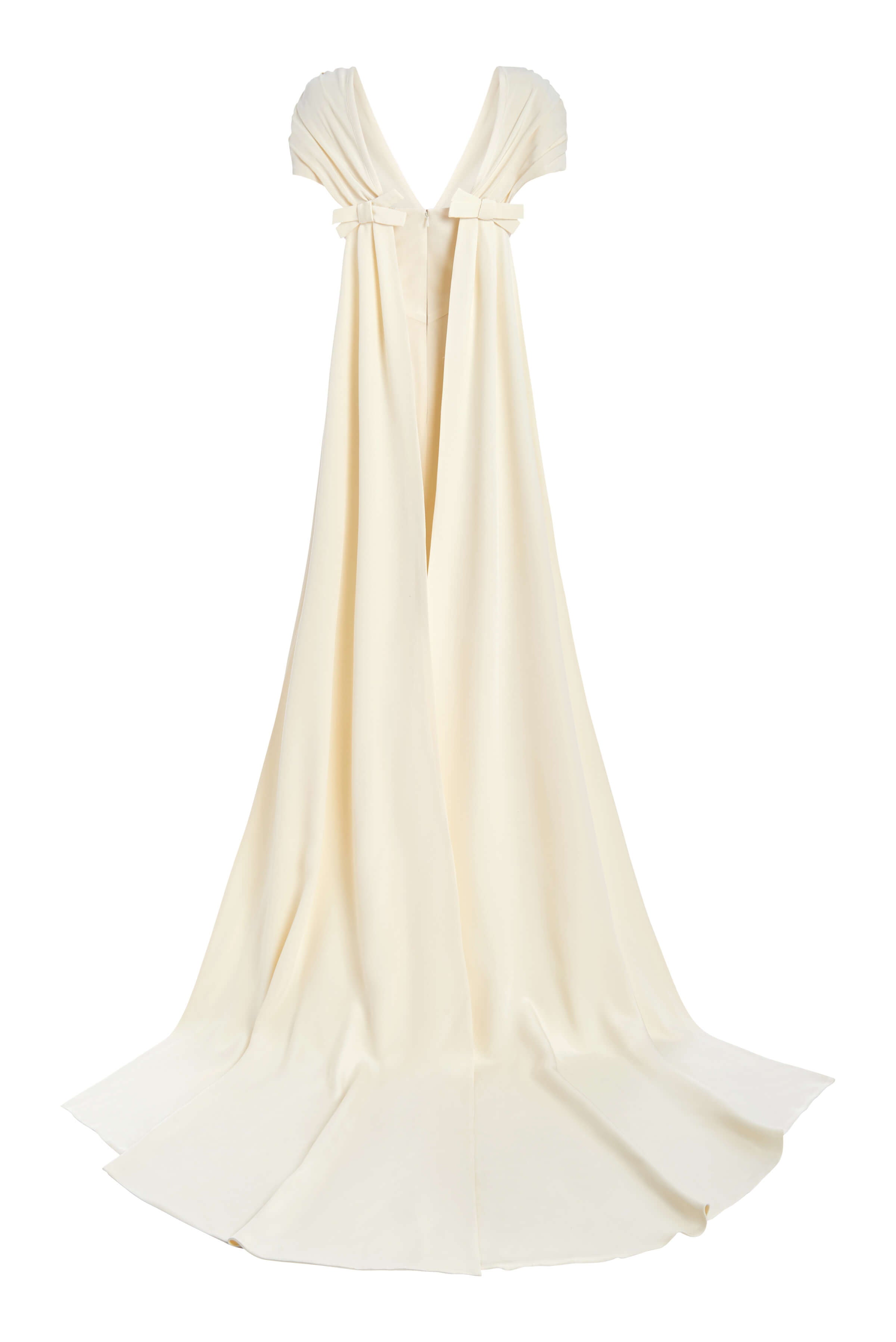 - Ivory crepe gathered cap sleeve gown with plunging neckline and shoulder trains with bow detail, fully lined