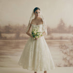 - Ivory lace strapless full skirt midi dress with scalloped hem detail, fully lined