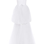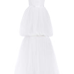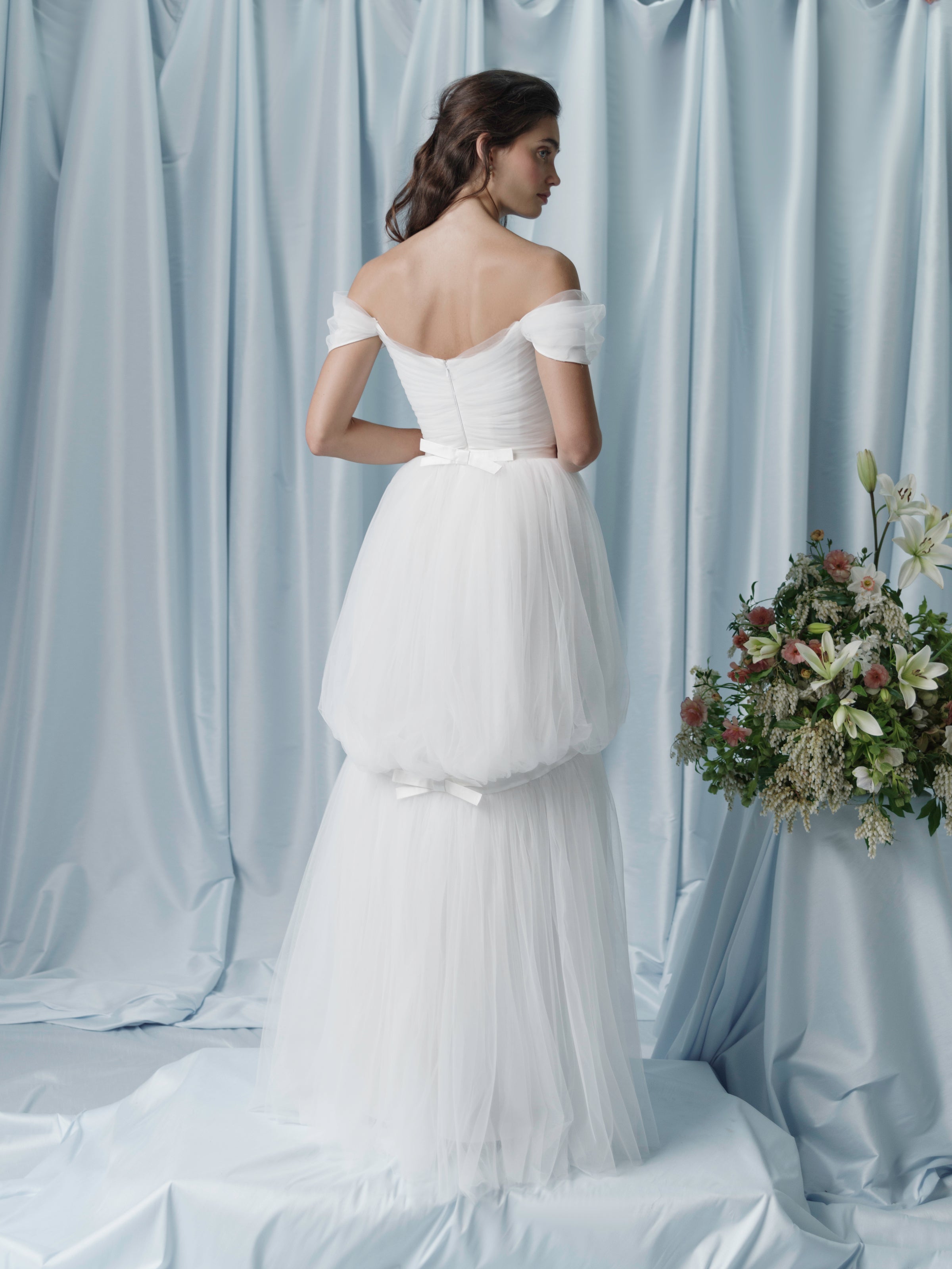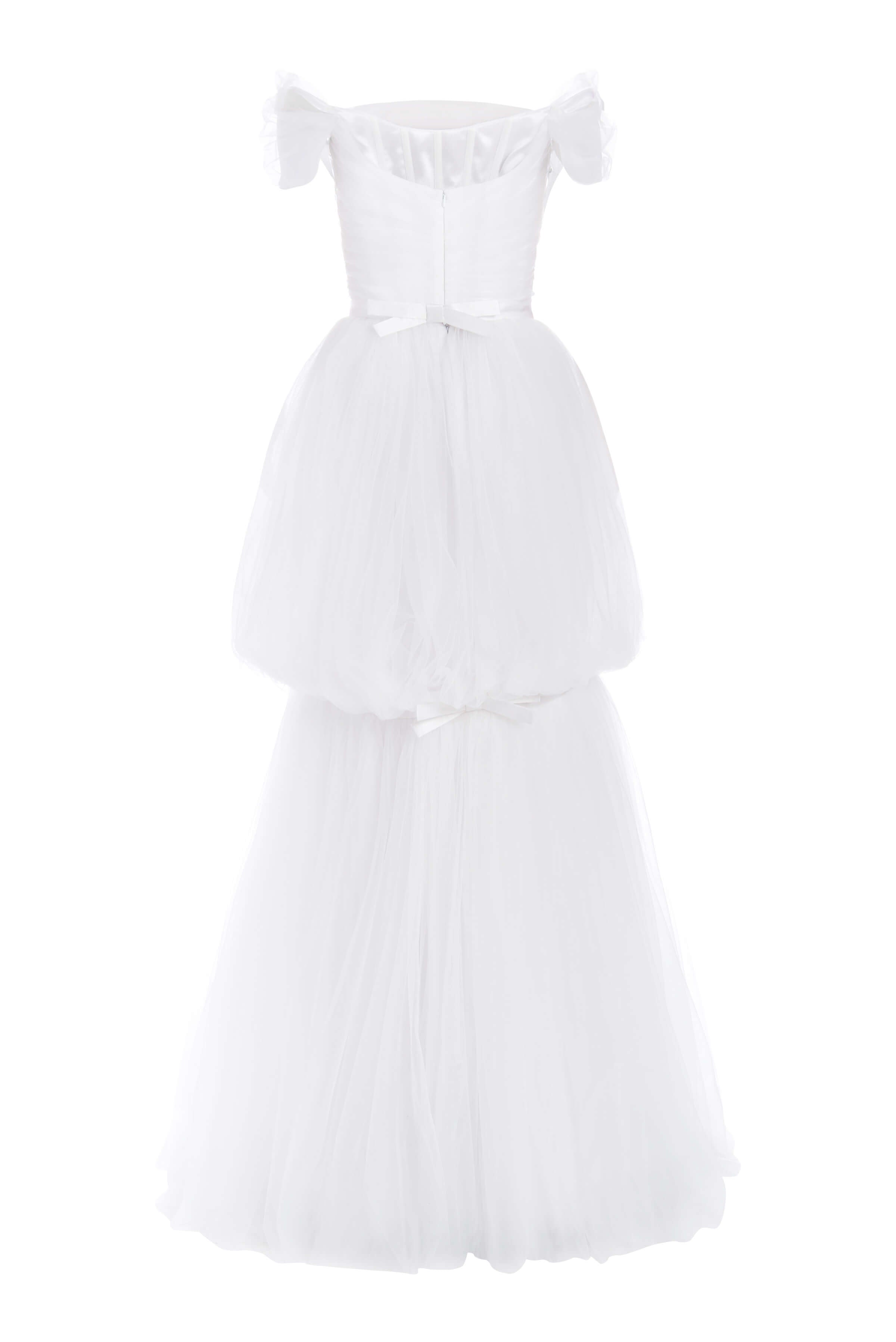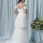 - Ivory tulle off-the-shoulder ruched bodice short sleeve gown with ruffled tiered skirt and detachable belt, fully lined