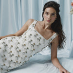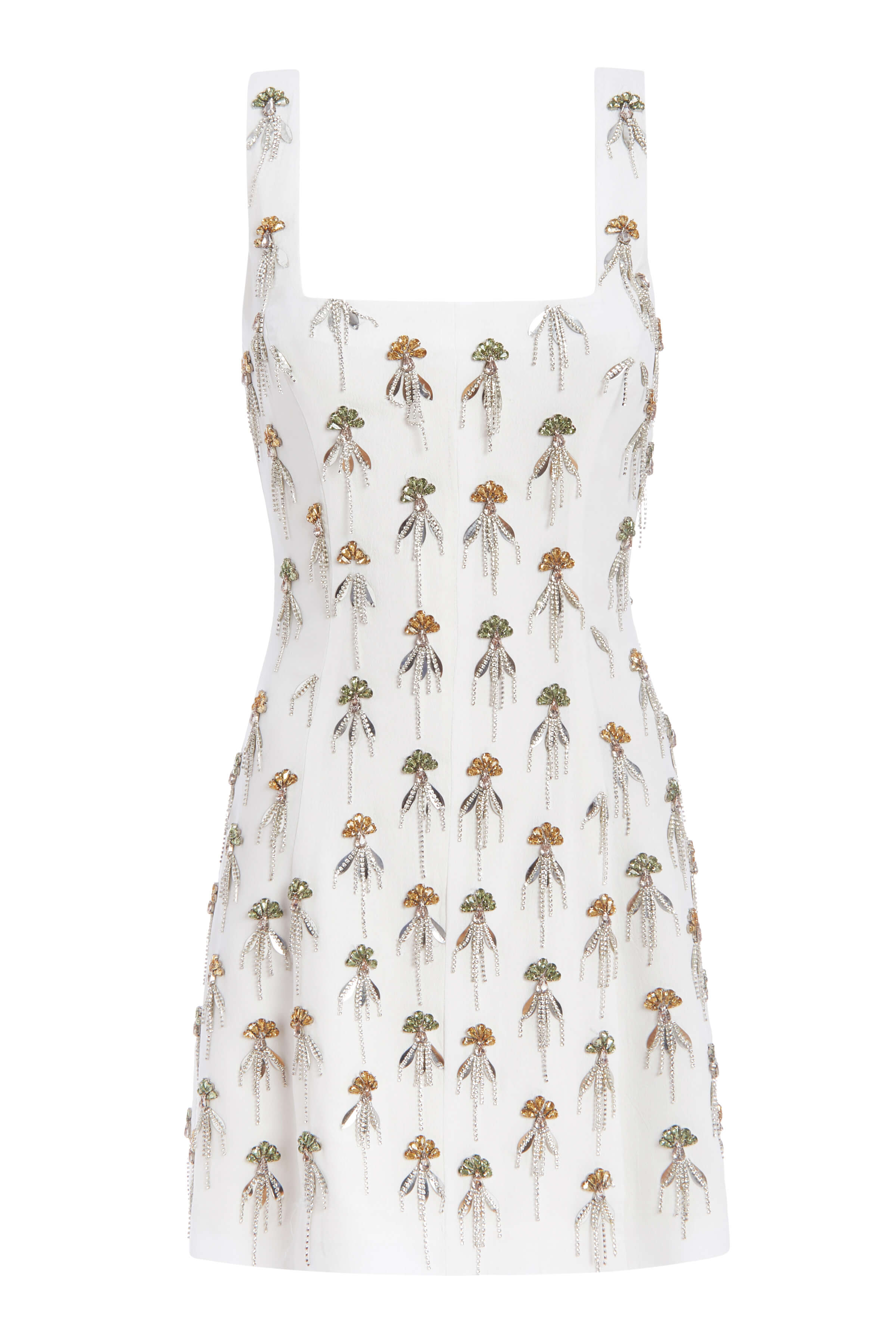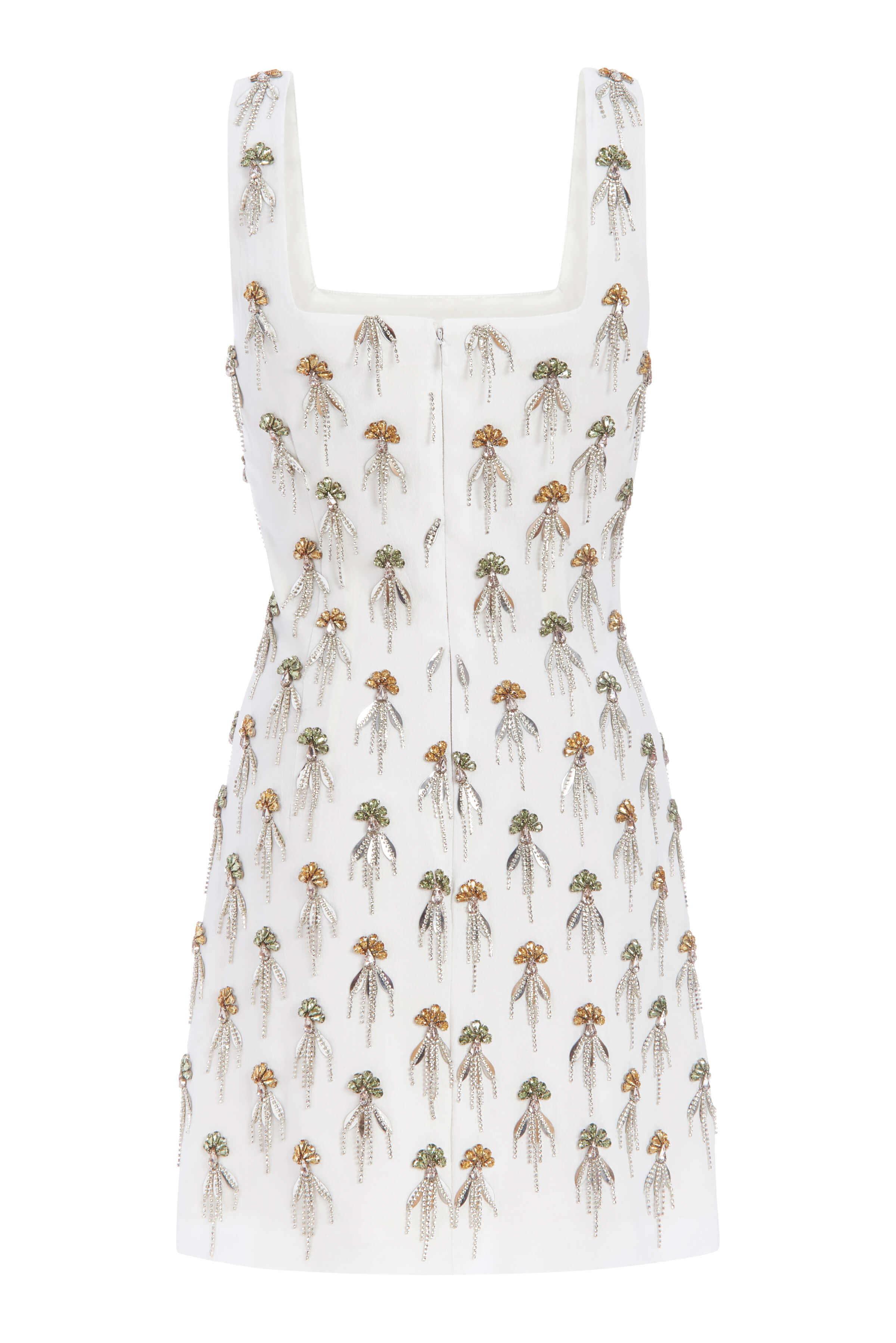 - White hand-beaded mini dress with square neckline and floral crystal tassels throughout, fully lined