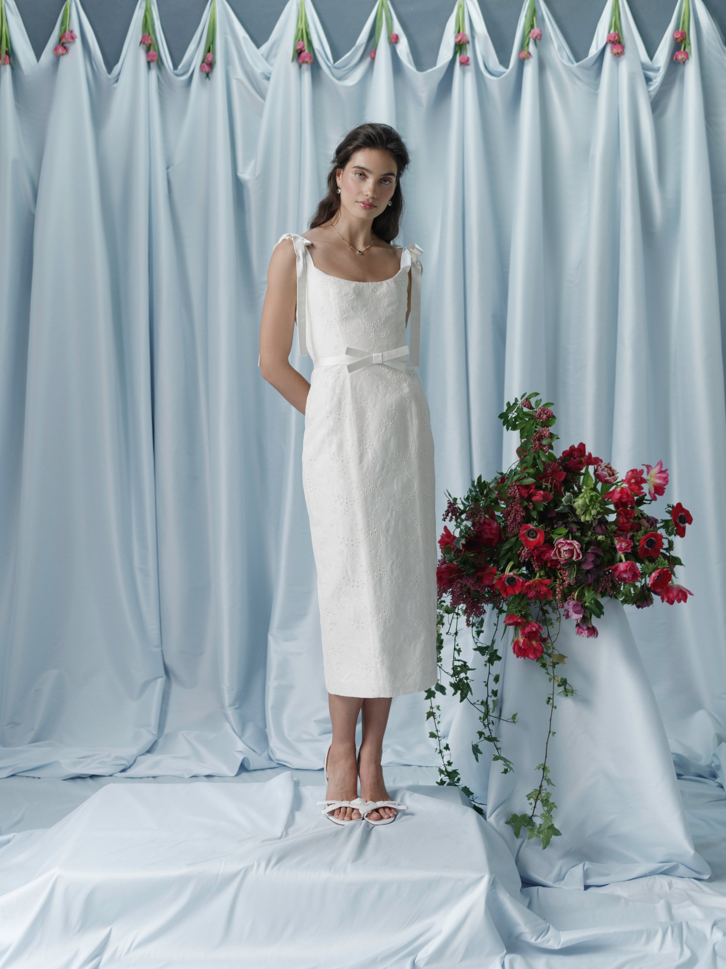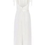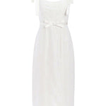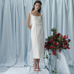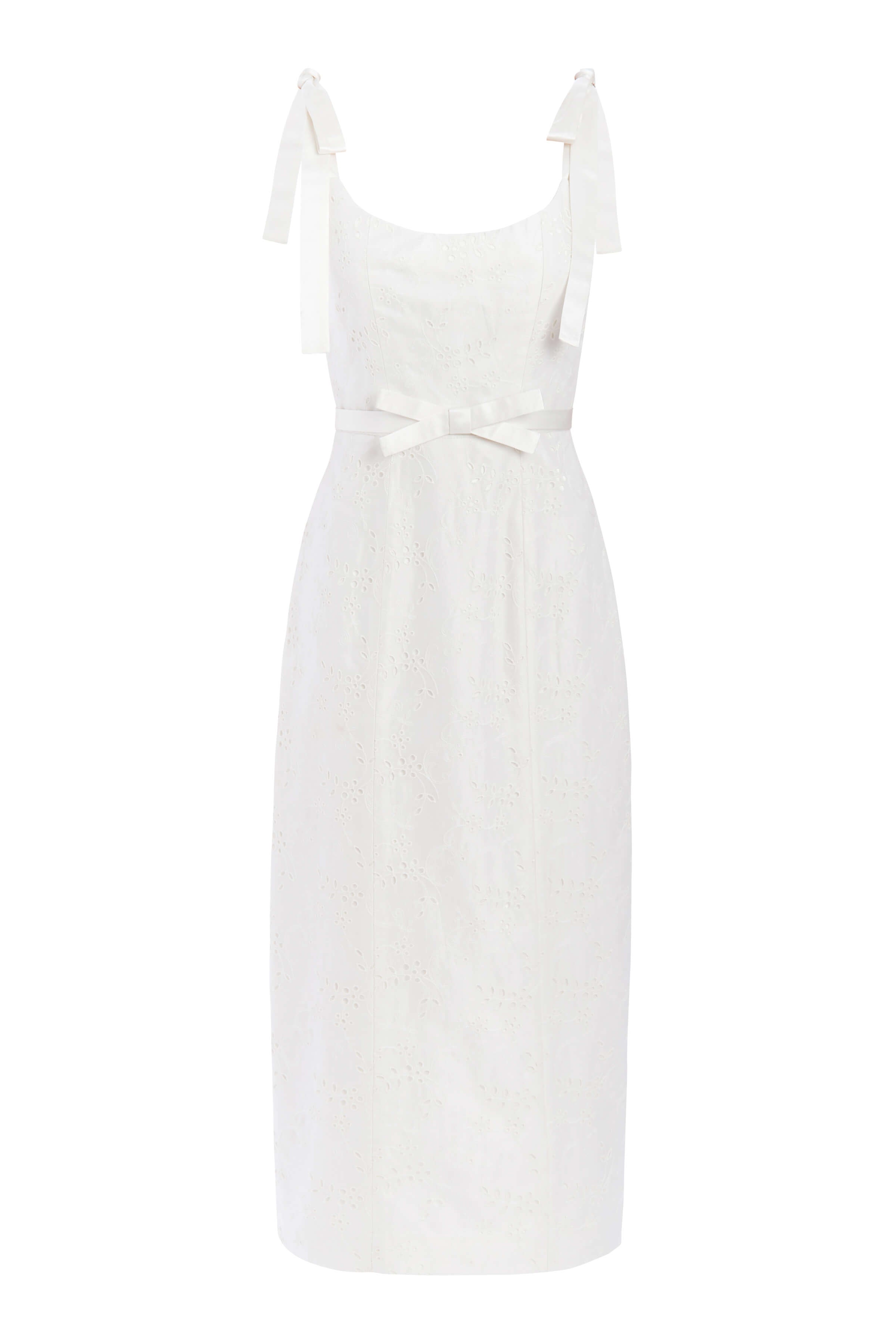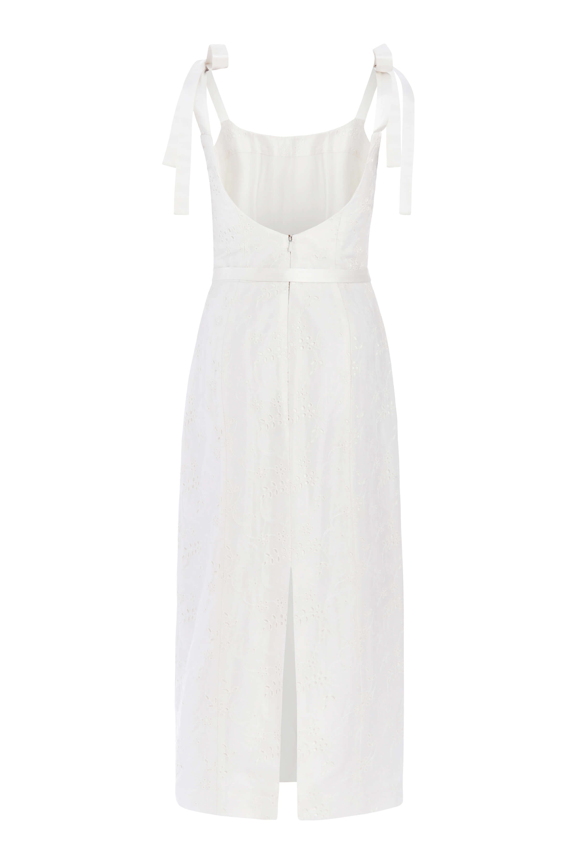 - Ivory floral embroidered tie strap corset dress with detachable bow belt, fully lined