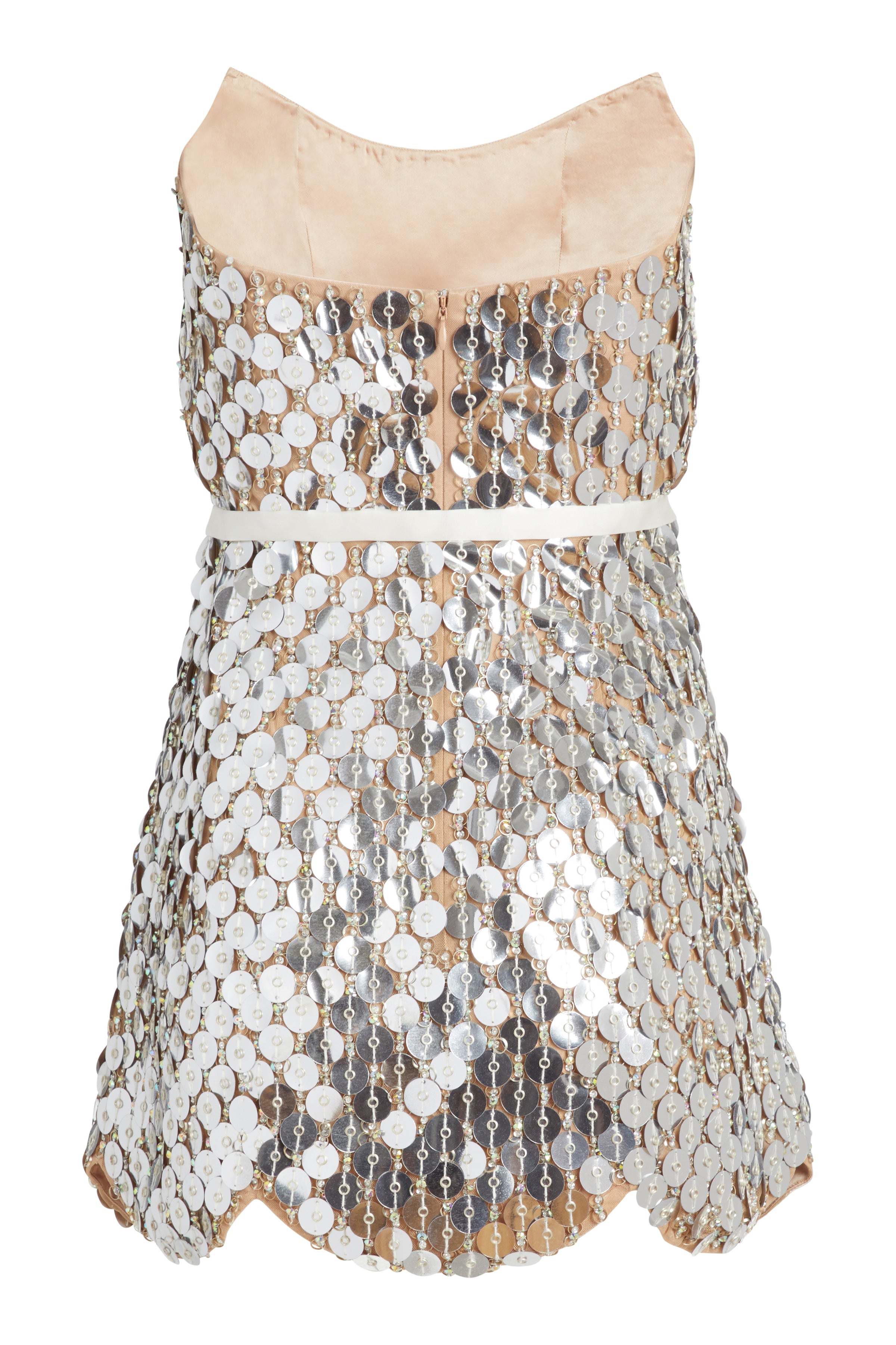 - Corseted sweetheart-neckline strapless bodice mini dress with scalloped hem and detachable bow belt with all over hand-beaded paillettes, fully lined