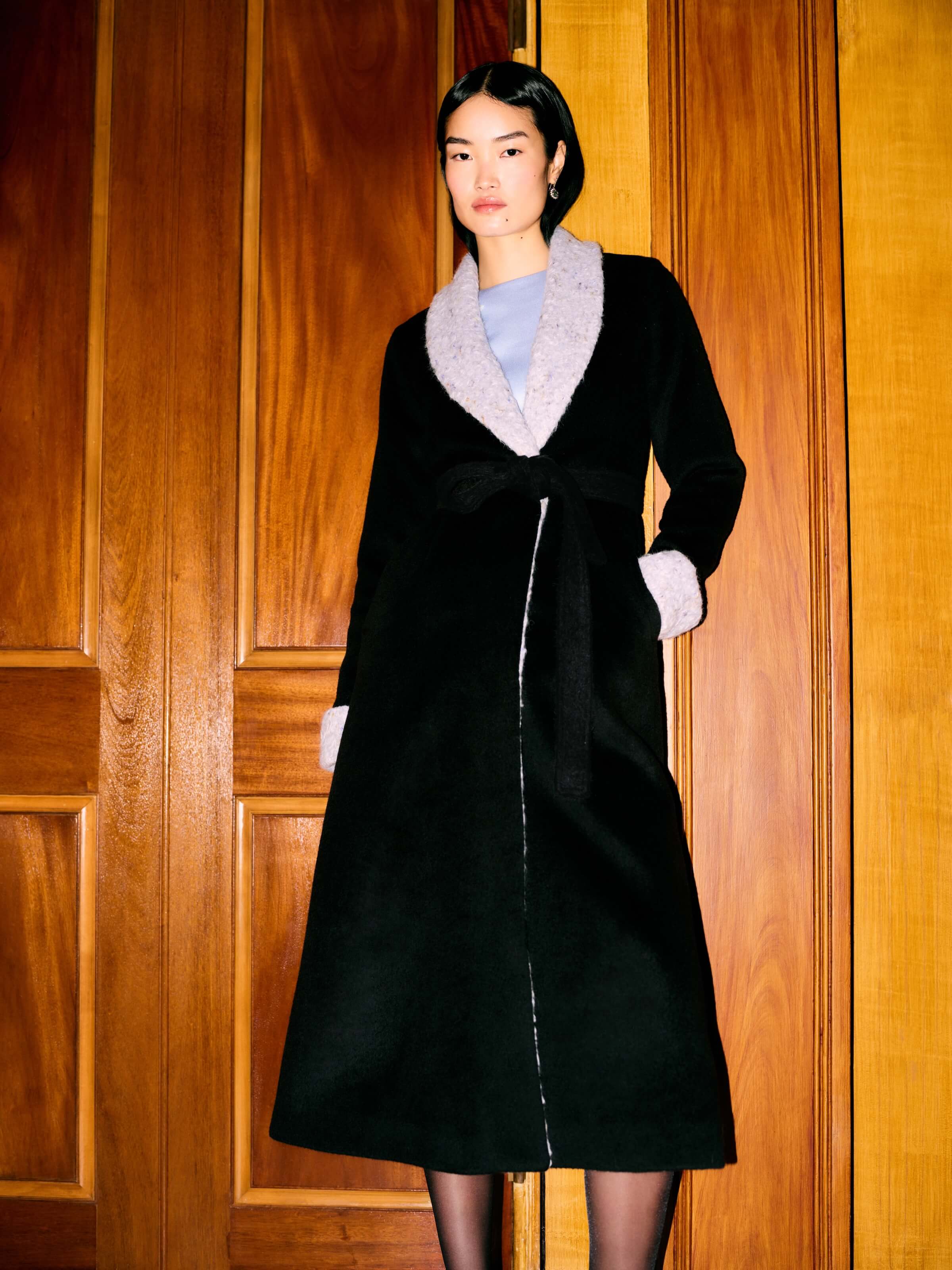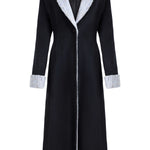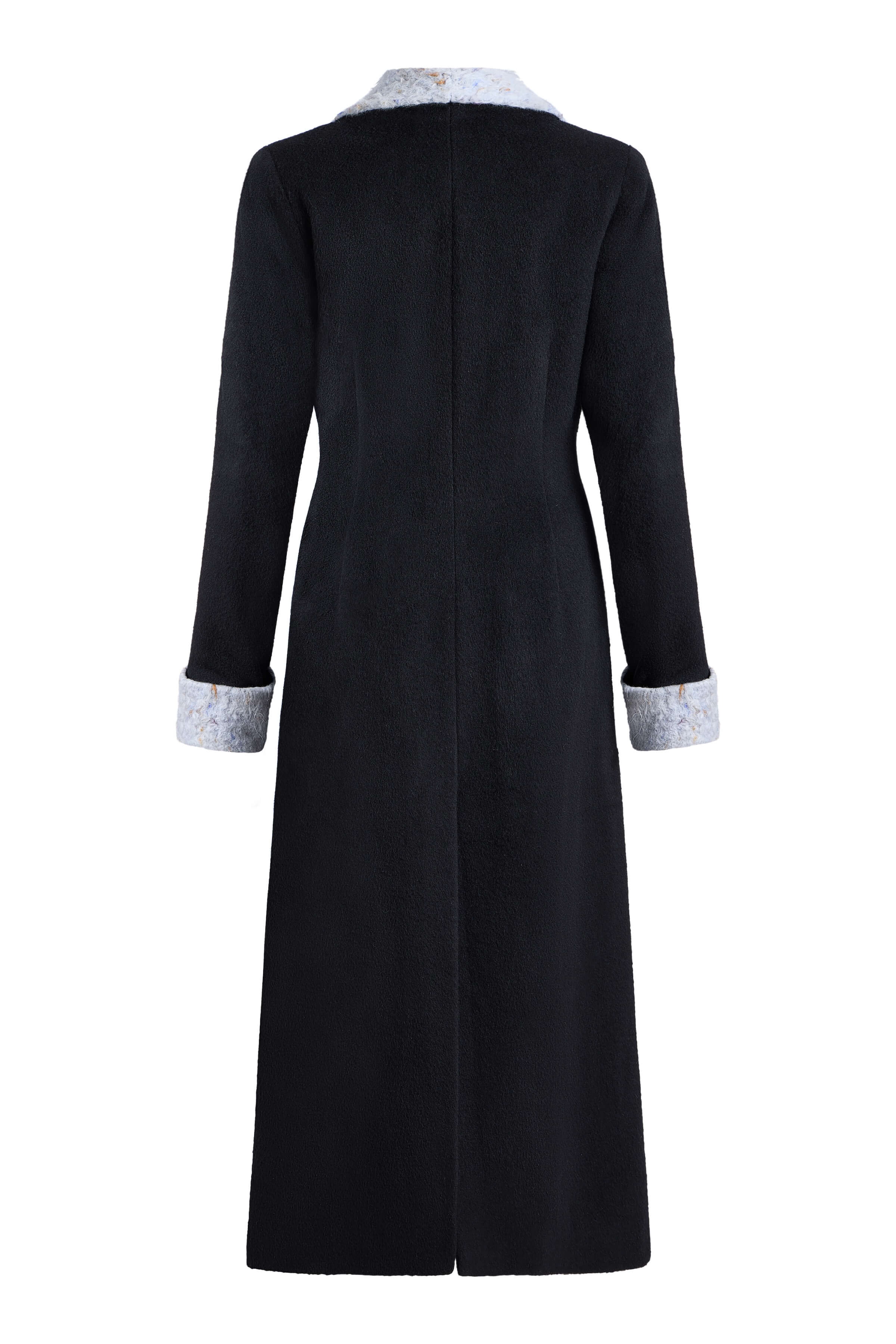 - Black coat with periwinkle shearling detail on collar and cuff, fully lined with button closure on front center.