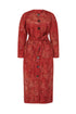 • Red floral brocade coat with rounded sleeves, pockets, and self tie belt, fully lined