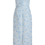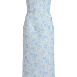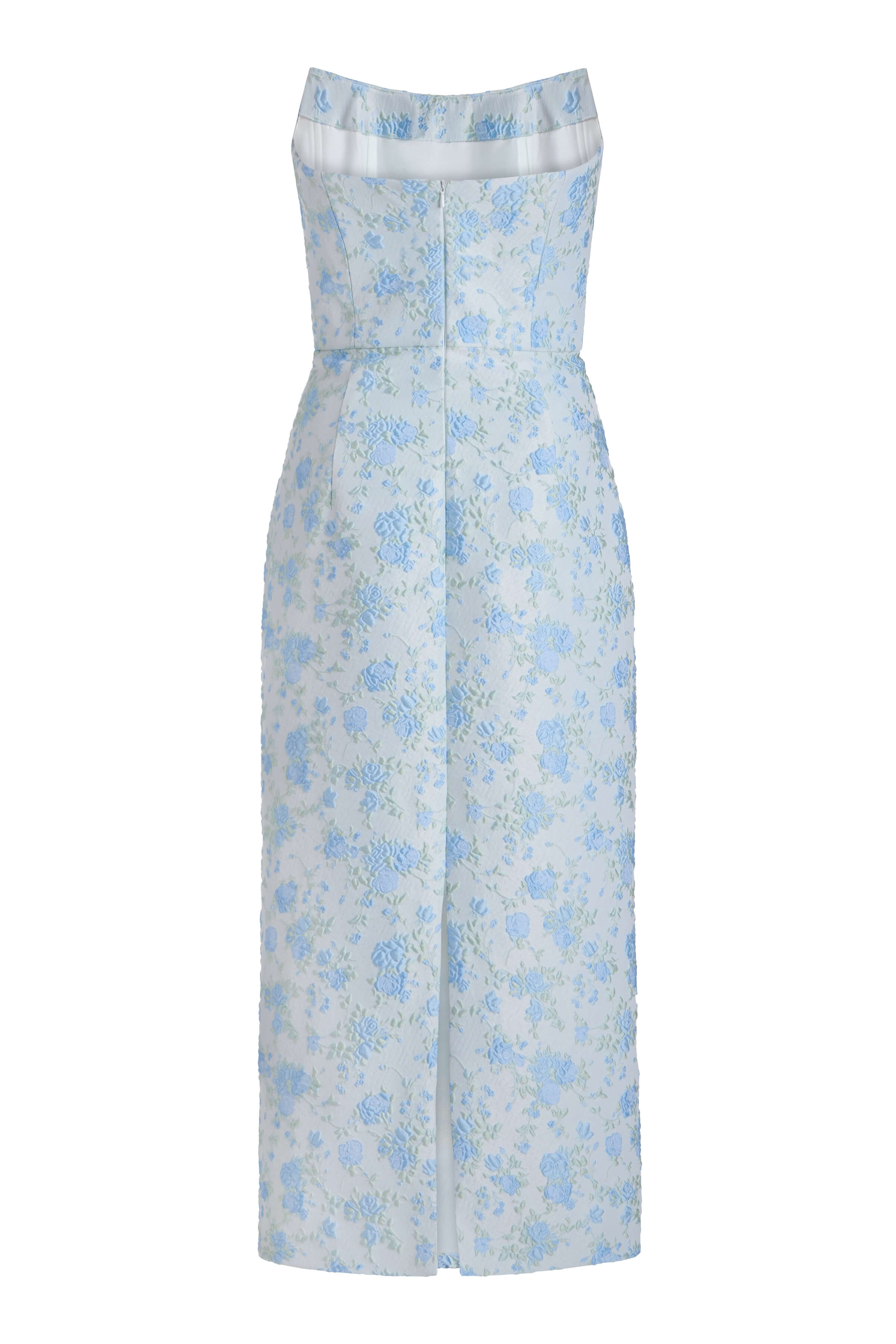 - Cornflower and mint floral brocade scooped strapless neckline and midi column skirt with back slit