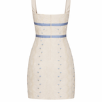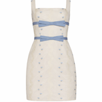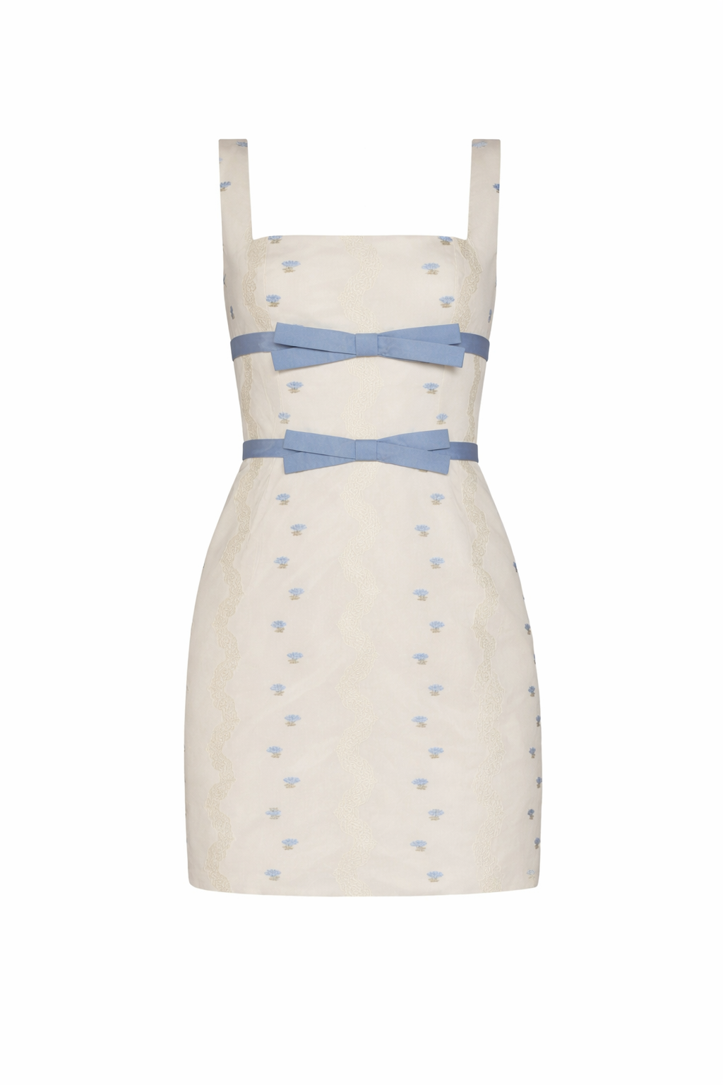 - Ivory floral striped taffeta square neck mini dress with cornflower waist bows, fully lined
