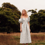 - Cornflower and mint floral brocade v-neck midi dress with puffed sleeves, fully lined