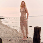 - Seashell and silver bead embellished nude mesh v-neck sleeveless midi dress, unlined