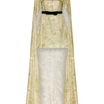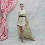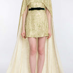 - Mini dress with detachable cape and removable contrast velvet belt, fully lined (lining will be updated tonally to match the self background)