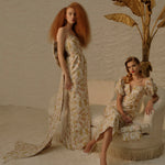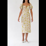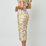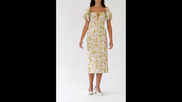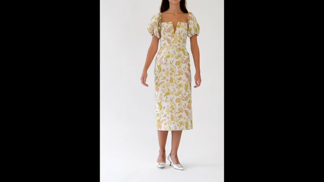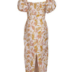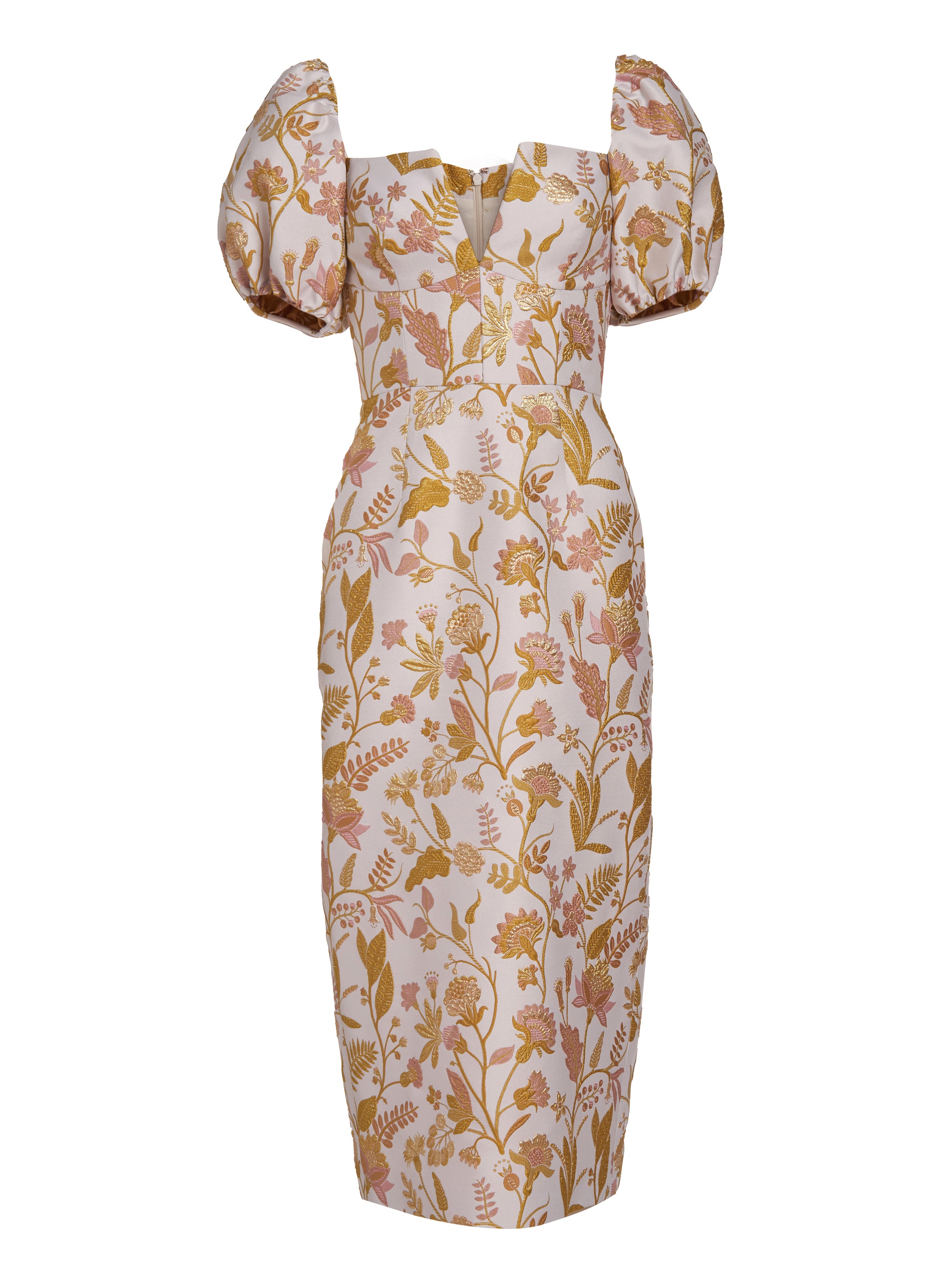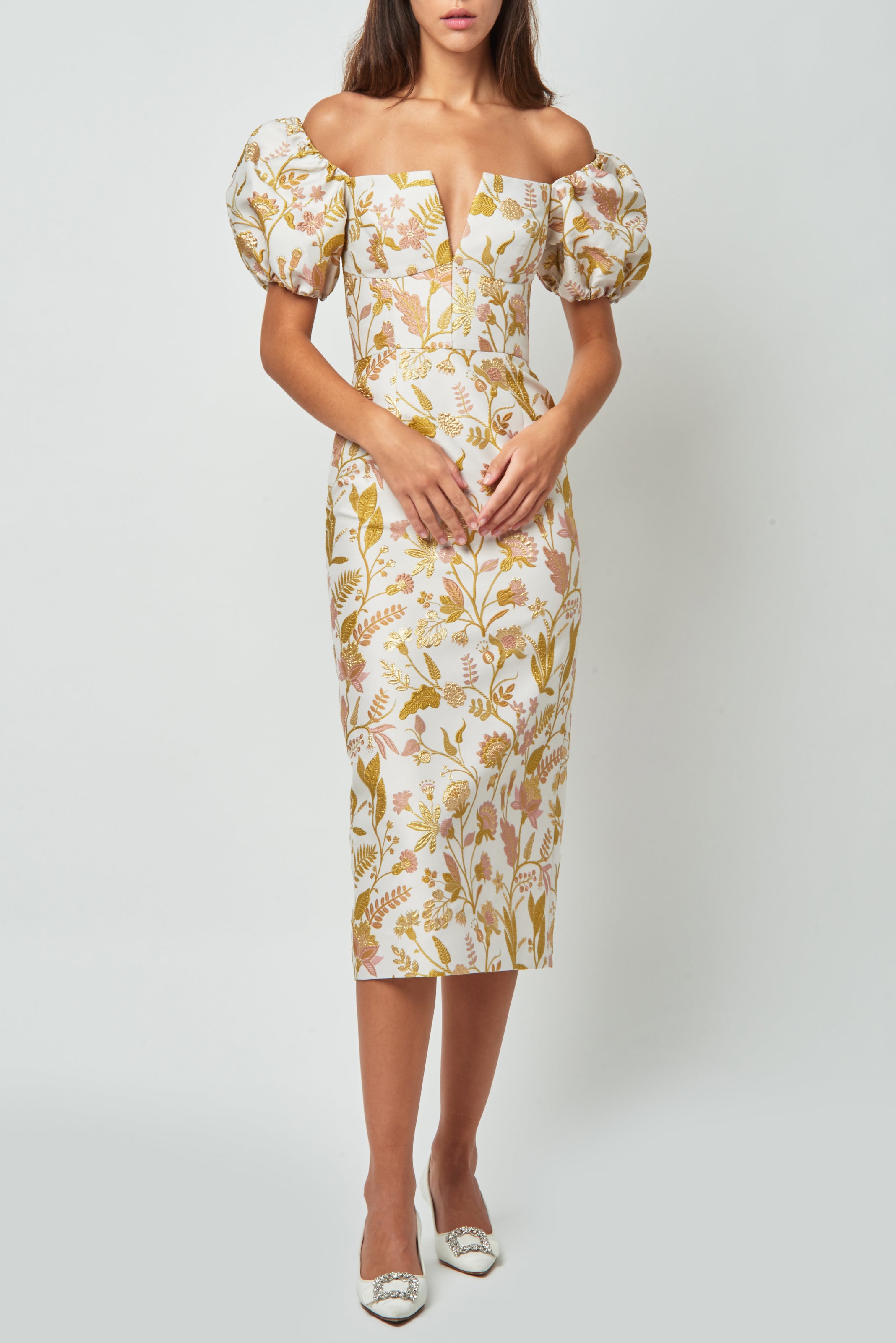 - Floral brocade off-the-shoulder midi dress with split corset bodice, short puff sleeves, column skirt with vent at back hem, fully lined