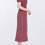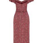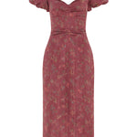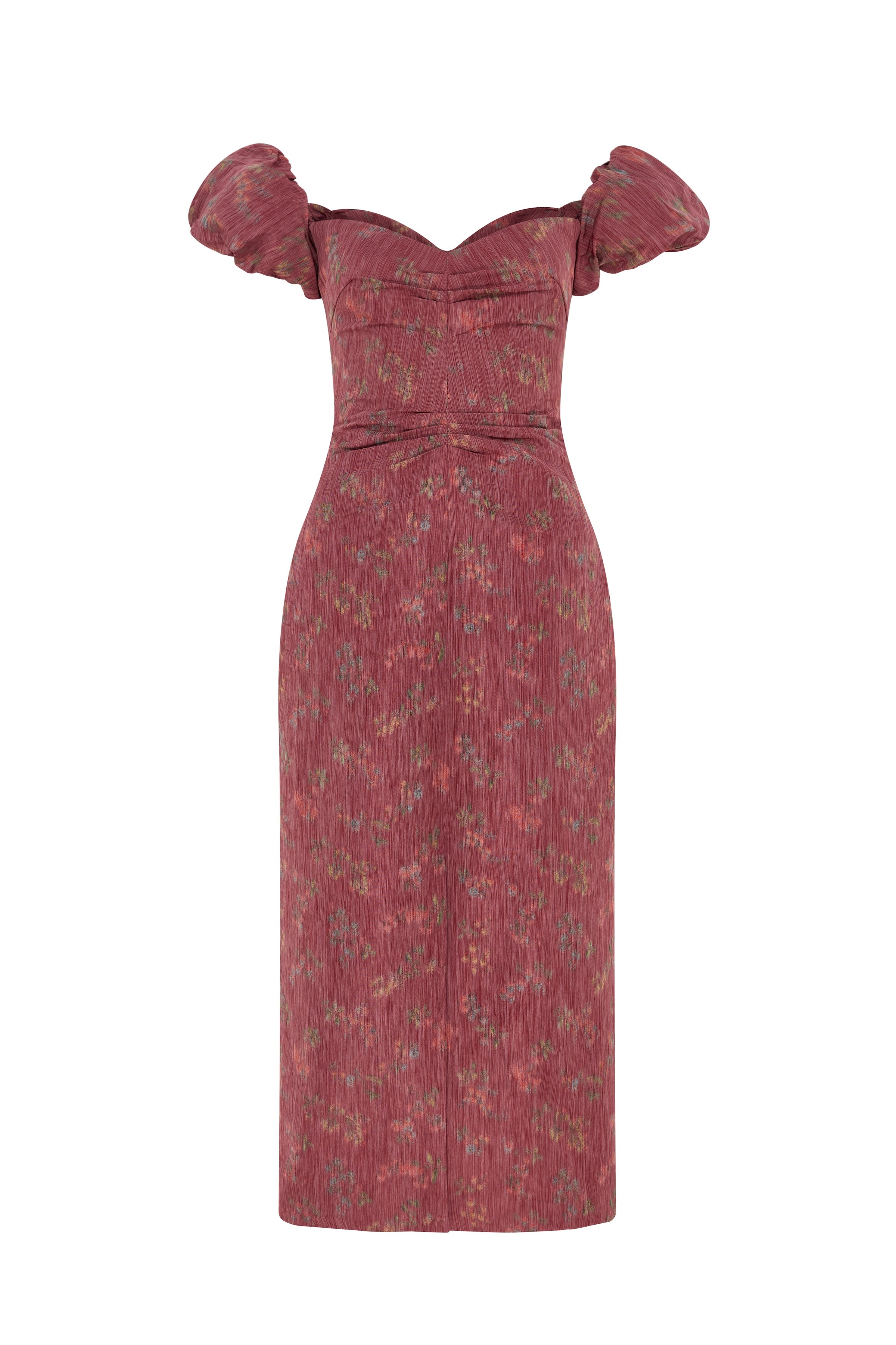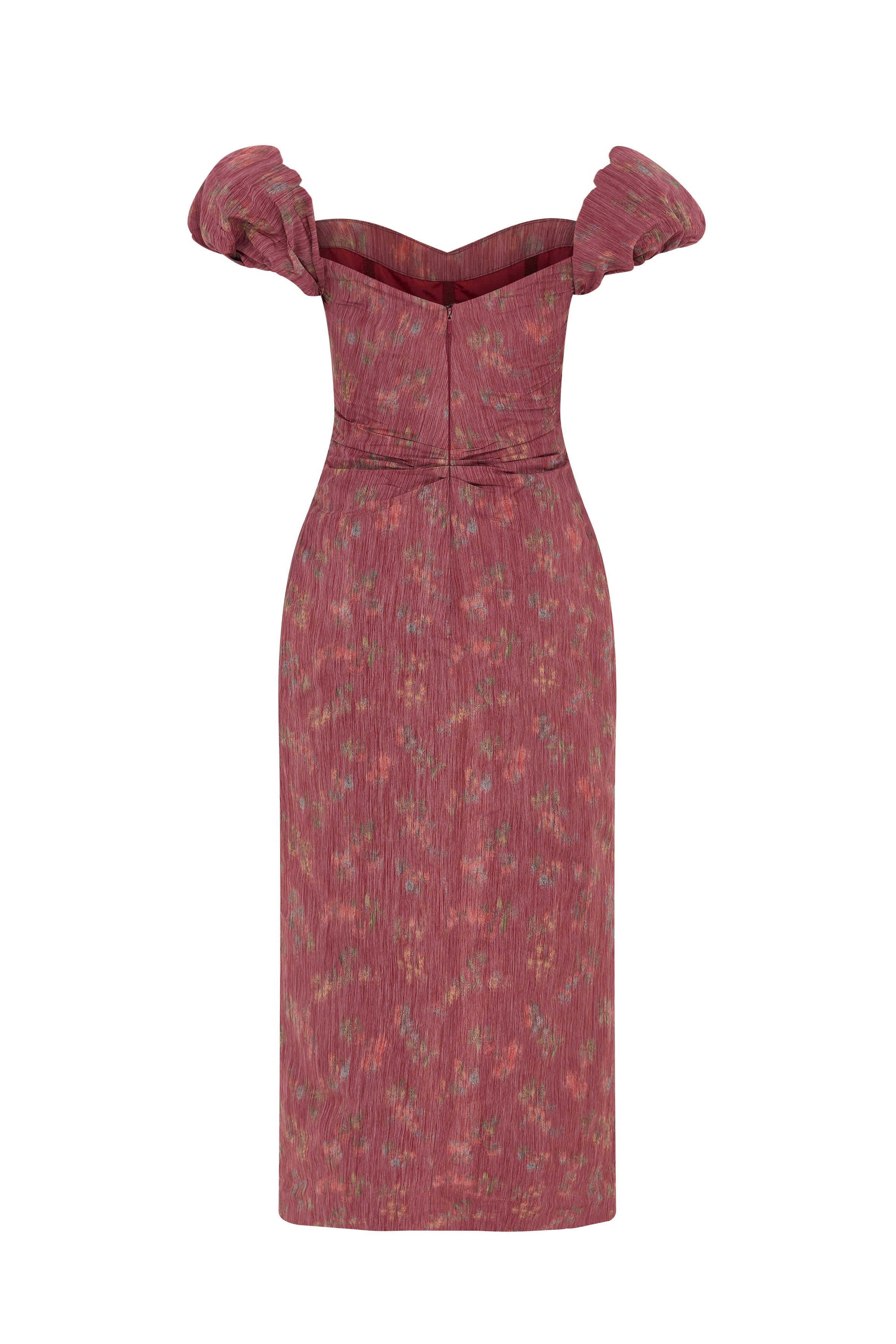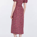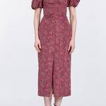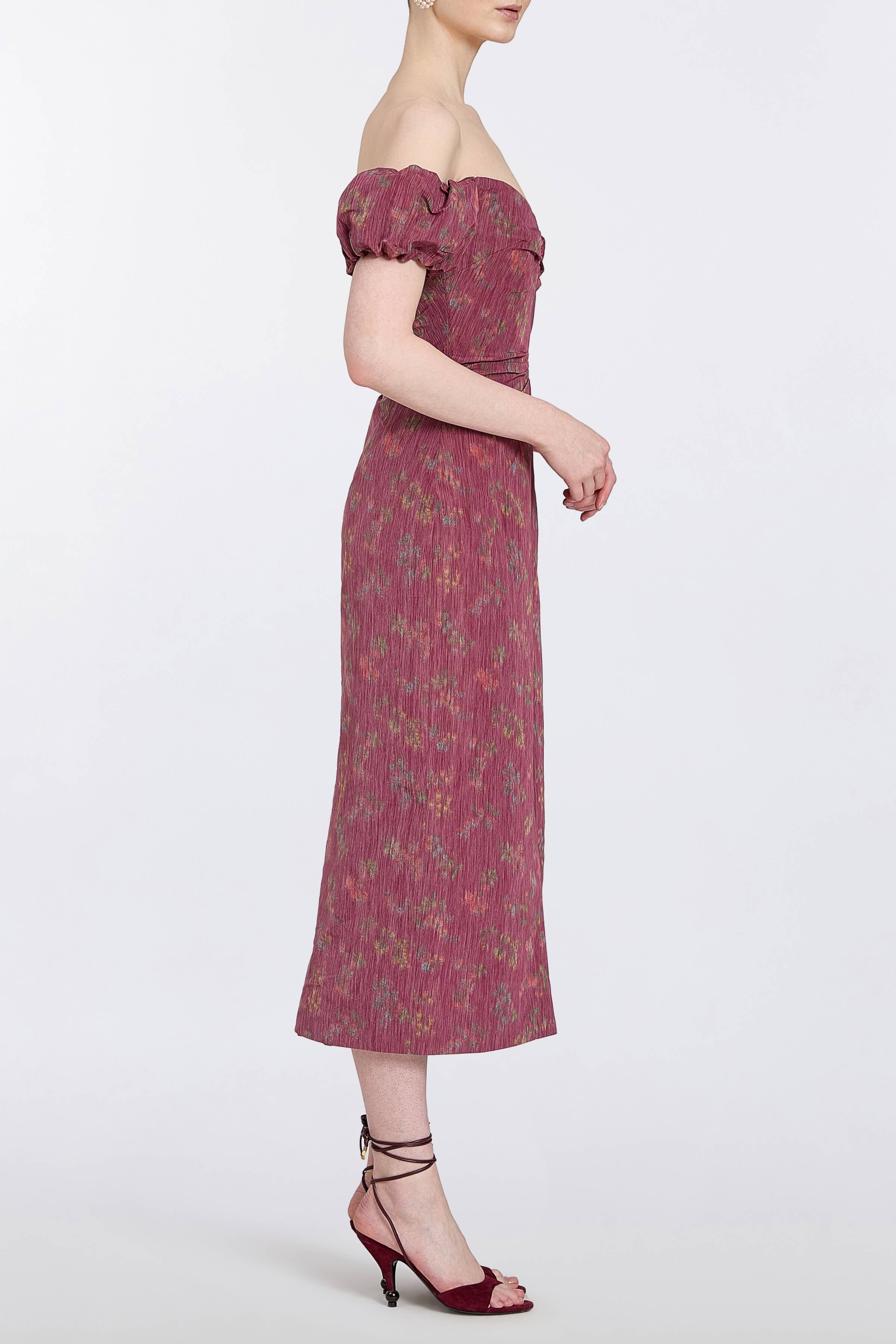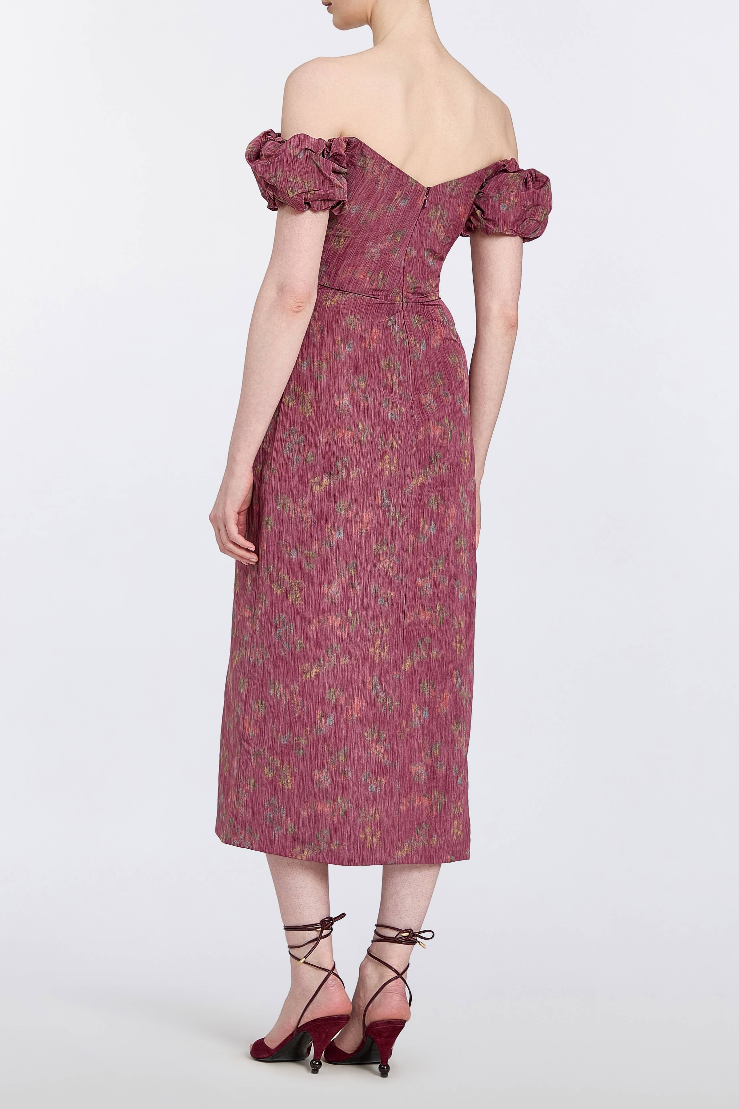- Raspberry floral ikat column midi dress off-the-shoulder puff sleeves and front slit, fully lined