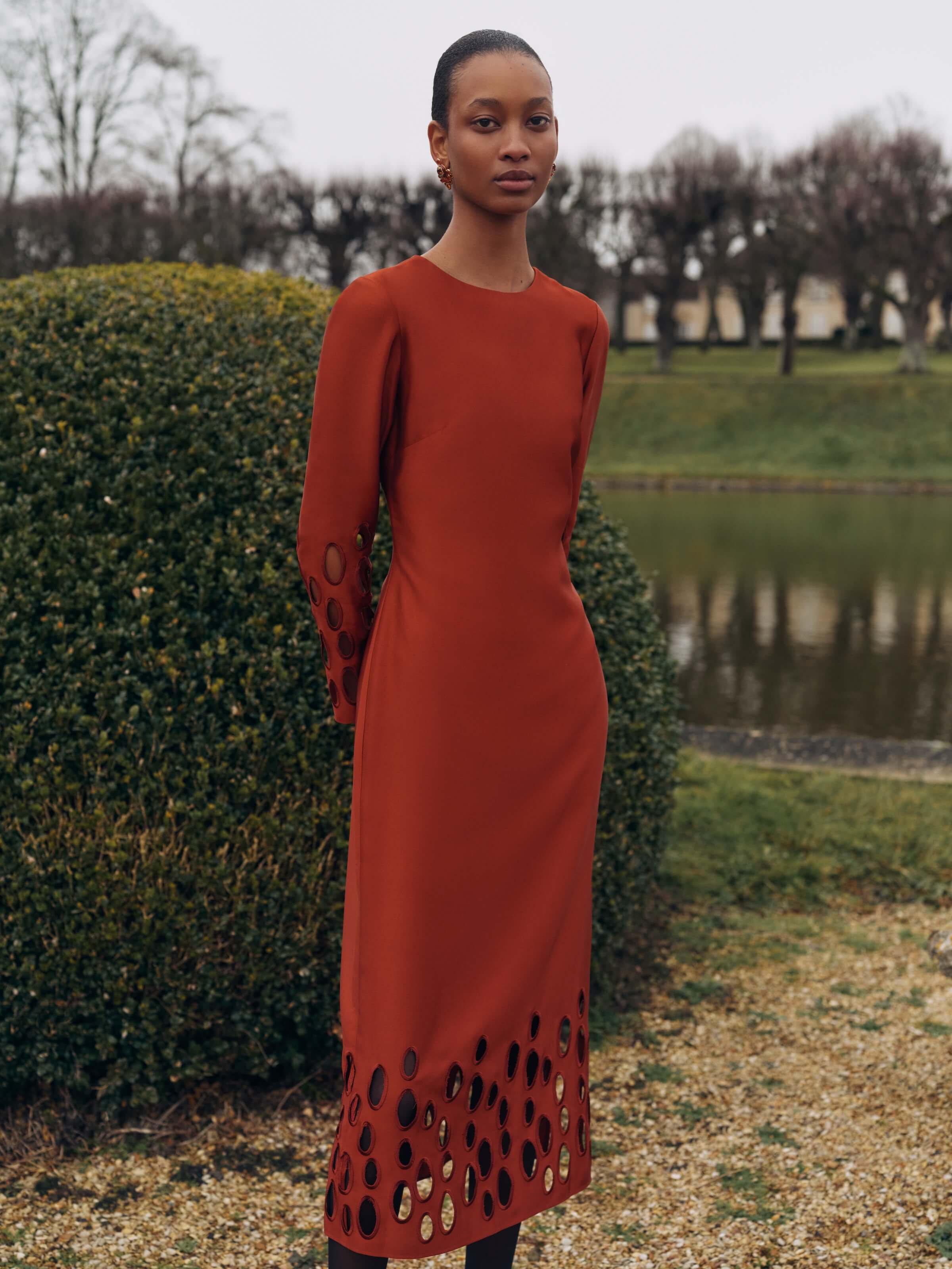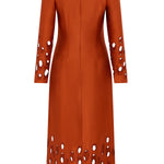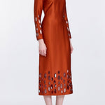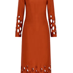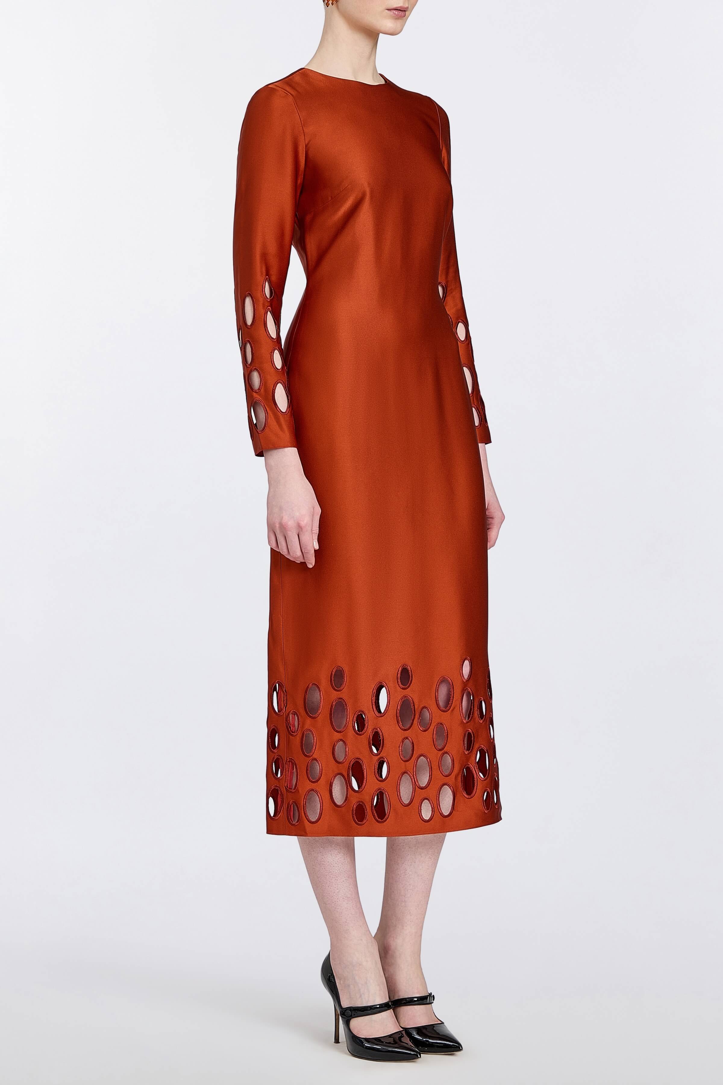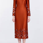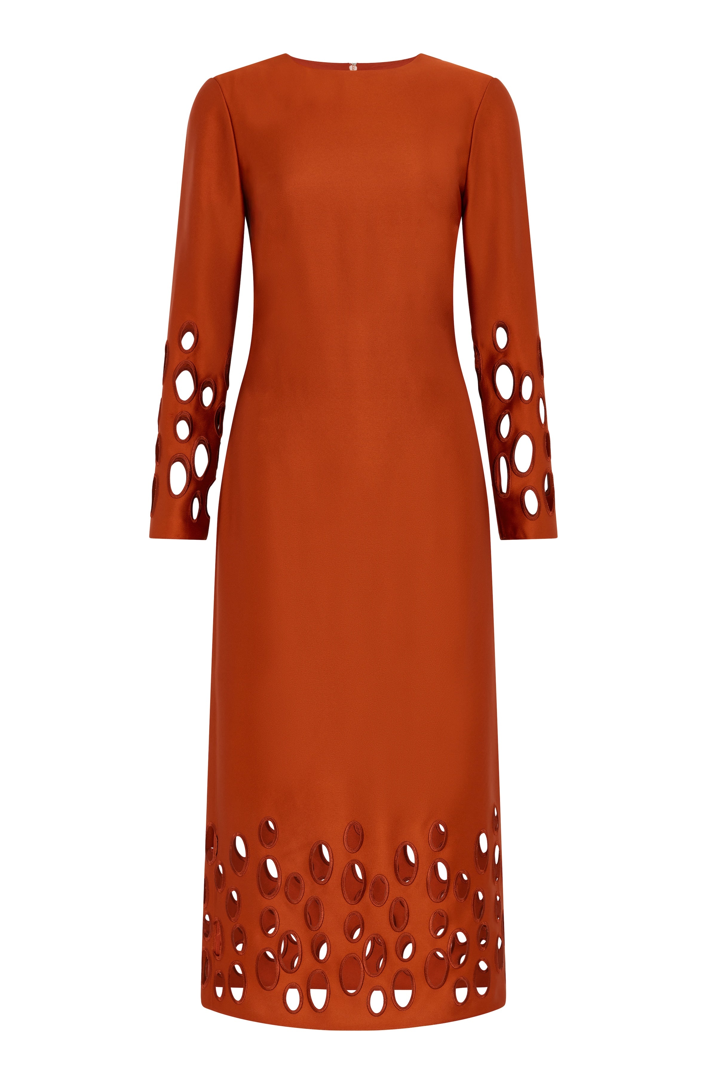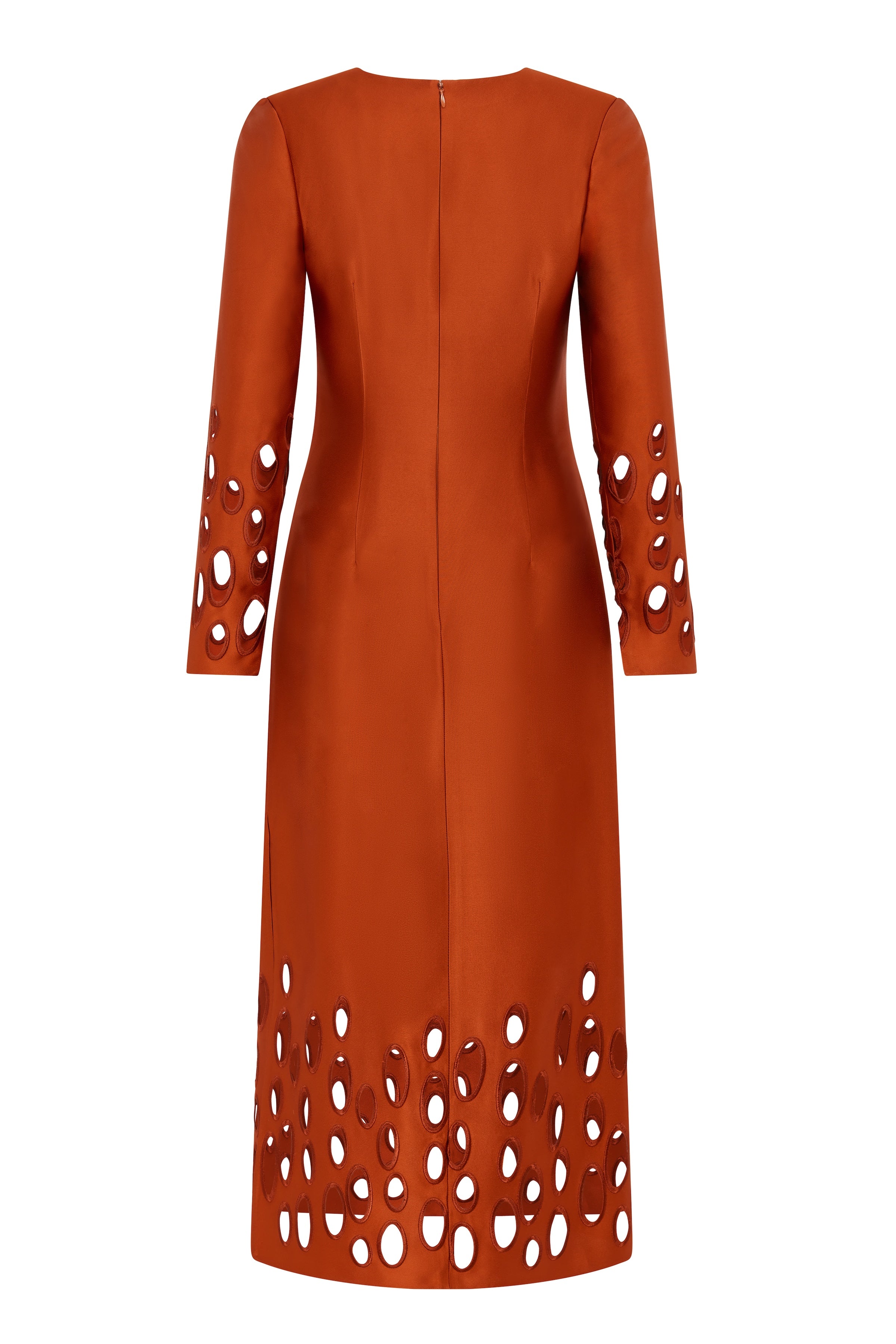 - Rust satin long sleeved midi dress with perforated hem and sleeve cuff, partially lined