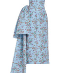 - Blue floral ikat printed strapless column midi dress with draped bodice, internal corset and bow detail, fully lined.