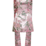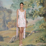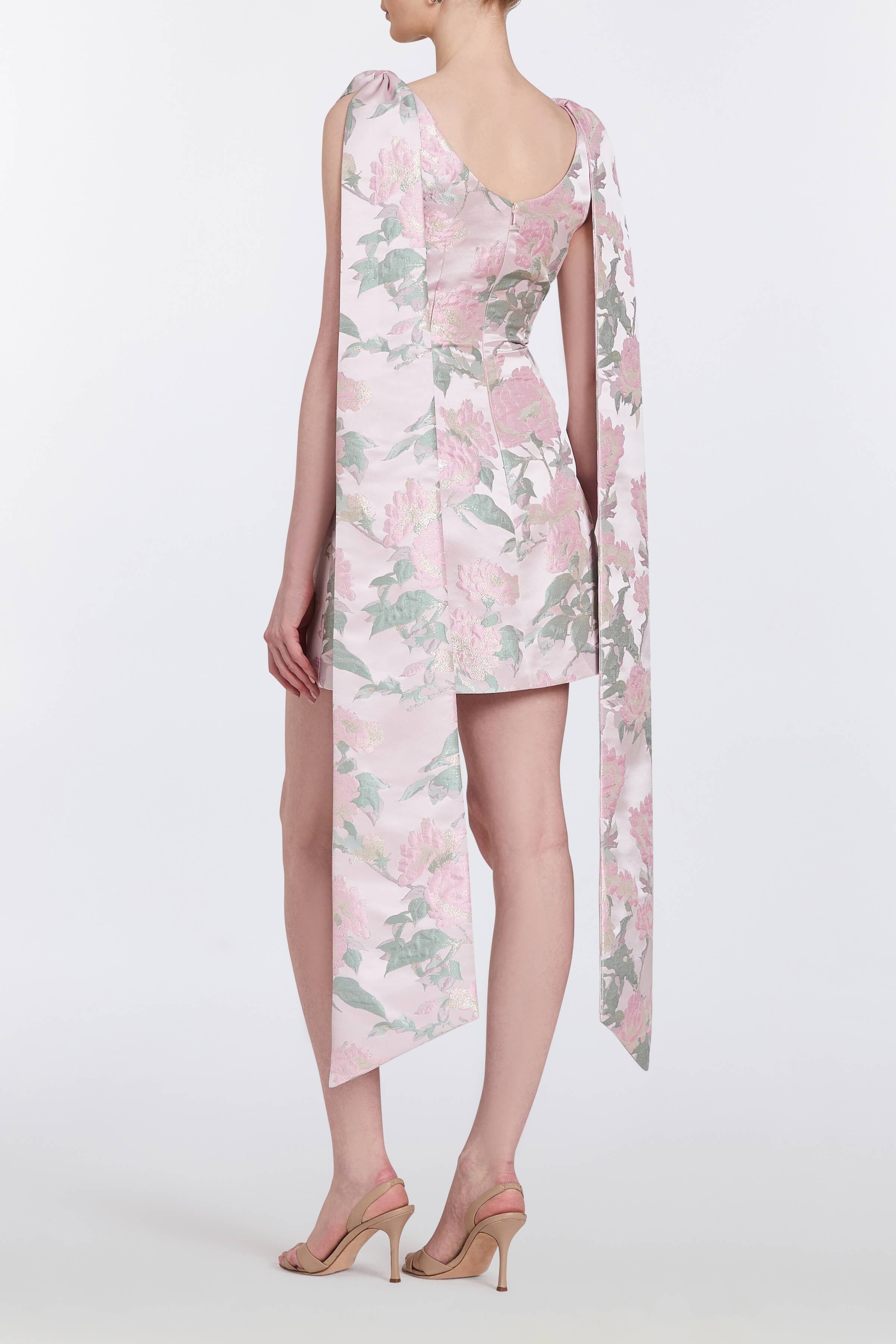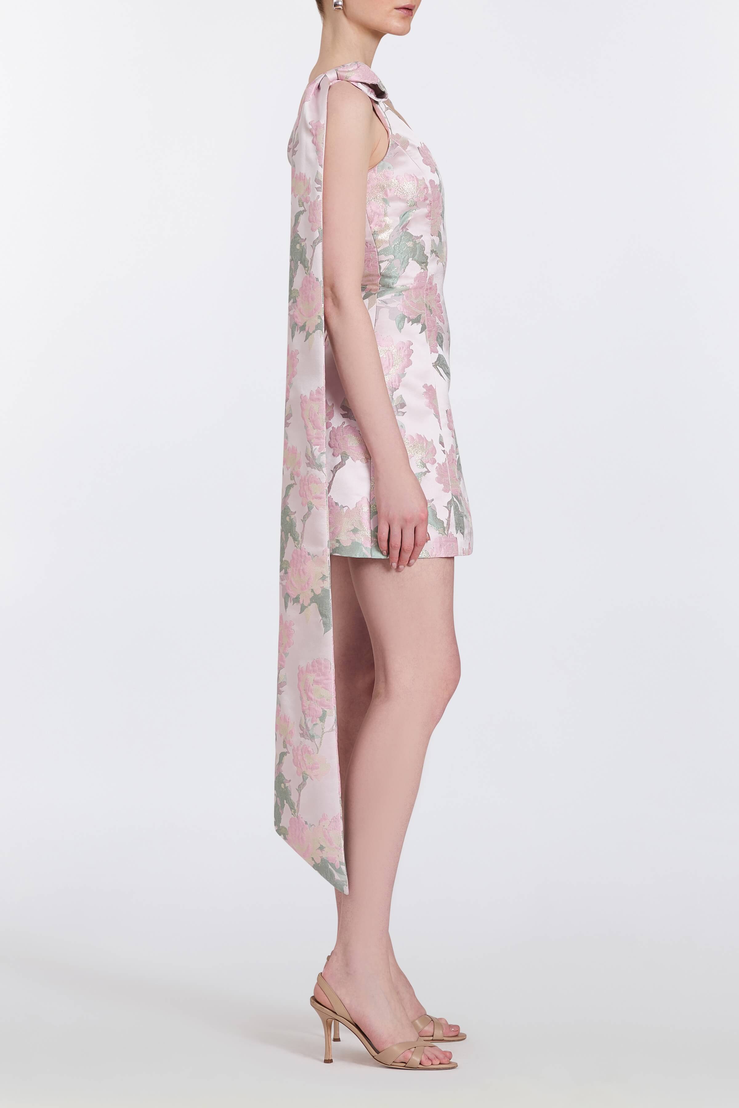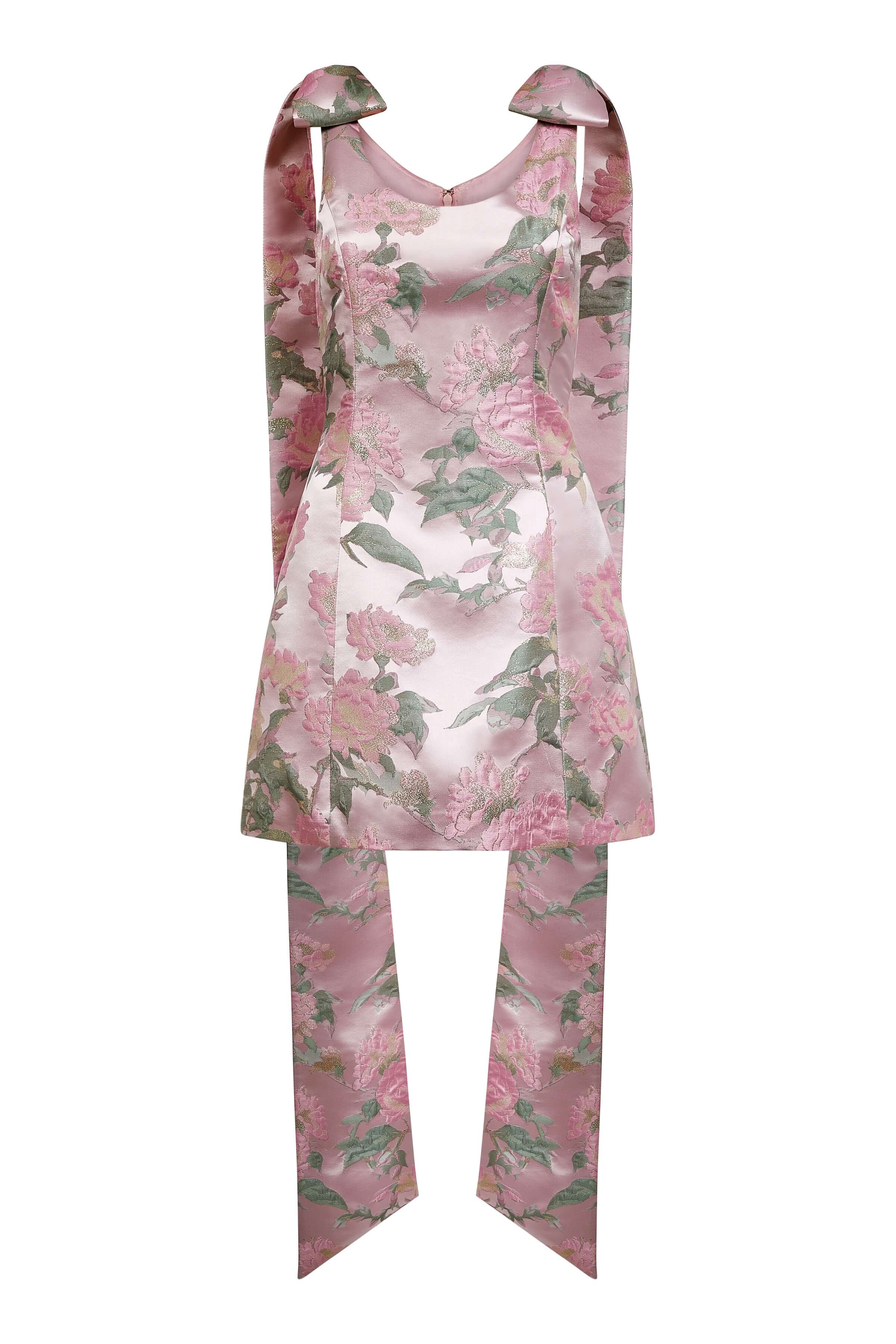 - Light pink metallic floral brocade A-line silhouette mini dress with scooped neckline and matching shoulder bows, fully lined
