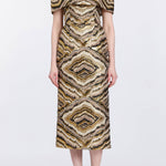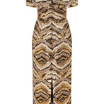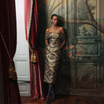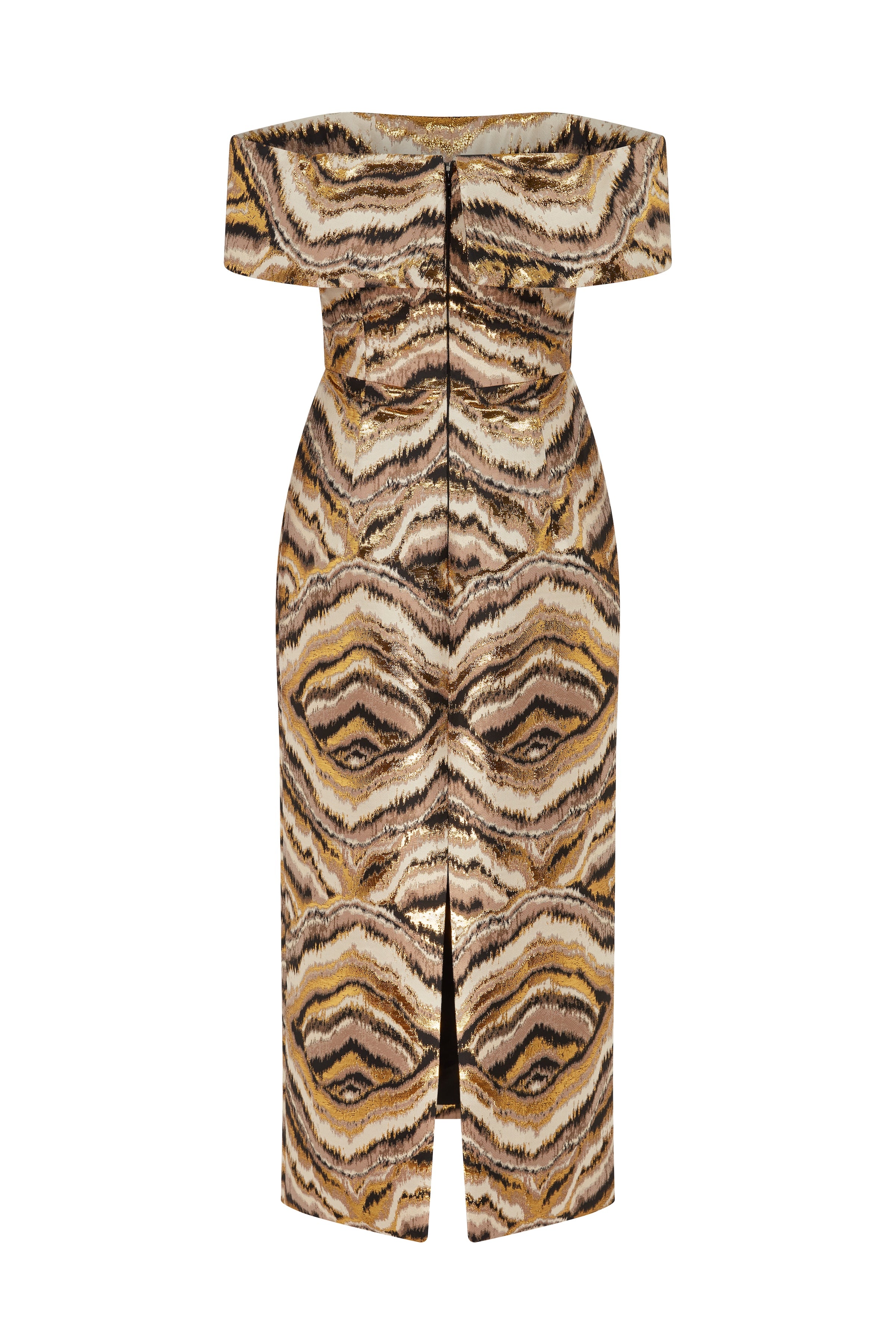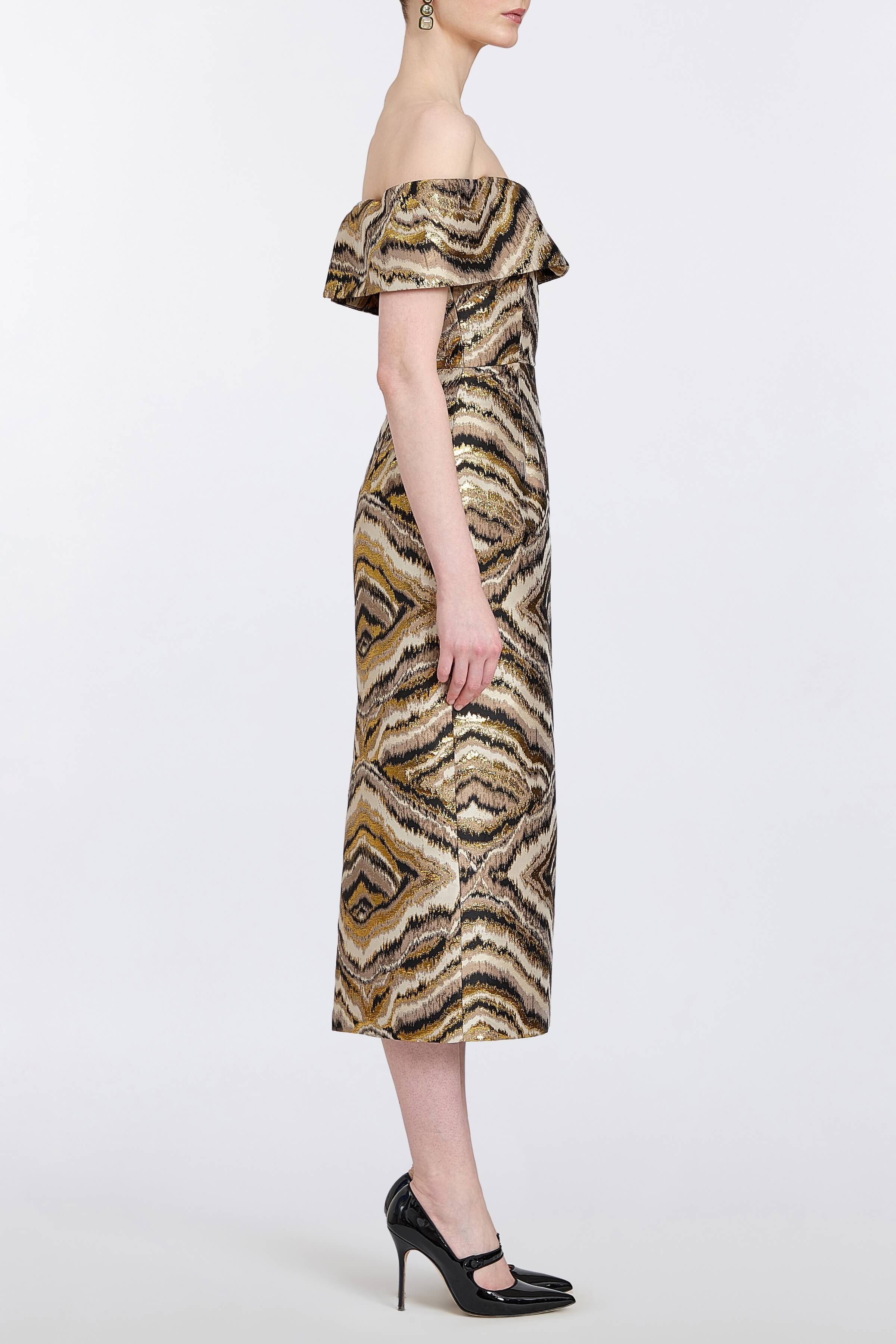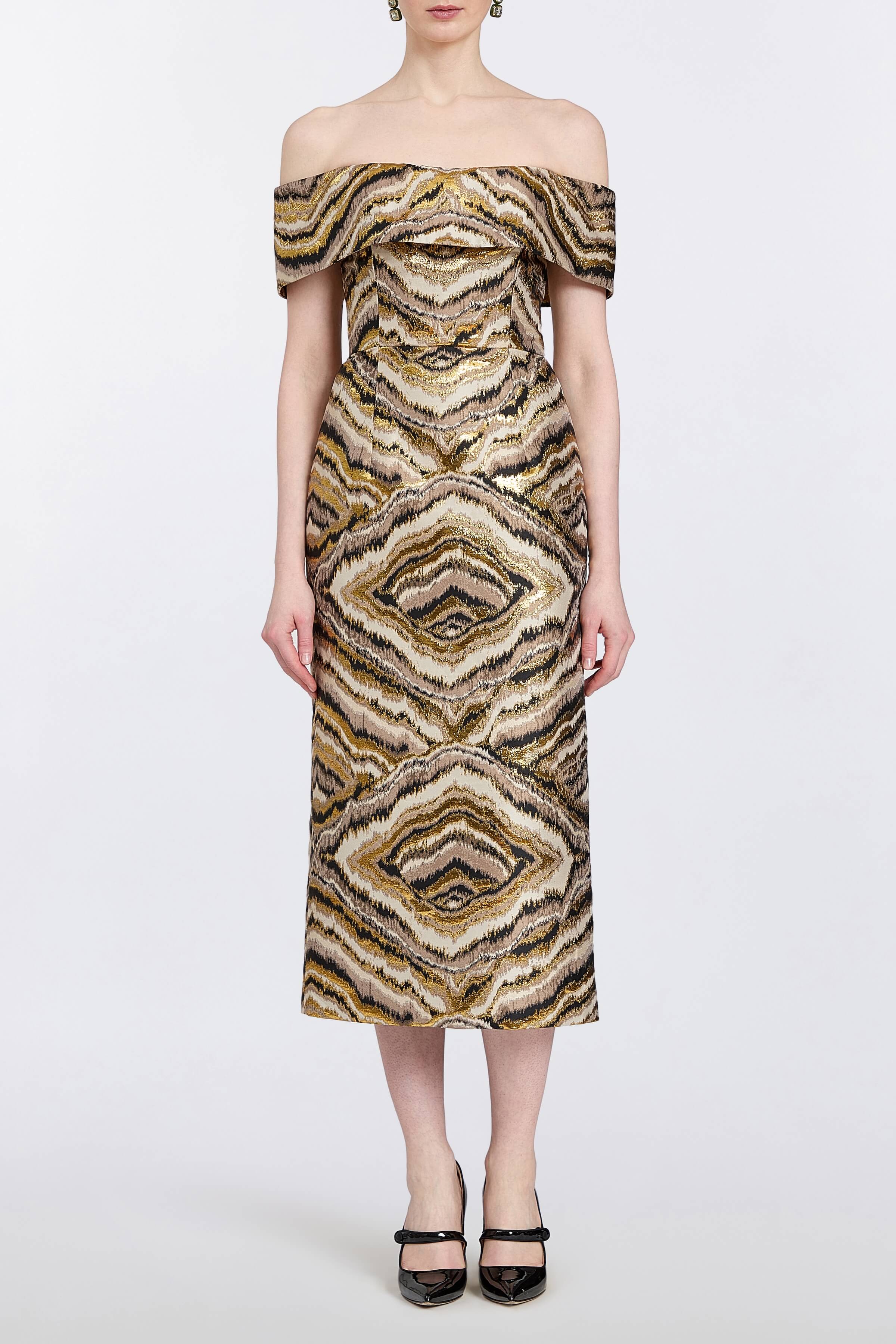 - Metallic black and gold jacquard midi length off-the-shoulder column dress, fully lined
