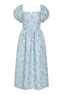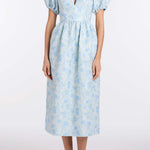 - Cornflower and mint floral brocade v-neck midi dress with puffed sleeves, fully lined