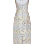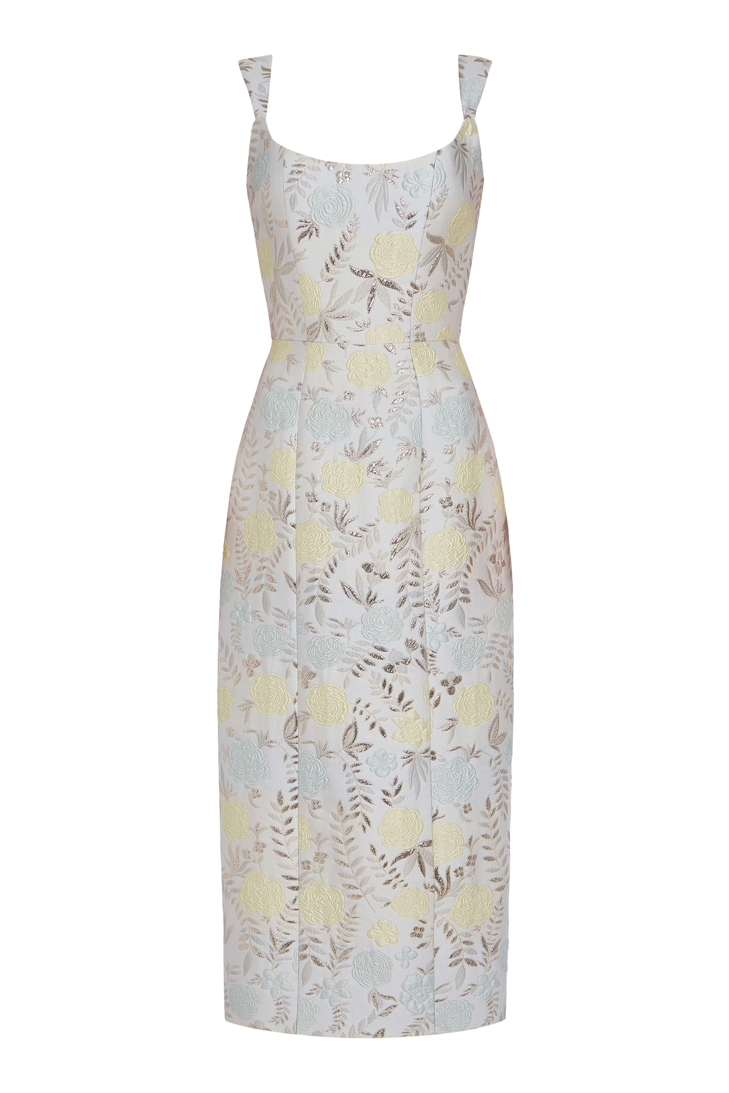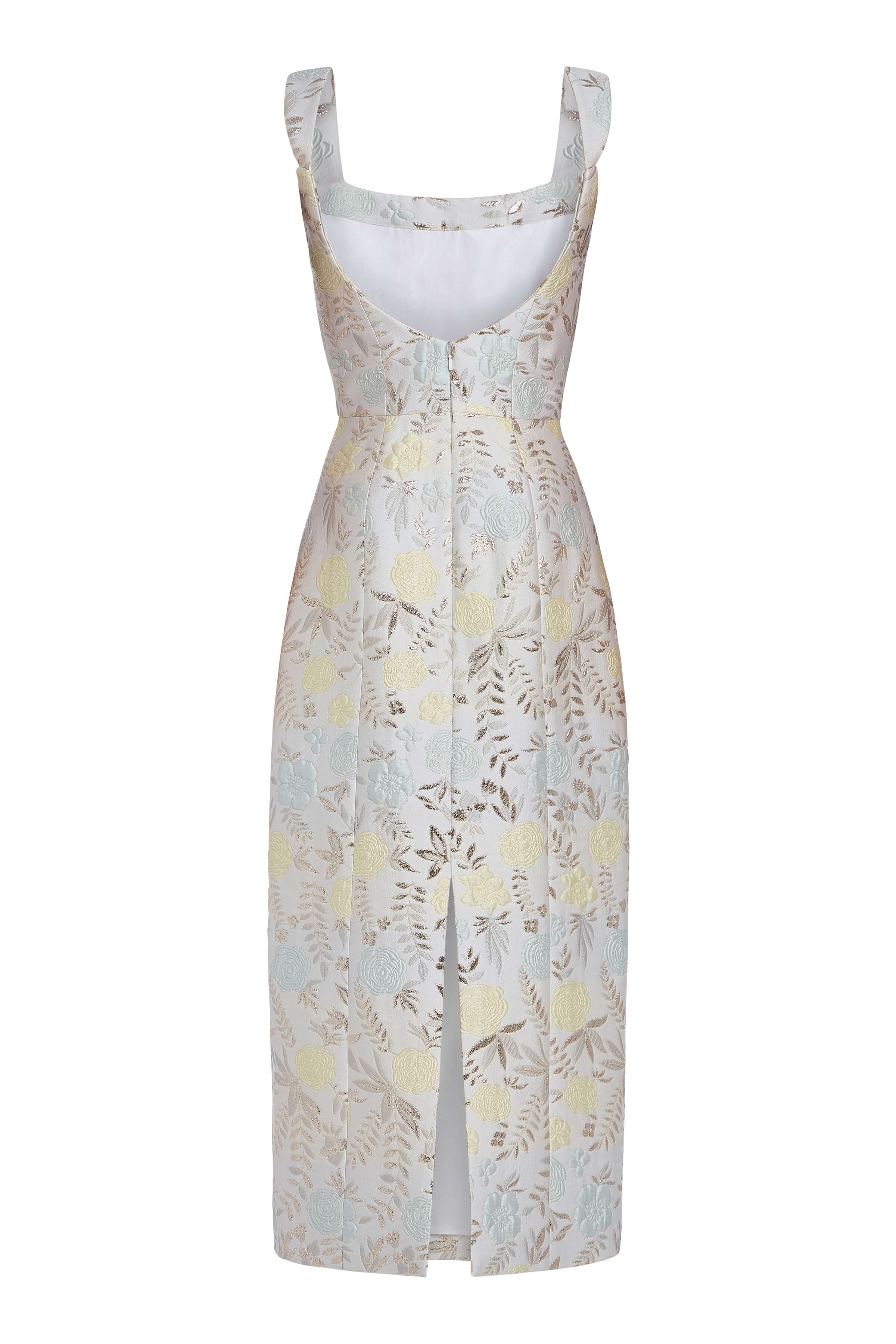 Ivory metallic brocade corset midi dress with scoop back and back slit, fully lined