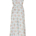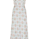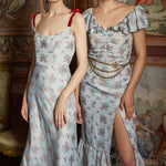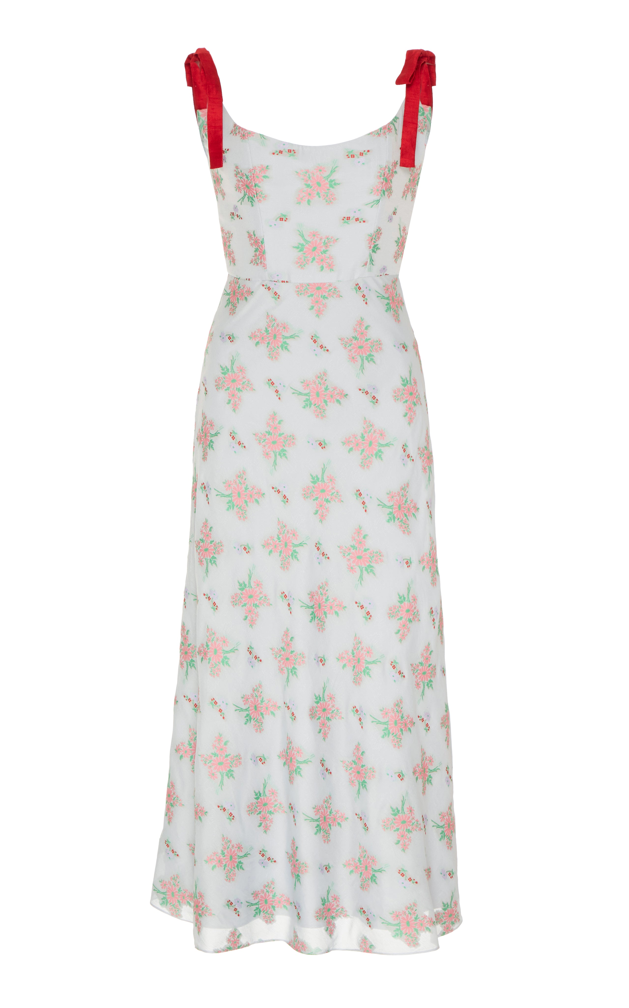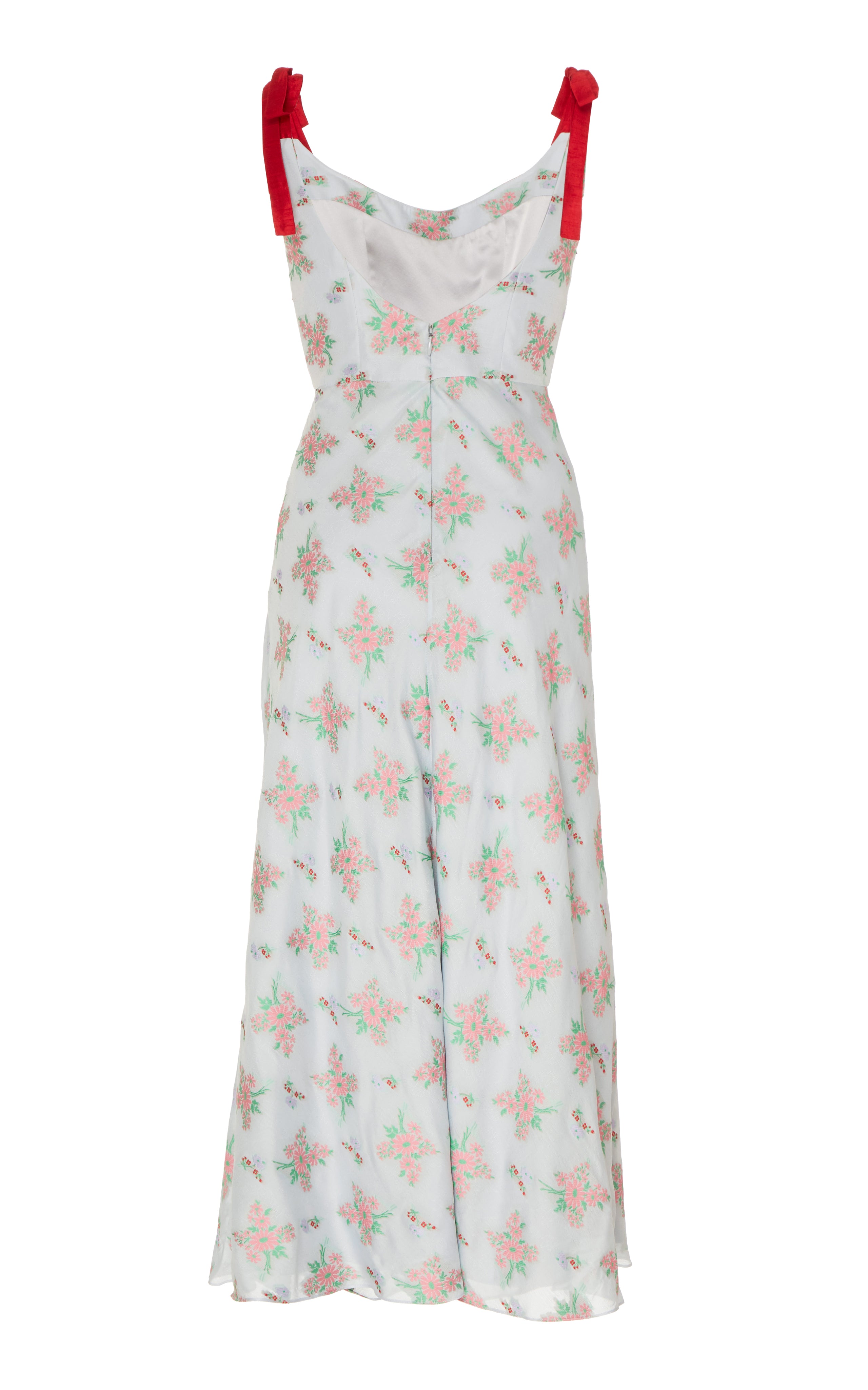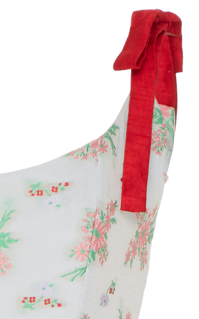 - Blue and pink floral midi dress with red silk dupioni self-tie bow shoulder straps, corset bodice, fully lined