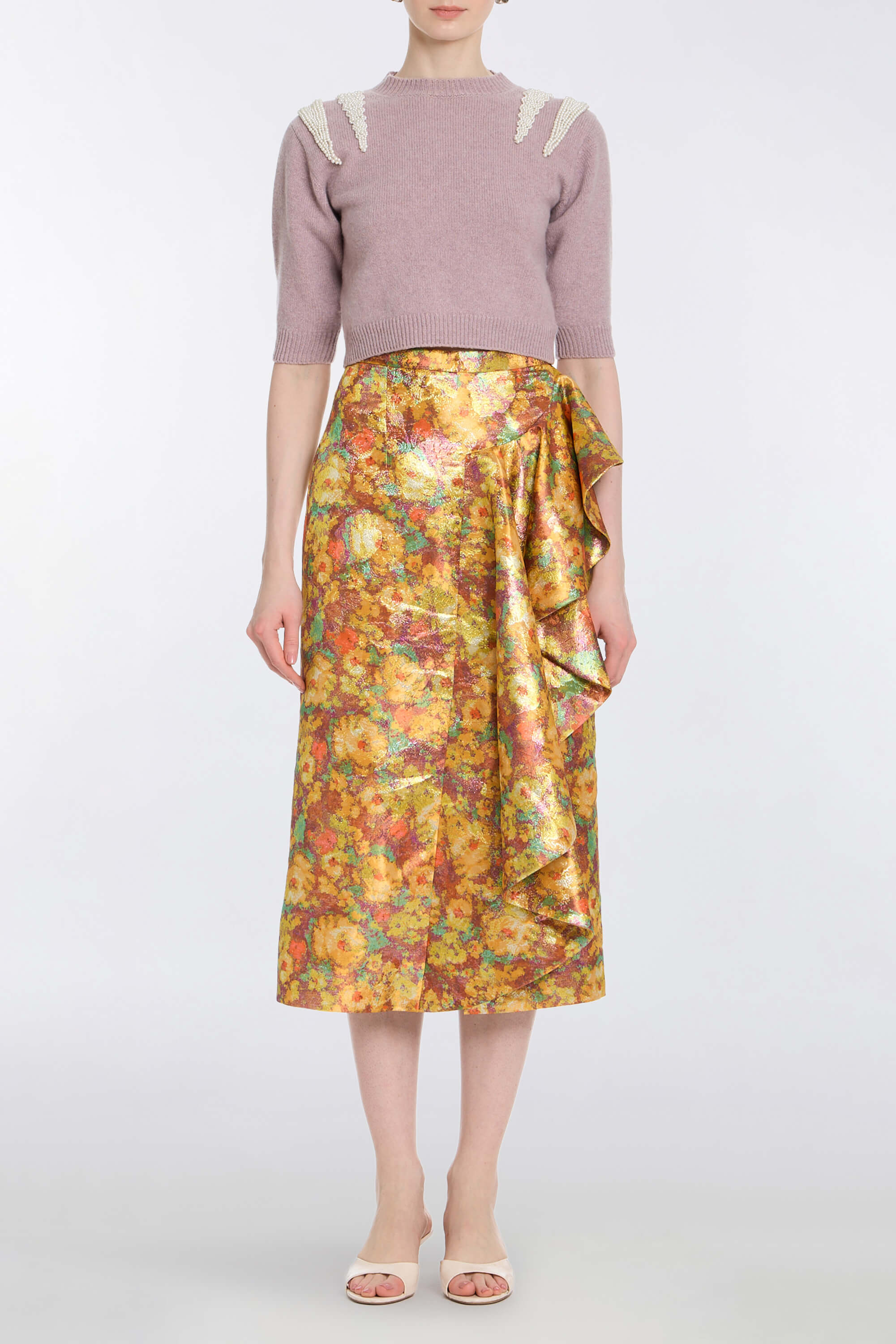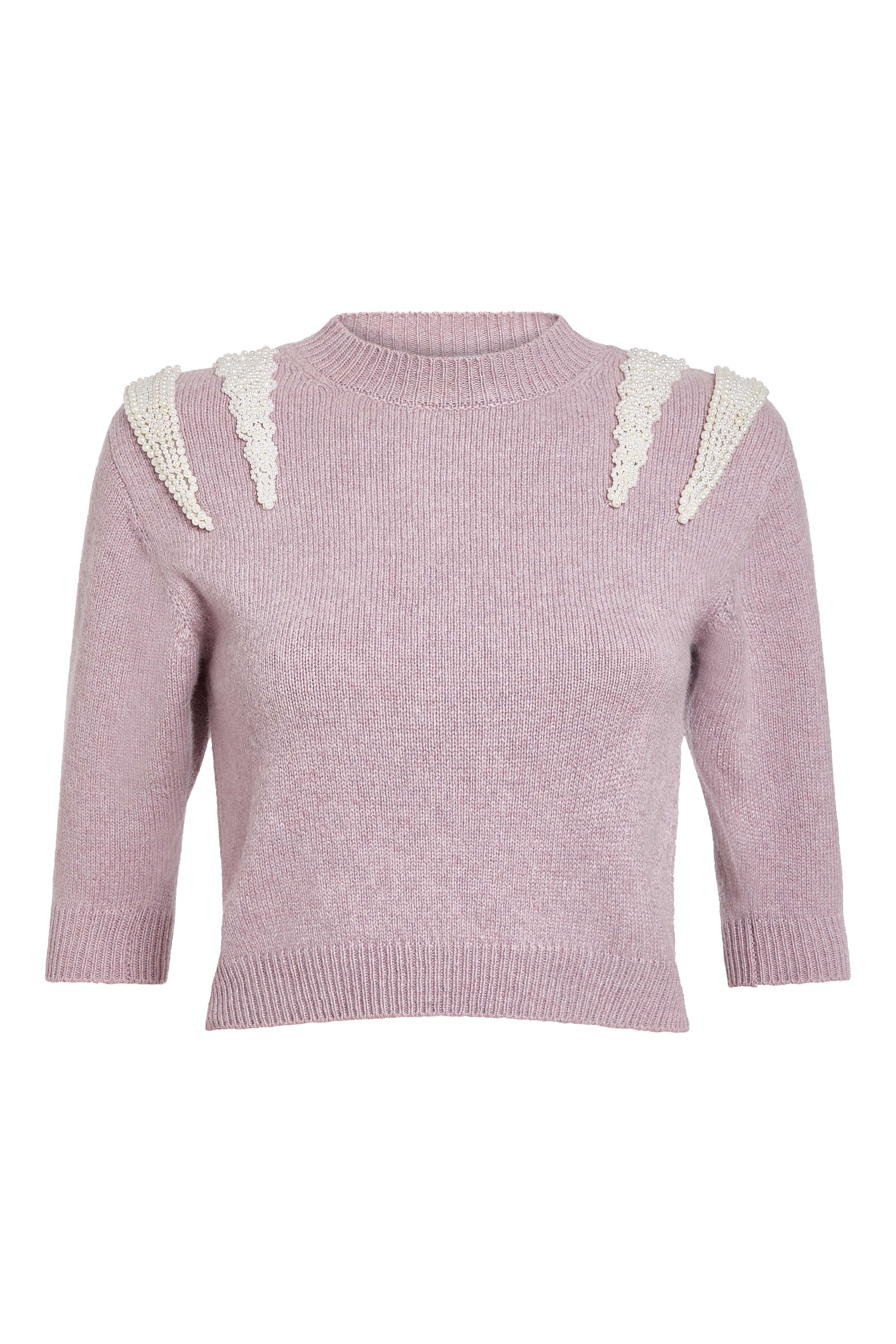- Short sleeve Italian cashmere crewneck sweater with hand beaded pearl patches, unlined