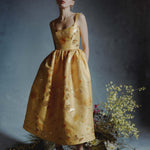 - Yellow floral brocade corset bodice full skirt midi dress with scooped neckline and pockets, fully lined